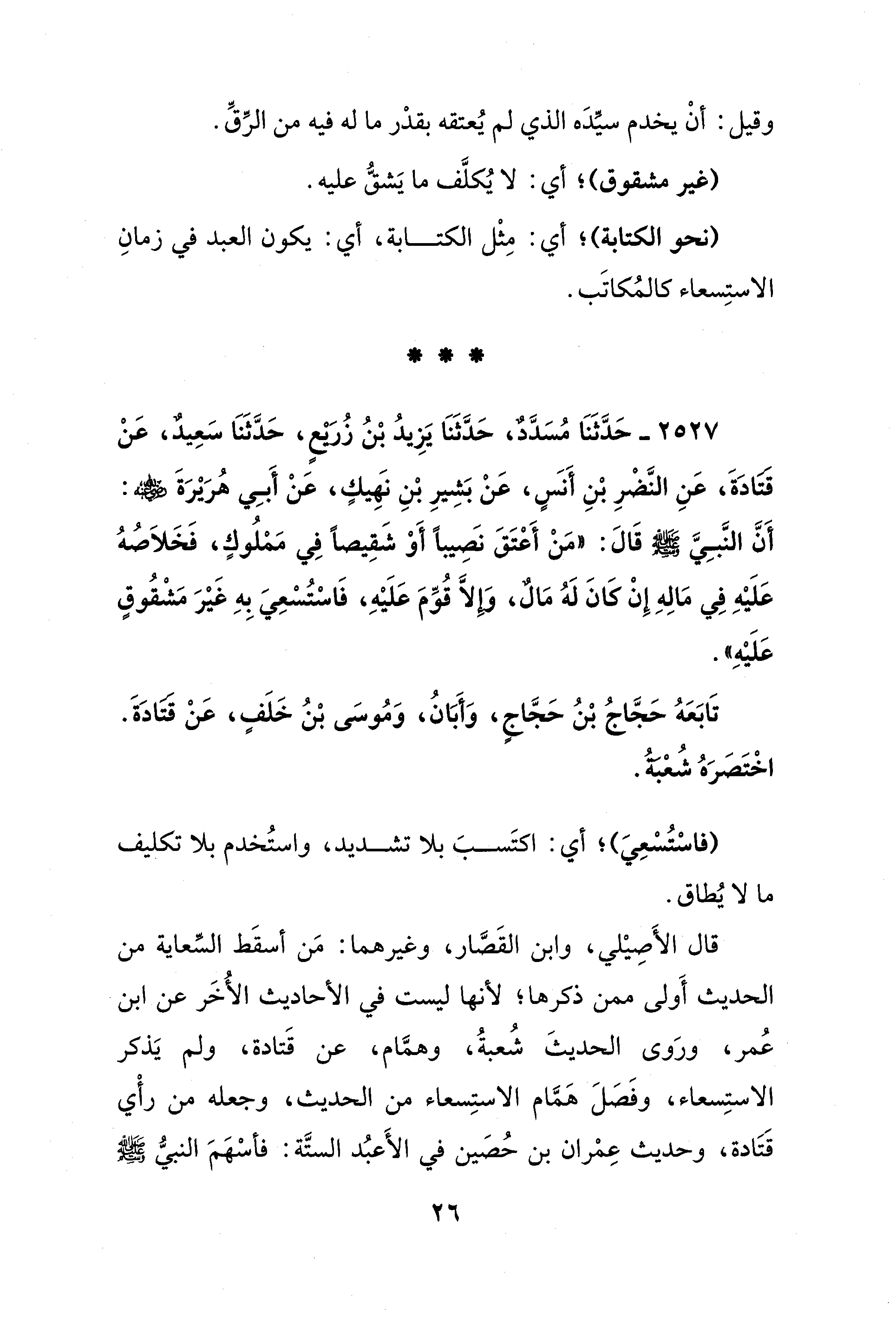 2527 - حَدَّثَنَا مُسَدَّدٌ، حَدَّثَنَا يَزِيدُ بْنُ زُريعٍ، حَدَّثَنَا سَعِيد، عَنْ قتادَةَ، عَنِ النَّضْرِ بْنِ أَنسٍ، عَنْ بَشِيرِ بْنِ نهِيكٍ، عَنْ أَبِي هُرَيْرَةَ - رضي الله عنه -: أَنَّ النَّبِيَّ - صلى الله عليه وسلم - قَالَ: "مَنْ أَعْتَقَ نَصِيبًا أَوْ شَقِيصًا فِي مَمْلُوكٍ، فَخَلاَصُهُ عَلَيْهِ فِي مَالِهِ إِنْ كَانَ لَهُ مَالٌ، وإلَّا قُوِّمَ عَلَيْهِ، فَاسْتُسْعِيَ بِهِ غيْرَ مَشْقُوقٍ عَلَيْهِ".