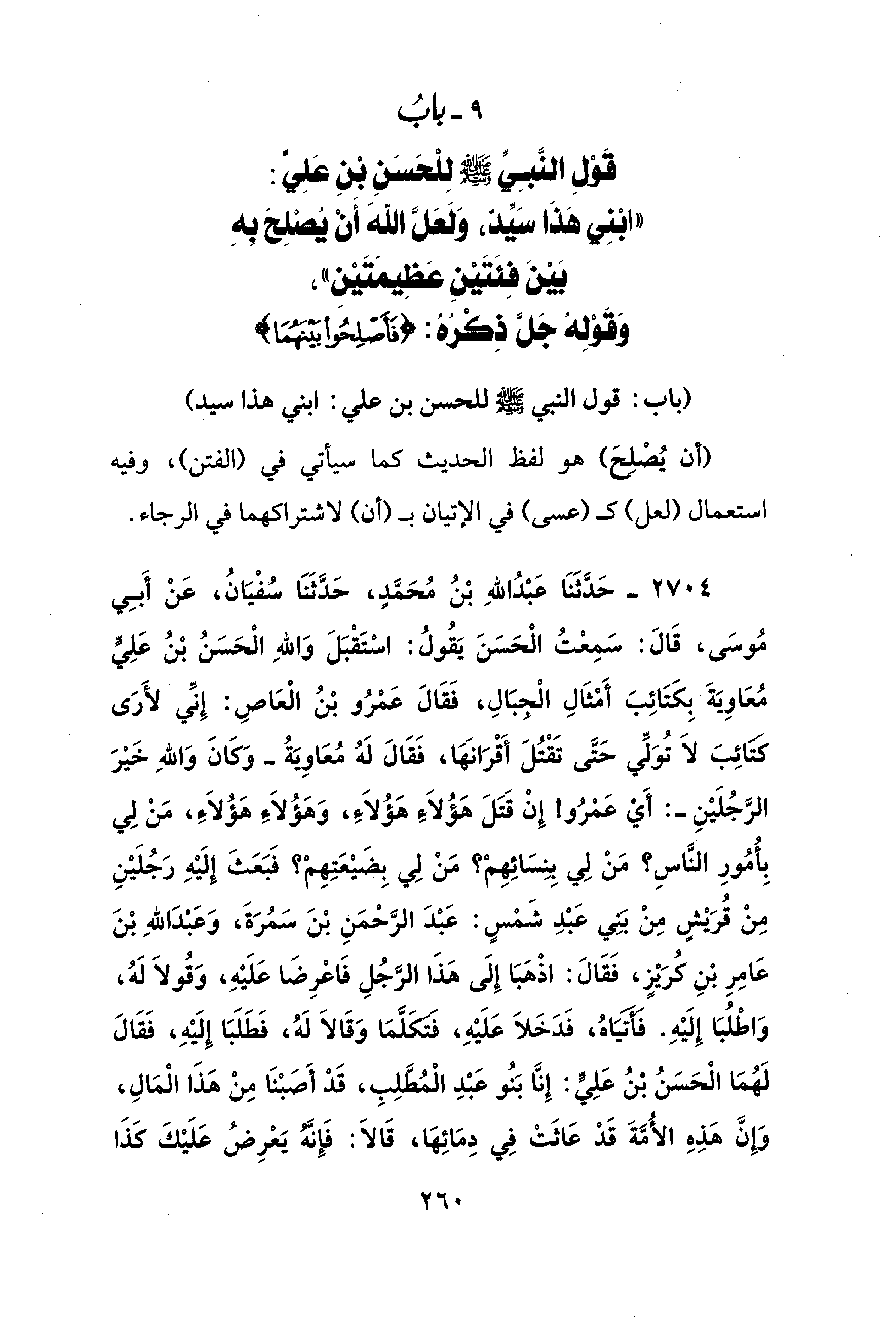 9 - بابُ قَوْلِ النَّبِيِّ - صلى الله عليه وسلم - لِلْحَسَنِ بن عَلِيّ: "ابْنِي هَذَا سيِّد، وَلَعَلَّ اللهَ أَنْ يُصْلِحَ بهِ بَيْنَ فِئَتَيْنِ عَظِيمَتَيْن"، وَقولِه جَلَّ ذِكرهُ: {فَأَصْلِحُوا بَيْنَهُمَا}