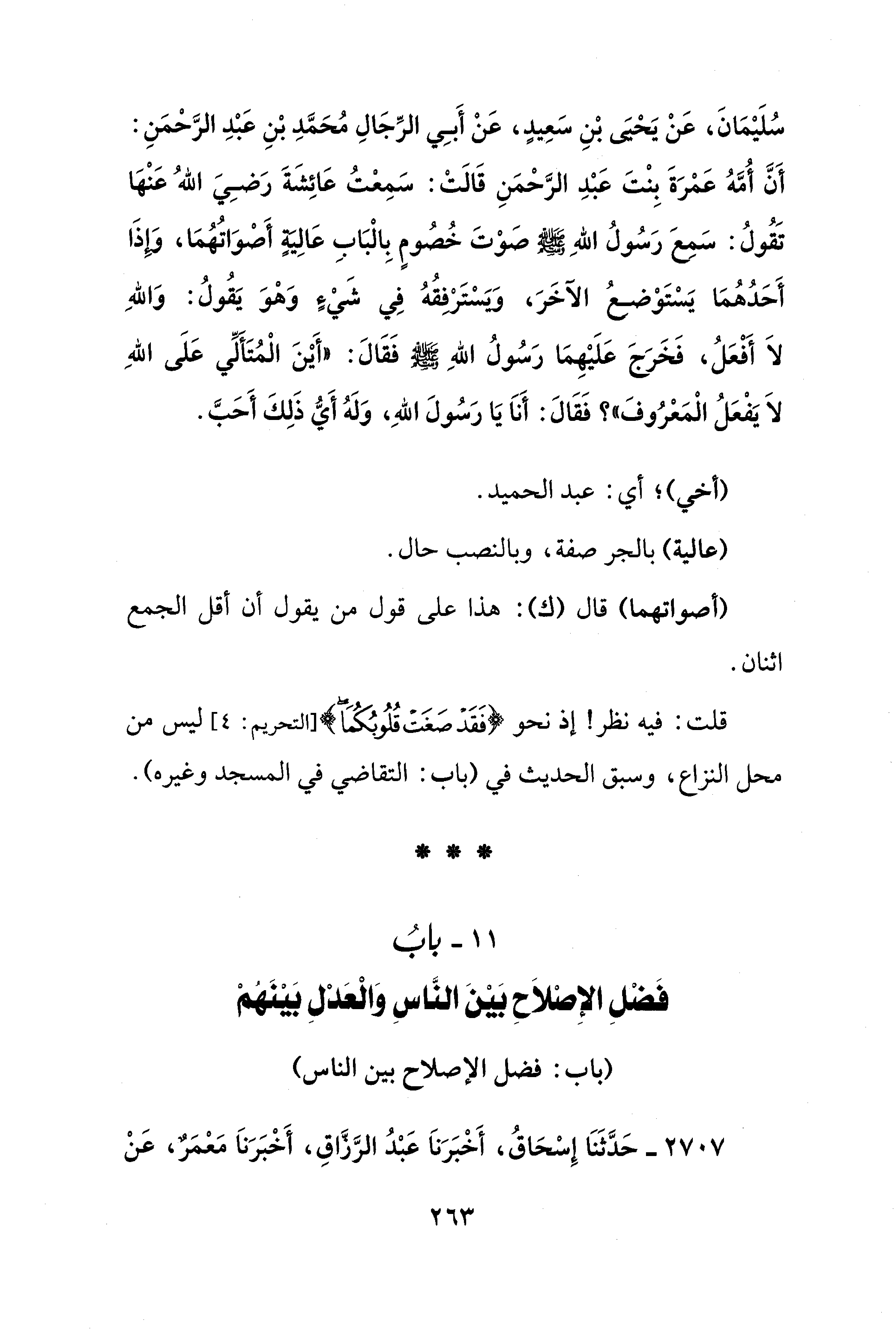 سُلَيْمَانَ، عَنْ يَحْيَى بْنِ سَعِيدٍ، عَنْ أَبِي الرِّجَالِ مُحَمَّدِ بْنِ عَبْدِ الرَّحْمَنِ: أَنَّ أُمَّهُ عَمْرَةَ بِنْتَ عَبْدِ الرَّحْمَنِ قَالَتْ: سَمِعْتُ عَائِشَةَ رَضِيَ اللهُ عَنْهَا تَقُولُ: سَمِعَ رَسُولُ اللهِ - صلى الله عليه وسلم - صَوْتَ خُصُومٍ بِالْبَابِ عَالِيةٍ أَصْوَاتُهُمَا، وَإِذَا أَحَدُهُمَا يَسْتَوْضعُ الآخَرَ، ويسترْفِقُهُ فِي شَيْءٍ وَهْوَ يَقُولُ: وَاللهِ لاَ أَفْعَلُ، فَخَرَجَ عَلَيْهِمَا رَسُولُ اللهِ - صلى الله عليه وسلم - فَقَالَ: "أَيْنَ الْمُتَأَلِّي عَلَى اللهِ لاَ يَفْعَلُ الْمَعْرُوفَ"؟ فَقَالَ: أَناَ يَا رَسُولَ اللهِ، وَلَهُ أَيُّ ذَلِكَ أَحَبَّ.