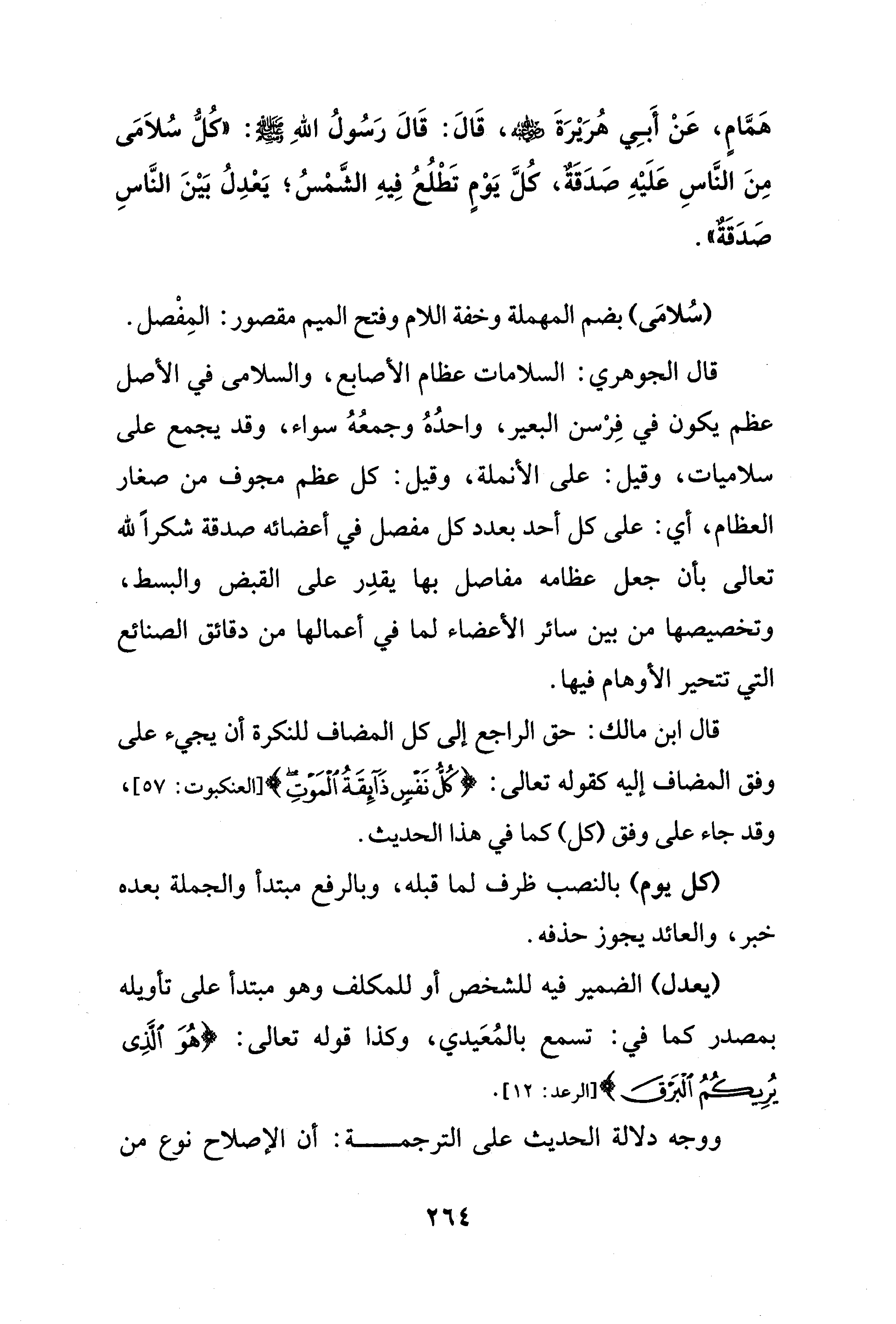 هَمَّامٍ، عَنْ أَبِي هُرَيرَةَ - رضي الله عنه -، قَالَ: قَالَ رَسُولُ اللهِ - صلى الله عليه وسلم -: "كُلُّ سُلاَمَى مِنَ النَّاسِ عَلَيْهِ صَدَقَةٌ، كُلَّ يَوْمٍ تَطْلُعُ فِيهِ الشَّمْسُ؛ يَعْدِلُ بَيْنَ النَّاسِ صَدَقَةٌ".