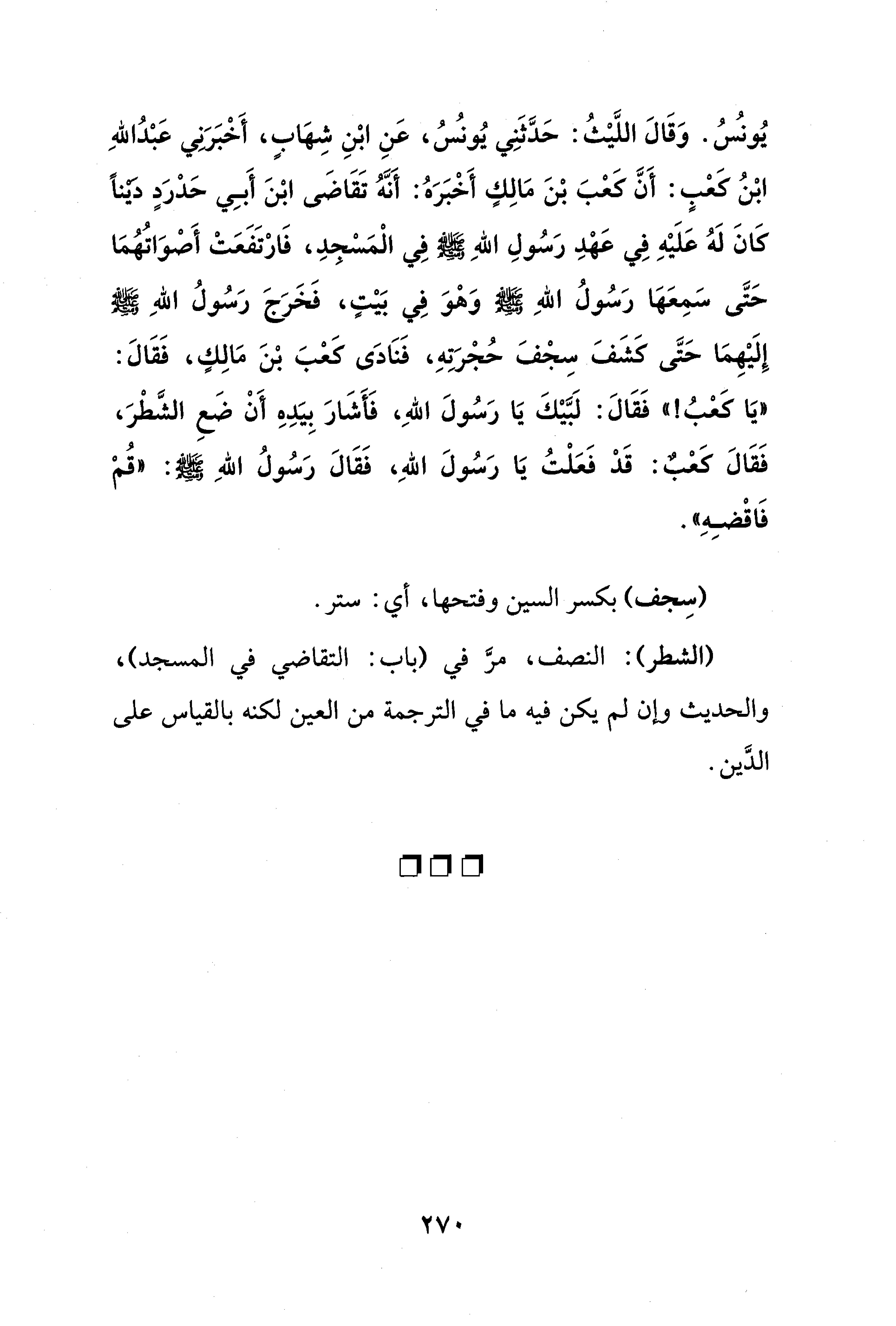 يُونُسُ. وَقَالَ اللَّيْثُ: حَدَّثَنِي يُونُسُ، عَنِ ابْنِ شِهَابٍ، أَخْبَرَني عَبْدُ اللهِ ابْنُ كعْبٍ: أَنَّ كعْبَ بْنَ مَالِكٍ أَخْبَرَهُ: أَنَّهُ تَقَاضَى ابْنَ أَبِي حَدْرَدٍ دَيْنًا كَانَ لَهُ عَلَيْهِ فِي عَهْدِ رَسُولِ اللهِ - صلى الله عليه وسلم - فِي الْمَسْجدِ، فَارْتَفَعَتْ أَصْوَاتُهُمَا حَتَّى سَمِعَهَا رَسُولُ اللهِ - صلى الله عليه وسلم - وَهْوَ فِي بَيْتٍ، فَخَرَجَ رَسُولُ اللهِ - صلى الله عليه وسلم - إِلَيْهِمَا حَتَّى كشَفَ سِجْفَ حُجْرَتِهِ، فَنَادَى كَعْبَ بْنَ مَالِكٍ، فَقَالَ: "يَا كَعْبُ! " فَقَالَ: لَبَّيْكَ يَا رَسُولَ اللهِ، فَأشَارَ بِيَدِهِ أَنْ ضَعِ الشَّطْرَ، فَقَالَ كَعْبٌ: قَدْ فَعَلْتُ يَا رَسُولَ اللهِ، فَقَالَ رَسُولُ اللهِ - صلى الله عليه وسلم -: "قُمْ فَاقْضِهِ".
