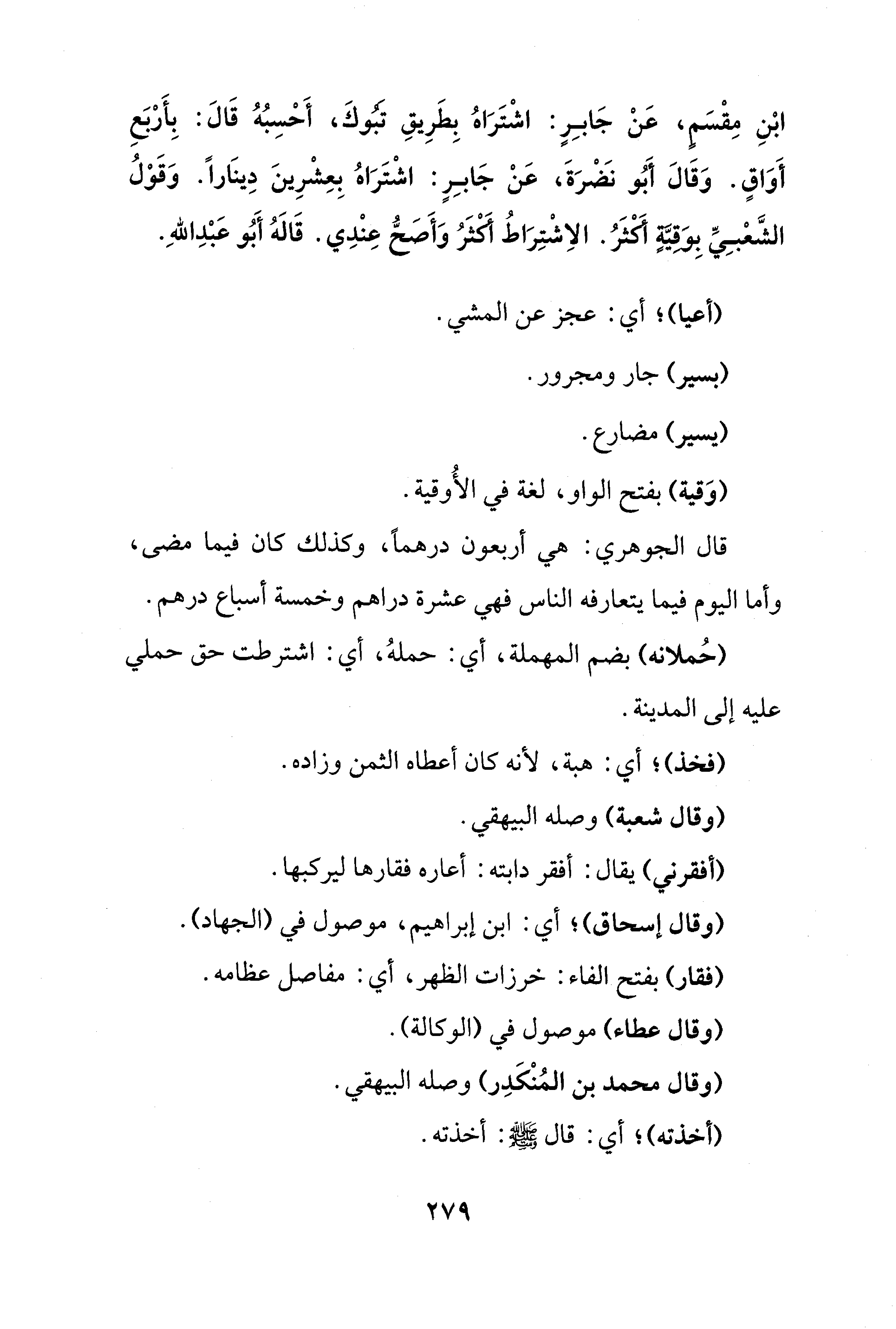 ابْنِ مِقْسَمٍ، عَنْ جَابِرٍ: اشْتَرَاهُ بِطَرِيقِ تَبُوكَ، أَحْسِبُهُ قَالَ: بِأرْبَعِ أَوَاقٍ. وَقَالَ أَبُو نضرَةَ، عَنْ جَابِرٍ: اشْتَرَاهُ بِعِشْرِينَ دِينَارًا. وَقَوْلُ الشَّعْبِيِّ بِوَقِيَّةٍ أَكْثَرُ. الاِشْتِرَاطُ أَكْثَرُ وَأَصَحُّ عِنْدِي. قَالَهُ أَبُو عَبْدِ اللهِ.