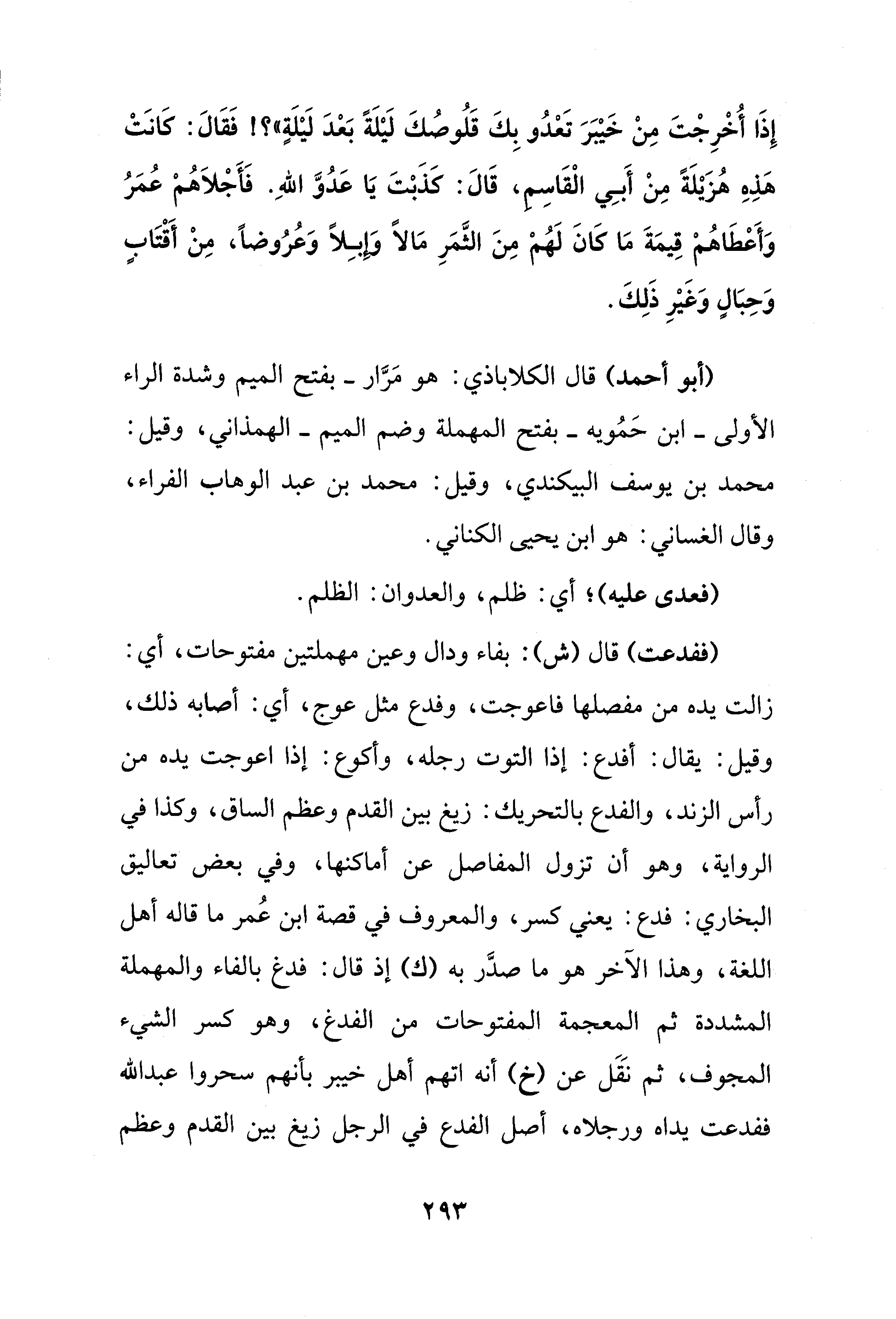 (ففدعت) قال (ش): بفاء ودال وعين مهملتين مفتوحات، أي: زالت يده من مفصلها فاعوجت، وفدع مثل عوج، أي: أصابه ذلك، وقيل: يقال: أفدع: إذا التوت رجله، وأكوع: إذا اعوجت يده من رأس الزند، والفدع بالتحريك: زيغ بين القدم وعظم الساق، وكذا في الرواية، وهو أن تزول المفاصل عن أماكنها، وفي بعض تعاليق البخاري: فدع: يعني كسر، والمعروف في قصة ابن عُمر ما قاله أهل اللغة، وهذا الآخر هو ما صدَّر به (ك) إذ قال: فدغ بالفاء والمهملة المشددة ثم المعجمة المفتوحات من الفدغ، وهو كسر الشيء المجوف، ثم نَقَل عن (خ) أنه إنّهم أهل خيبر بأنهم سحروا عبد الله ففدعت يداه ورجلاه، أصل الفدع في الرجل زيغ بين القدم وعظم