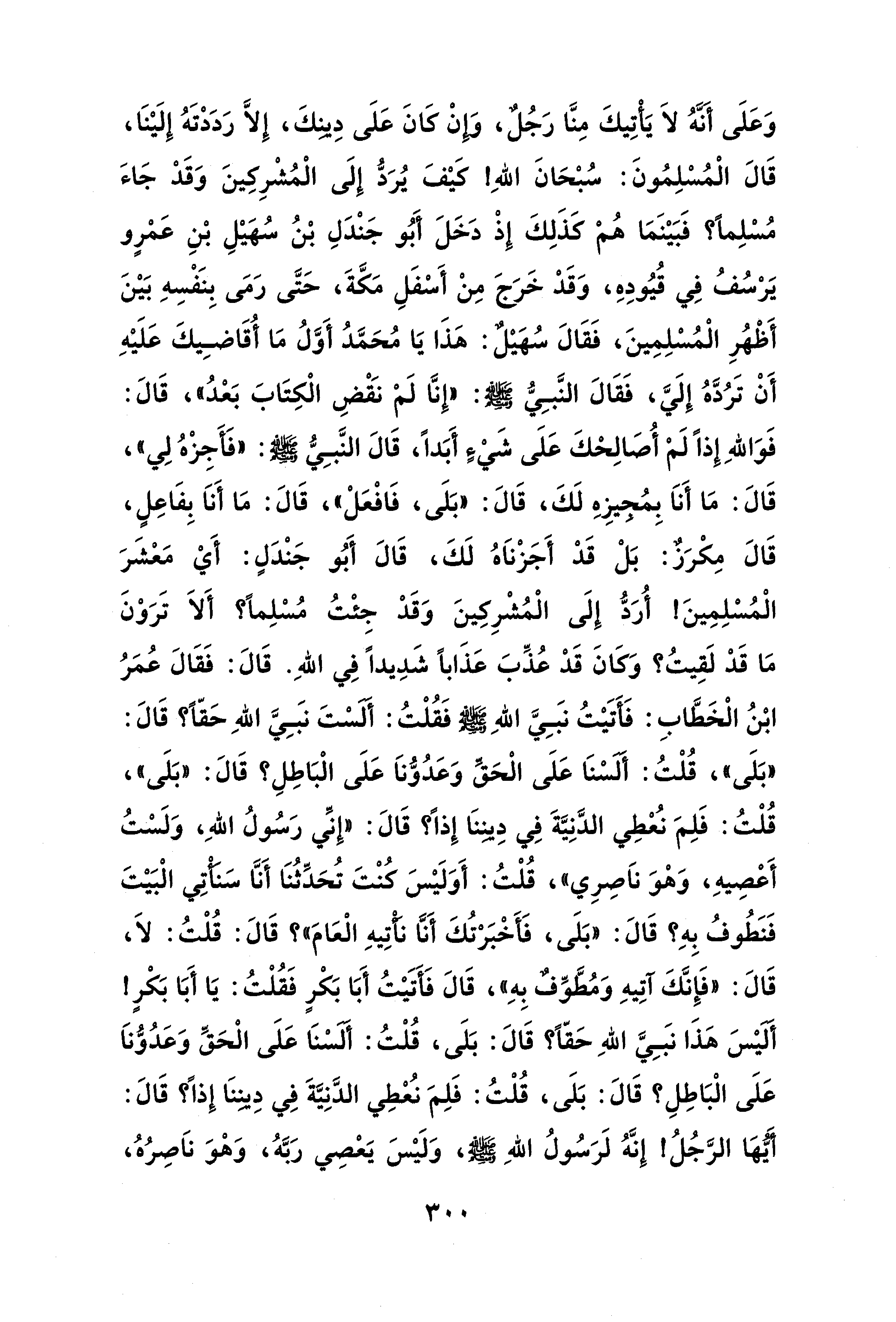 وَعَلَى أَنَّهُ لاَ يَأتِيكَ مِنَّا رَجُلٌ، وَإِنْ كَانَ عَلَى دِينكَ، إِلَّا رَدَدْتَهُ إِلَيْنَا، قَالَ الْمُسْلِمُونَ: سُبْحَانَ اللهِ! كَيْفَ يُرَدُّ إِلَى الْمُشْرِكِينَ وَقَدْ جَاءَ مُسْلِمًا؟ فَبَيْنَمَا هُمْ كَذَلِكَ إِذْ دَخَلَ أَبُو جَنْدَلِ بْنُ سُهَيْلِ بْنِ عَمْرٍو يَرْسُفُ فِي قُيُودِهِ، وَقَدْ خَرَجَ مِنْ أَسْفَلِ مَكَّةَ، حَتَّى رَمَى بِنَفْسِهِ بَيْنَ أَظْهُرِ الْمُسْلِمِينَ، فَقَالَ سُهَيْلٌ: هَذَا يَا مُحَمَّدُ أَوَّلُ مَا أُقَاضِيكَ عَلَيْهِ أَنْ تَرُدَّهُ إِلَيَّ، فَقَالَ النَّبِيُّ - صلى الله عليه وسلم -: "إِنَّا لَمْ نَقْضِ الْكِتَابَ بَعْدُ"، قَالَ: فَوَاللهِ إِذًا لَمْ أُصَالِحْكَ عَلَى شَيْءٍ أَبَدًا، قَالَ النَّبِيُّ - صلى الله عليه وسلم -: "فَأَجِزْهُ لِي"، قَالَ: مَا أَنَا بِمُجيزِهِ لَكَ، قَالَ: "بَلَى، فَافْعَلْ"، قَالَ: مَا أَناَ بِفَاعِلٍ، قَالَ مِكْرَرٌ: بَلْ قَدْ أَجَزْناَهُ لَكَ، قَالَ أَبُو جَنْدَلٍ: أَيْ مَعْشَرَ الْمُسْلِمِينَ! أُرَدُّ إِلَى الْمُشْرِكِينَ وَقَدْ جِئْتُ مُسْلِمًا؟ أَلاَ تَرَوْنَ مَا قَدْ لَقِيتُ؟ وَكَانَ قَدْ عُذِّبَ عَذَابًا شَدِيدًا فِي اللهِ. قَالَ: فَقَالَ عُمَرُ ابْنُ الْخَطَّابِ: فَأَتَيْتُ نبَيَّ اللهِ - صلى الله عليه وسلم - فَقُلْتُ: ألسْتَ نبِيَّ اللهِ حَقًّا؟ قَالَ: "بَلَى"، قُلْتُ: "ألسْنَا عَلَى الْحَقِّ وَعَدُوُّناَ عَلَى الْبَاطِلِ؟ قَالَ: "بَلَى"، قُلْتُ: فَلِمَ نُعْطِي الدَّنِيَّةَ فِي دِيننَا إِذًا؟ قَالَ: "إِنِّي رَسُولُ اللهِ، وَلَسْتُ أَعْصِيهِ، وَهْوَ نَاصِرِي"، قُلْتُ: أَوَلَيْسَ كُنْتَ تُحَدِّثُنَا أَنَّا سَتأْتِي الْبَيْتَ فَنَطُوفُ بِهِ؟ قَالَ: "بَلَى، فَأخْبَرْتُكَ أَنَّا نأتِيهِ الْعَامَ"؟ قَالَ: قُلْتُ: لاَ، قَالَ: "فَإِنَّكَ آتِيهِ وَمُطَّوِّفٌ بِهِ"، قَالَ فَأَتَيْتُ أَبَا بَكْرٍ فَقُلْتُ: يَا أَبَا بَكْرٍ! ألَيْسَ هَذَا نبَيَّ اللهِ حَقًّا؟ قَالَ: بَلَى، قُلْتُ: "ألسْنَا عَلَى الْحَق وَعَدُوُّناَ عَلَى الْبَاطِلِ؟ قَالَ: بَلَى، قُلْتُ: فَلِمَ نُعْطِي الدَّنِيَّةَ فِي دِيننَا إِذًا؟ قَالَ: أيُّهَا الرَّجُلُ! إِنَّهُ لَرَسُولُ اللهِ - صلى الله عليه وسلم -، وَلَيْسَ يَعْصِي رَبَّهُ، وَهْوَ نَاصِرُهُ،