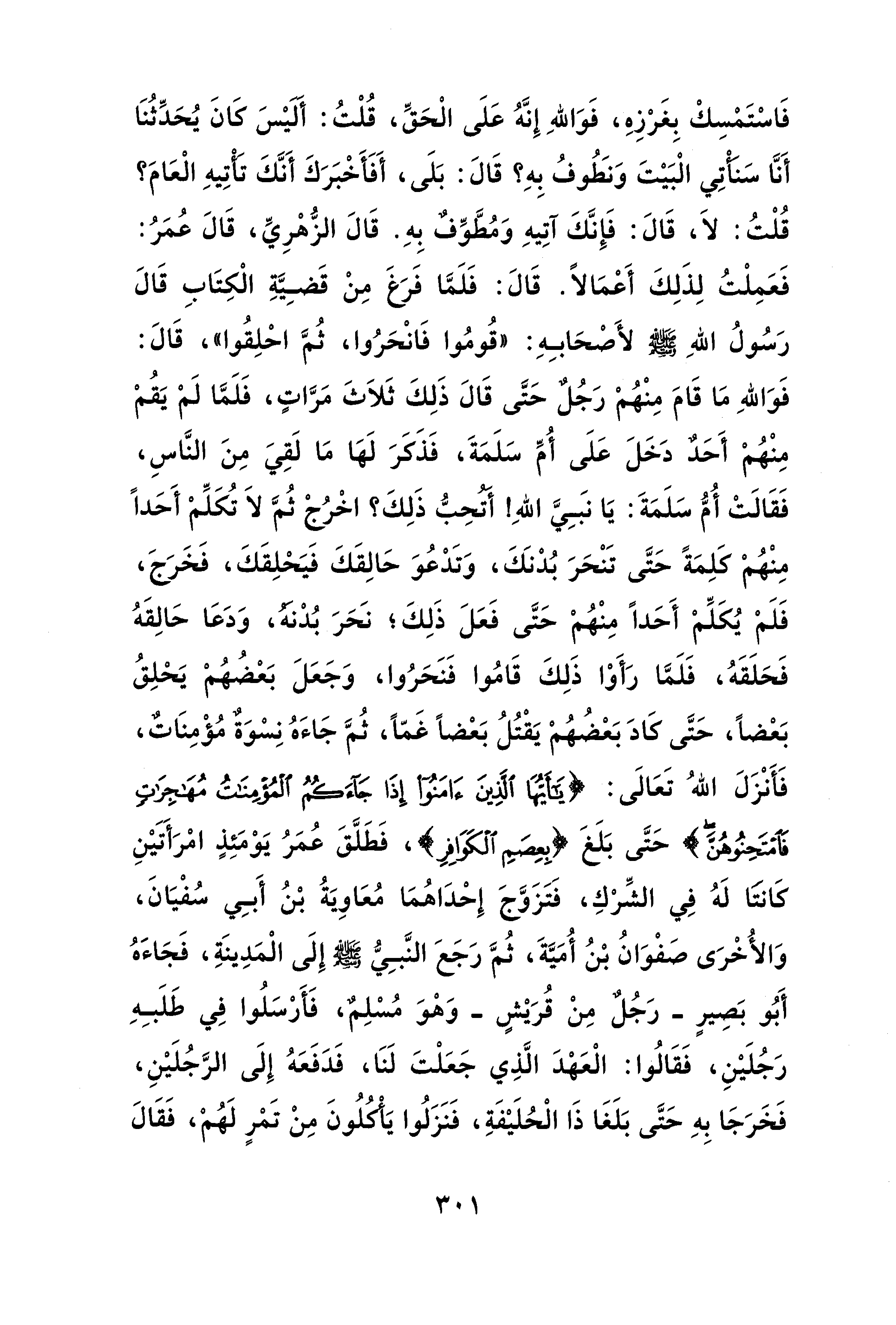 فَاسْتَمْسِكْ بِغَرْزِه، فَوَاللهِ إِنَّهُ عَلَى الْحَقِّ، قُلْتُ: أَلَيْسَ كَانَ يُحَدِّثُنَا أَنَّا سَنأتِي الْبَيْتَ وَنَطُوفُ بِهِ؟ قَالَ: بَلَى، أَفَأخْبَرَكَ أَنَّكَ تأْتِيهِ الْعَامَ؟ قُلْتُ: لاَ، قَالَ: فَإِنَّكَ آتِيهِ وَمُطَوِّفٌ بِهِ. قَالَ الزُّهْرِيِّ، قَالَ عُمَرُ: فَعَمِلْتُ لِذَلِكَ أَعْمَالًا. قَالَ: فَلَمَّا فَرَغَ مِنْ قَضِيَّةِ الْكِتَابِ قَالَ رَسُولُ اللهِ - صلى الله عليه وسلم - لأَصْحَابِهِ: "قُومُوا فَانْحَرُوا، ثُمَّ احْلِقُوا"، قَالَ: فَوَاللهِ مَا قَامَ مِنْهُمْ رَجُلٌ حَتَّى قَالَ ذَلِكَ ثَلاَثَ مَرَّاتٍ، فَلَمَّا لَمْ يَقُمْ مِنْهُمْ أَحَدٌ دَخَلَ عَلَى أُمِّ سَلَمَةَ، فَذَكَرَ لَهَا مَا لَقِيَ مِنَ النَّاسِ، فَقَالَتْ أُمُّ سَلَمَةَ: يَا نبَيَّ اللهِ! أتحِبُّ ذَلِكَ؟ اخْرُجْ ثُمَّ لاَ تُكَلِّمْ أَحَدًا مِنْهُمْ كَلِمَةً حَتَّى تَنْحَرَ بُدْنَكَ، وَتَدْعُوَ حَالِقَكَ فَيَحْلِقَكَ، فَخَرَجَ، فَلَمْ يُكَلِّمْ أَحَدًا مِنْهُمْ حَتَّى فَعَلَ ذَلِكَ؛ نَحَرَ بُدْنه، وَدَعَا حَالِقَهُ فَحَلَقَهُ، فَلَمَّا رَأَوْا ذَلِكَ قَامُوا فَنَحَرُوا، وَجَعَلَ بَعْضُهُمْ يَحْلِقُ بَعْضًا، حَتَّى كَادَ بَعْضُهُمْ يَقْتُلُ بَعْضًا غَمًّا، ثُمَّ جَاءَهُ نِسْوَةٌ مُؤْمِنَاتٌ، فَأنْزَلَ اللهُ تَعَالَى: {يَا أَيُّهَا الَّذِينَ آمَنُوا إِذَا جَاءَكُمُ الْمُؤْمِنَاتُ مُهَاجِرَاتٍ فَامْتَحِنُوهُنَّ} حَتَّى بَلَغَ {بِعِصَمِ الْكَوَافِرِ}، فَطَلَّقَ عُمَرُ يَوْمَئِذٍ امْرَأَتَيْنِ كَانتَا لَهُ فِي الشِّرْكِ، فَتَزَوَّجَ إِحْدَاهُمَا مُعَاوِيَةُ بْنُ أَبِي سُفْيَانَ، وَالأُخْرَى صَفْوَانُ بْنُ أُمَيَّةَ، ثُمَّ رَجَعَ النَّبِيُّ - صلى الله عليه وسلم - إِلَى الْمَدِينَةِ، فَجَاءَهُ أَبُو بَصِيرٍ -رَجُلٌ مِنْ قُرَيْشٍ- وَهْوَ مُسْلِمٌ، فَأَرْسَلُوا فِي طَلَبِهِ رَجُلَيْنِ، فَقَالُوا: الْعَهْدَ الَّذِي جَعَلْتَ لَنَا، فَدَفَعَهُ إِلَى الرَّجُلَيْنِ، فَخَرَجَا بِهِ حَتَّى بَلَغَا ذَا الْحُلَيْفَةِ، فَنَزَلُوا يأكلُونَ مِنْ تَمْرٍ لَهُمْ، فَقَالَ
