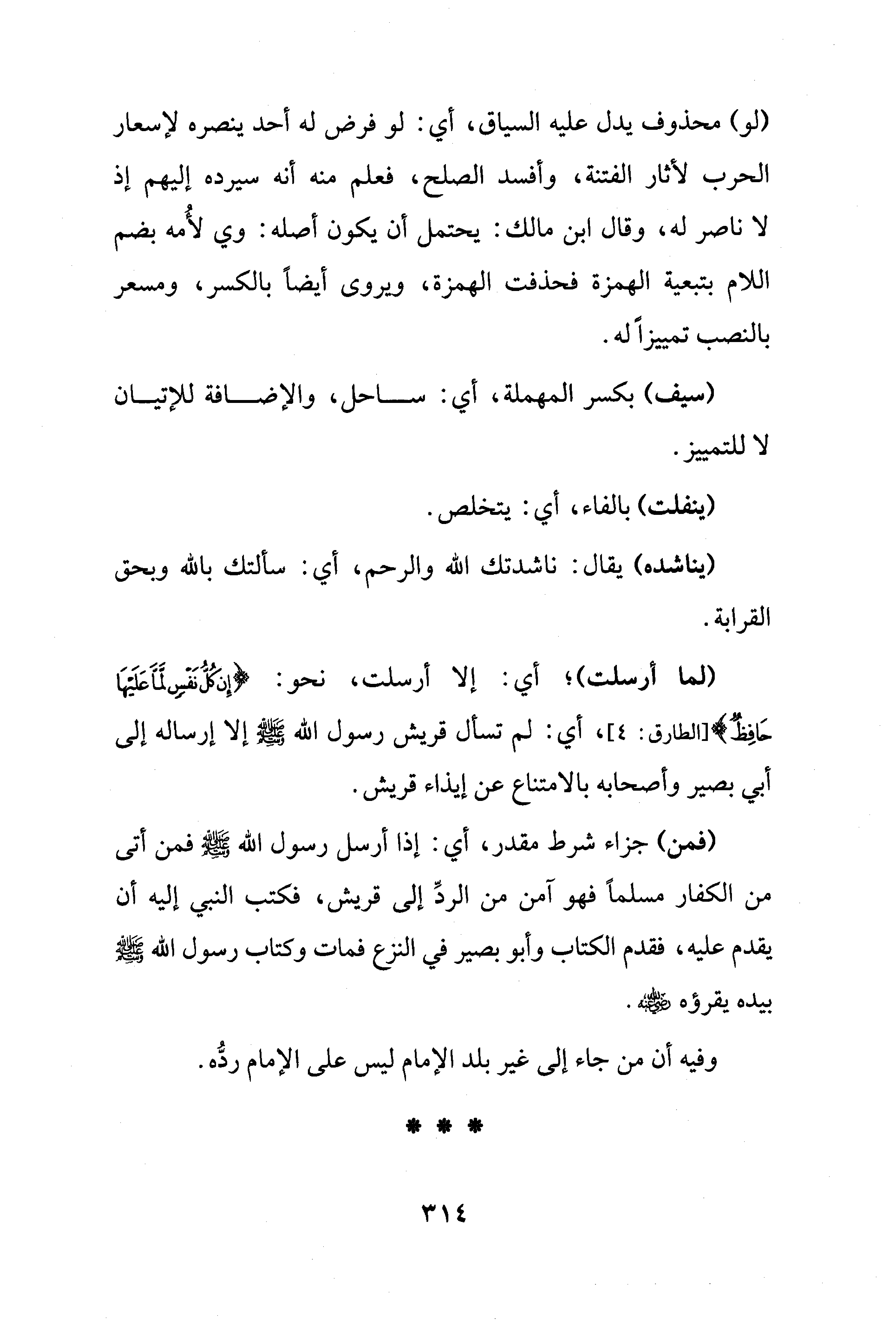 (فمن) جزاء شرط مقدر، أي: إذا أرسل رسول الله - عز وجل - فمن أتى من الكفار مسلمًا فهو آمن من الردِّ إلى قريش، فكتب النبي إليه أن يقدم عليه، فقدم الكتاب وأبو بصير في النزع فمات وكتاب رسول الله - صلى الله عليه وسلم - بيده يقرؤه - رضي الله عنه -.