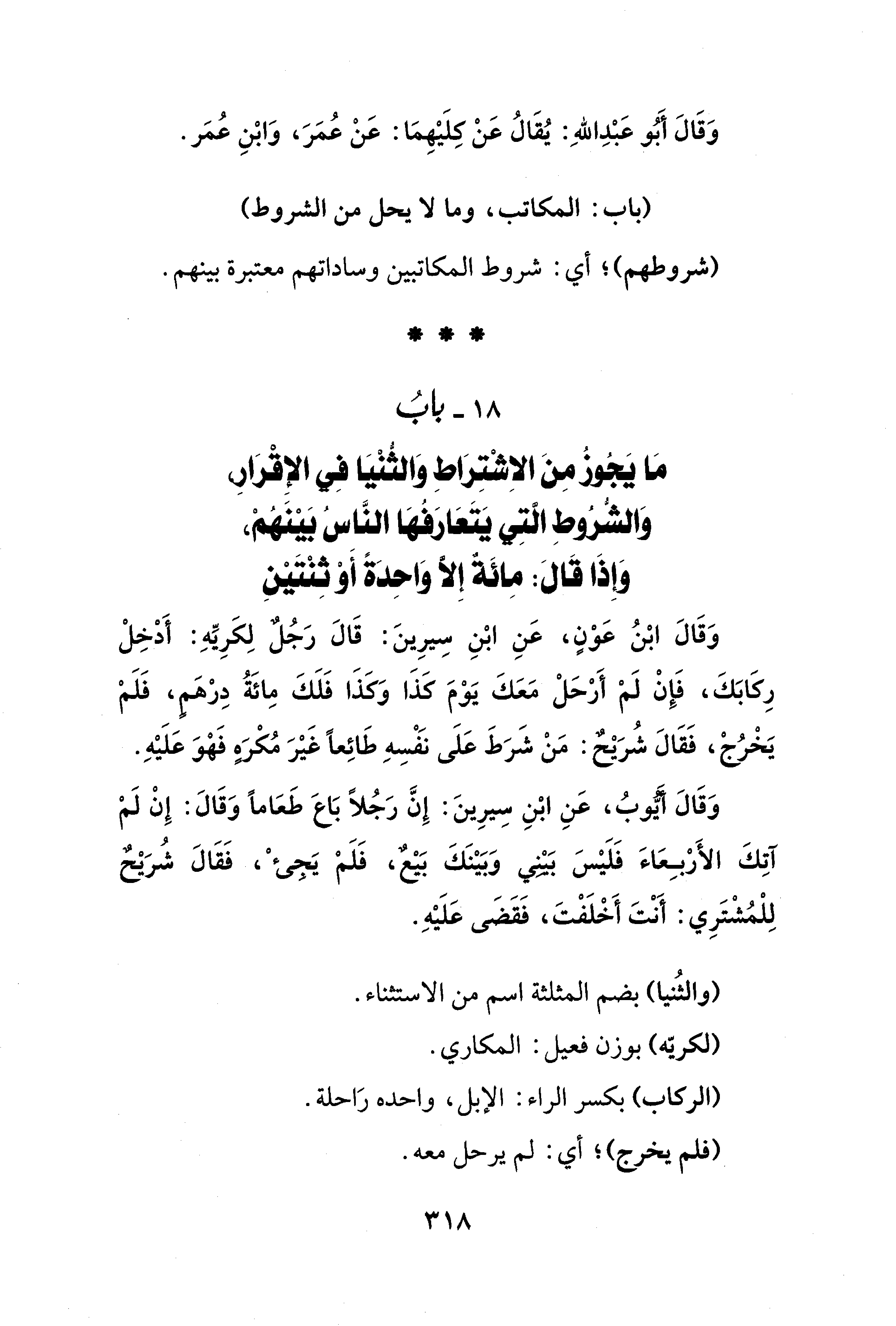 18 - بابُ مَا يَجُوزُ مِنَ الاِشْتِرَاطِ وَالثُّنْيَا فِي الإِقْرَارِ، وَالشُّرُوط التِي يَتَعَارَفُهَا النَّاسُ بَيْنَهمْ، وَإِذَا قَالَ: مِائَة إِلَّا وَاحِدَةً أَوْ ثِنْتَيْنِ