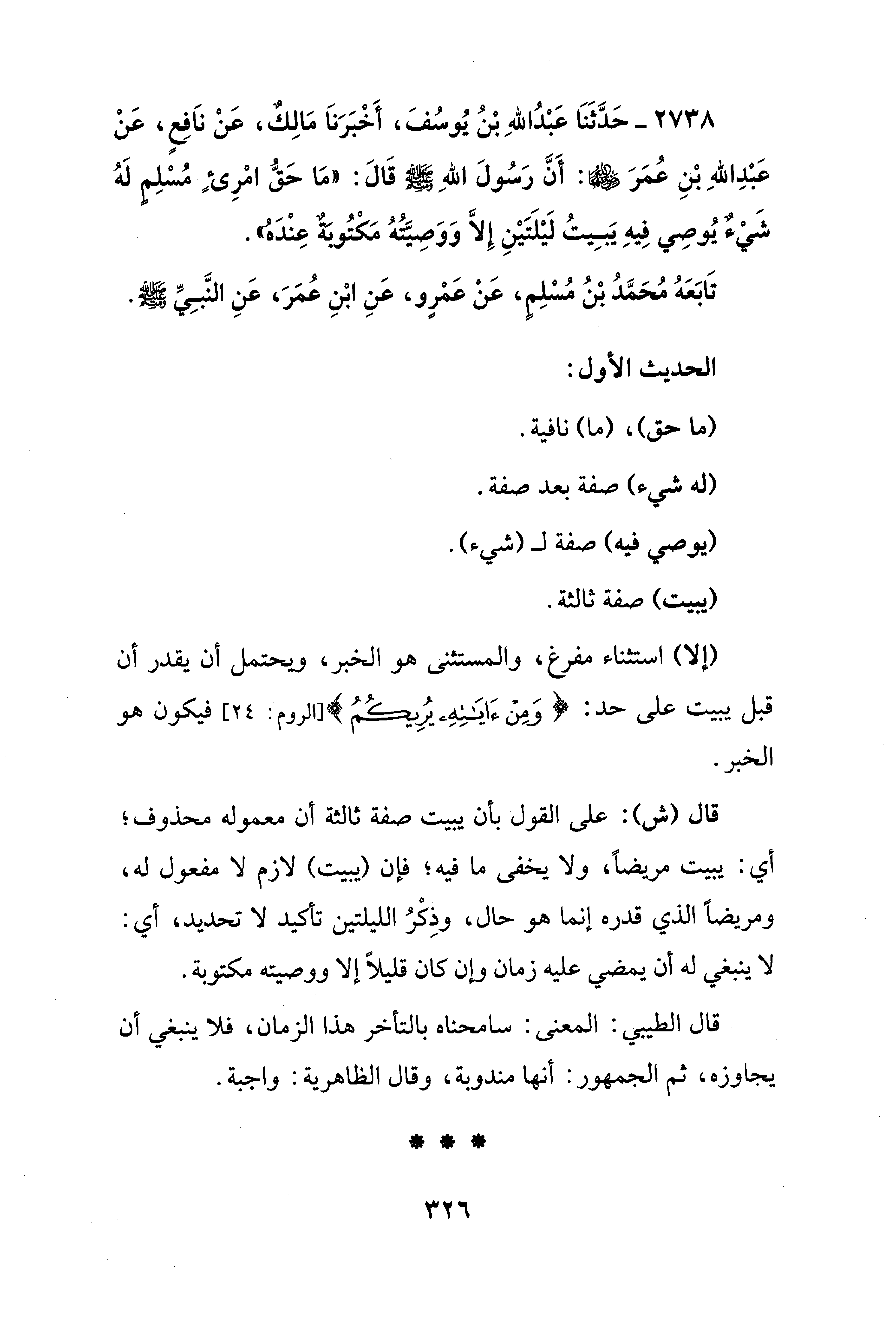 2738 - حَدَّثَنَا عَبْدُ اللهِ بْنُ يُوسُفَ، أَخْبَرَنَا مَالِكٌ، عَنْ نَافِعٍ، عَنْ عَبْدِ اللهِ بْنِ عُمَرَ - رضي الله عنهما -: أَنَّ رَسُولَ اللهِ - صلى الله عليه وسلم - قَالَ: "مَا حَقُّ امْرِئٍ مُسْلِمٍ لَهُ شَيْءٌ يُوصِي فِيهِ يَبِيتُ لَيْلَتَيْنِ إِلَّا وَوَصِيَّتُهُ مَكْتُوبَةٌ عِنْدَه".