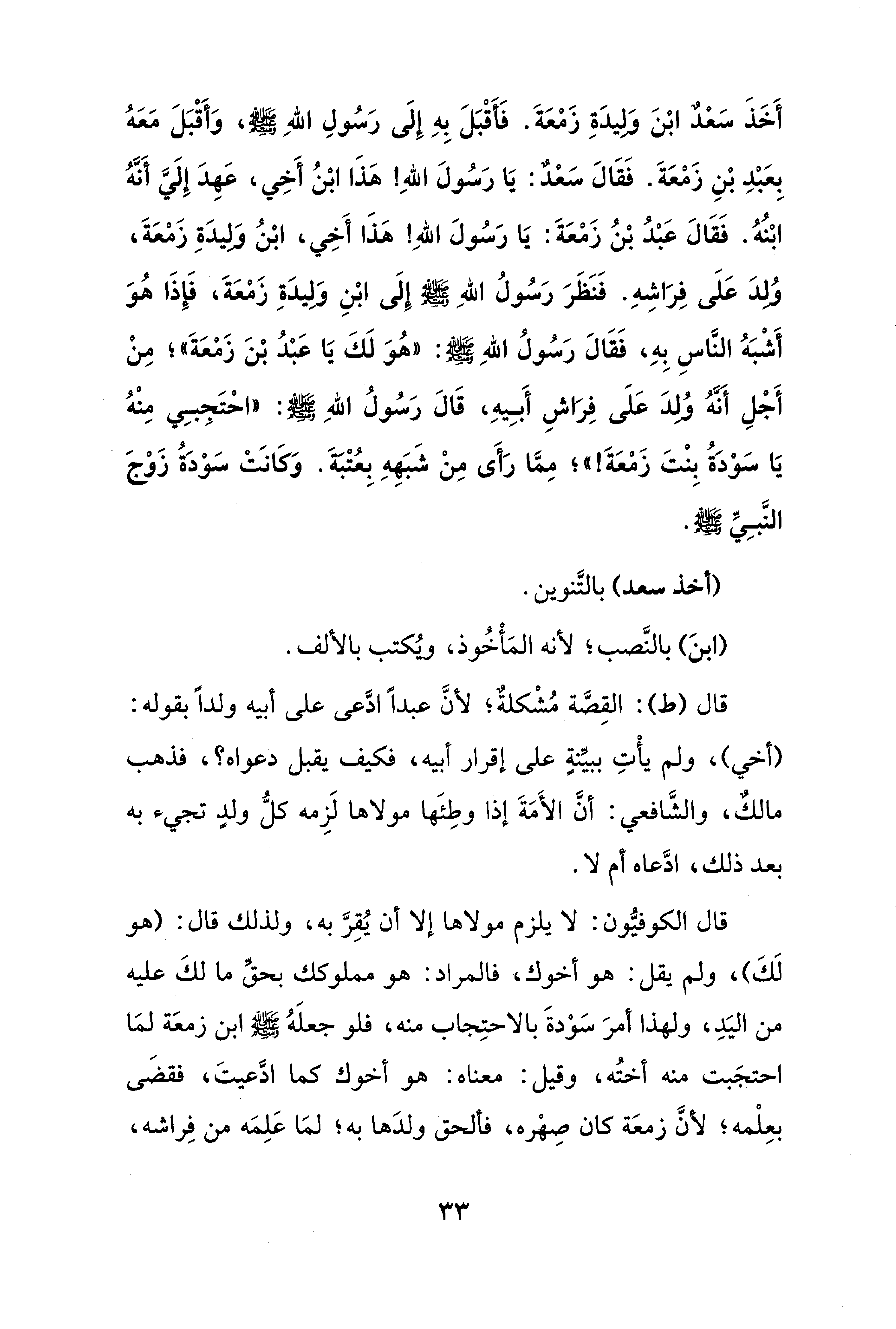 أَخَذَ سَعْدٌ ابْنَ وَليدَةِ زَمْعَةَ. فَأقْبَلَ بِهِ إِلَى رَسُولِ الله - صلى الله عليه وسلم -، وَأَقْبَلَ مَعَهُ بِعَبْدِ بْنِ زَمْعَةَ. فَقَالَ سَعْد: يَا رَسُولَ الله هَذَا ابْنُ أَخِي، عَهِدَ إِلَيَّ أَنَّهُ ابْنُهُ. فَقَالَ عَبْدُ بْنُ زَمْعَةَ: يَا رَسُولَ الله هَذَا أَخِي، ابْنُ وَليدَةِ زَمْعَةَ، وُلِدَ عَلَى فِرَاشِهِ. فَنَظَرَ رَسُولُ الله - صلى الله عليه وسلم - إِلَى ابْنِ وَليدَةِ زَمْعَةَ، فَإِذَا هُوَ أَشْبَهُ النَّاسِ بِهِ، فَقَالَ رَسُولُ الله - صلى الله عليه وسلم -: "هُوَ لَكَ يَا عَبْدُ بنَ زَمْعَةَ"؛ مِنْ أَجْلِ أَنَّهُ وُلدَ عَلَى فِرَاشِ أَبِيهِ، قَالَ رَسُولُ الله - صلى الله عليه وسلم -: "احْتَجبِي مِنْهُ يَا سَوْدَةُ بِنْتَ زَمْعَةَ"؛ مِمَّا رَأَى مِنْ شَبَهِهِ بِعُتْبةَ. وَكانَتْ سَوْدَةُ زَوْجَ النَّبِيِّ - صلى الله عليه وسلم -.