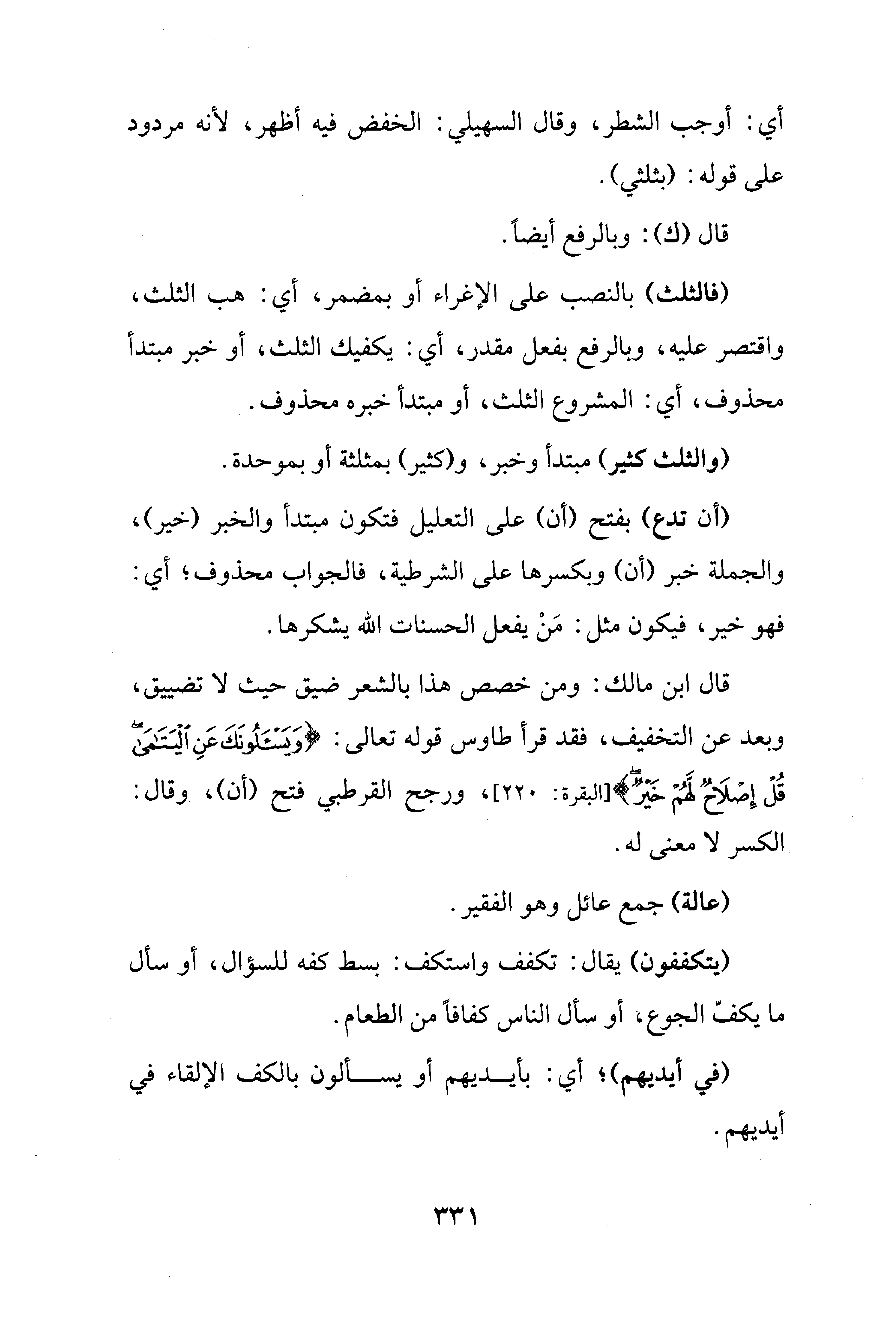 قال ابن مالك: ومن خصص هذا بالشعر ضيق حيث لا تضييق، وبعد عن التخفيف، فقد قرأ طاوس قوله تعالى: {وَيَسْأَلُونَكَ عَنِ الْيَتَامَى قُلْ إِصْلَاحٌ لَهُمْ خَيْرٌ} [البقرة: 220]، ورجح القرطبي فتح (أن)، وقال: الكسر لا معنى له.