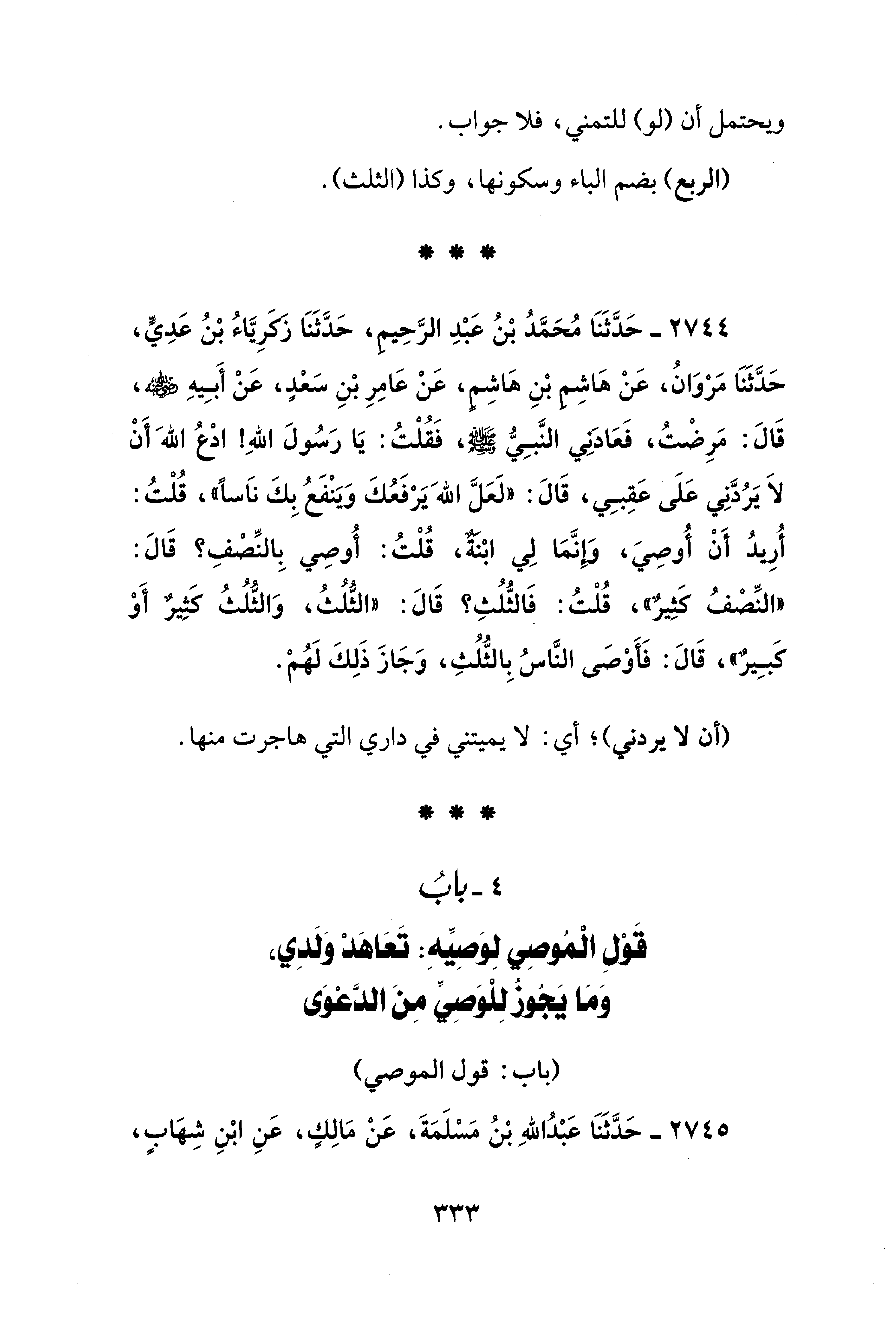 2744 - حَدَّثَنَا مُحَمَّدُ بْنُ عَبْدِ الرَّحِيم، حَدَّثَنَا زَكَريَّاءُ بْنُ عَدِىٍّ، حَدَّثَنَا مَرْوَانُ، عَنْ هَاشِم بْنِ هَاشِمٍ، عَنْ عَامِرِ بْنِ سَعْدٍ، عَنْ أَبِيهِ - رضي الله عنه -، قَالَ: مَرِضْتُ، فَعَادَنِي النَّبِيُّ - صلى الله عليه وسلم -، فَقُلْتُ: يَا رَسُولَ اللهِ! ادْعُ اللهَ أَنْ لاَ يَرُدَّنِي عَلَى عَقِبِي، قَالَ: "لَعَلَّ اللهَ يَرْفَعُكَ وَيَنْفَعُ بِكَ نَاسًا"، قُلْتُ: أُرِيدُ أَنْ أُوصِيَ، وإنَّمَا لِي ابْنةٌ، قُلْتُ: أُوصِي بِالنِّصْفِ؟ قَالَ: "النِّصْفُ كَثِيرٌ"، قُلْتُ: فَالثُّلُثِ؟ قَالَ: "الثُّلُثُ، وَالثُّلُثُ كَثِيرٌ أَوْ كَبِيرٌ"، قَالَ: فَأوْصَى النَّاسُ بِالثُّلُثِ، وَجَازَ ذَلِكَ لَهُمْ.
