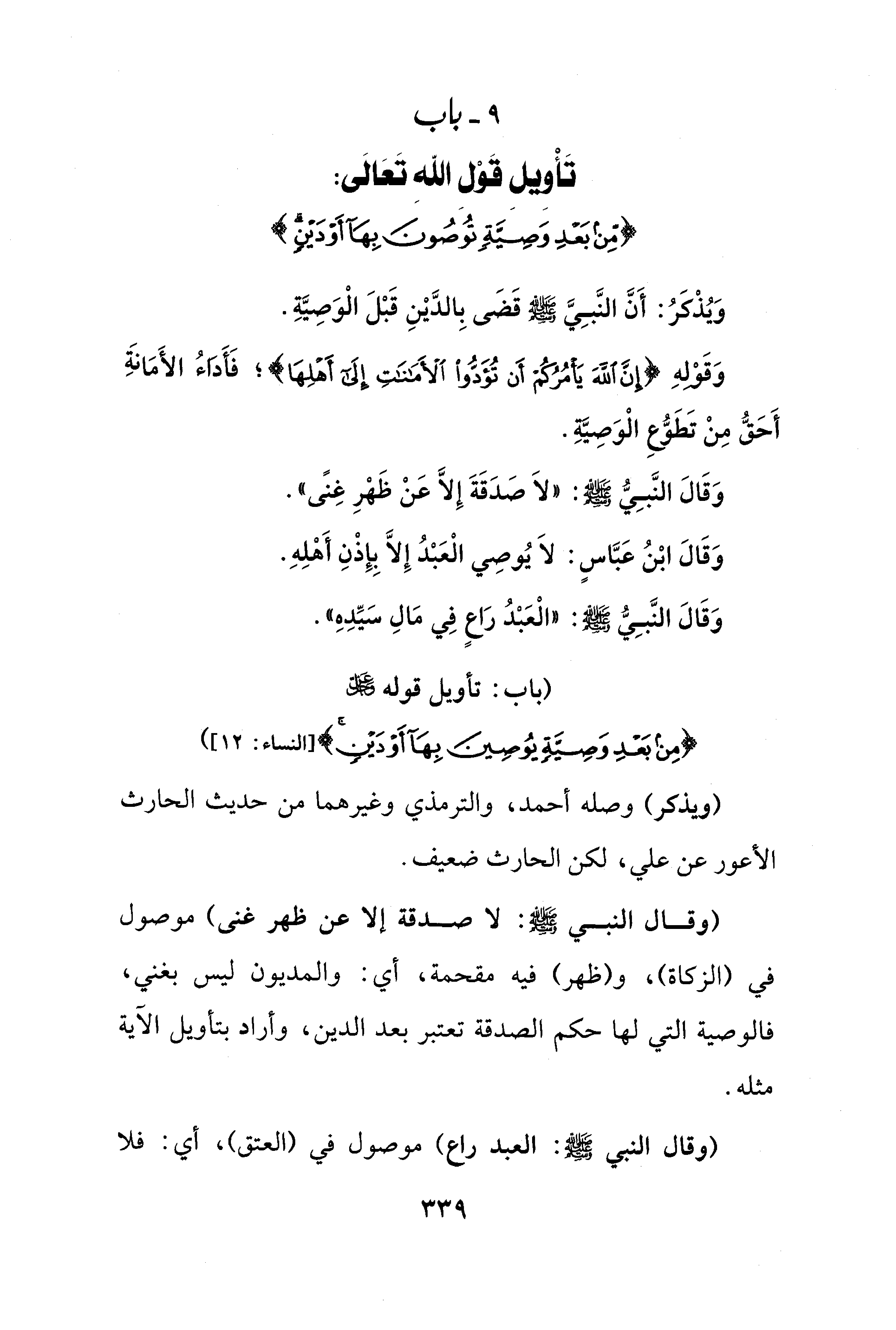 9 - باب تَأْويلِ قَوْلِ اللهِ تَعَالَى: {مِنْ بَعْدِ وَصِيَّةٍ يُوصَى بِهَا أَوْ دَيْنٍ}