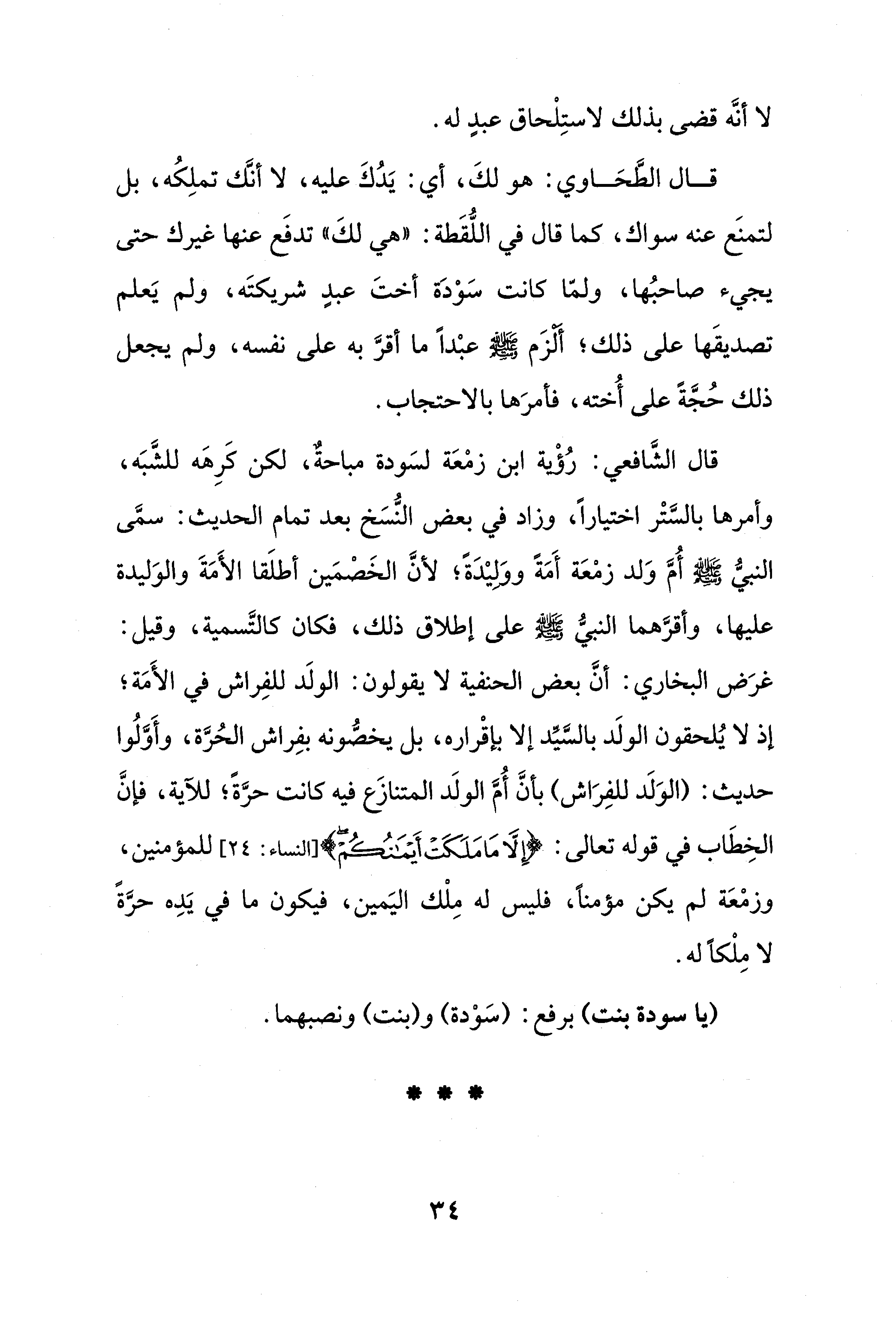 قال الشَّافعي: رُؤْية ابن زمْعَة لسَودة مباحة، لكن كَرِهَه للشَّبَه، وأمرها بالسَّتْر اختيارًا، وزاد في بعض النُّسَخ بعد تمام الحديث: سمَّى النبيُّ - صلى الله عليه وسلم - أُمَّ وَلد زمْعَة أَمَةً ووَليْدَةً؛ لأنَّ الخَصْمَين أطلَقا الأَمَةَ والوَليدة عليها، وأقرَّهما النبيُّ - صلى الله عليه وسلم - على إطلاق ذلك، فكان كالتَّسمية، وقيل: غرَض البخاري: أنَّ بعض الحنفية لا يقولون: الولَد للفِراش في الأَمَة؛ إذ لا يُلحقون الولَد بالسَّيِّد إلا بإقْراره، بل يخصُّونه بفِراش الحُرَّة، وأَوَّلُوا حديث: (الوَلَد للفِرَاش) بأنَّ أُمَّ الولَد المتنازَع فيه كانت حرَّةً؛ للآية، فإنَّ الخِطَاب في قوله تعالى: {إلا مَا مَلَكَتْ أَيْمَانُكُمْ} [النساء: 24] للمؤمنين، وزمْعَة لم يكن مؤمنًا، فليس له مِلْك اليَمين، فيكون ما في يَدِه حرَّةً لا مِلْكًا له.