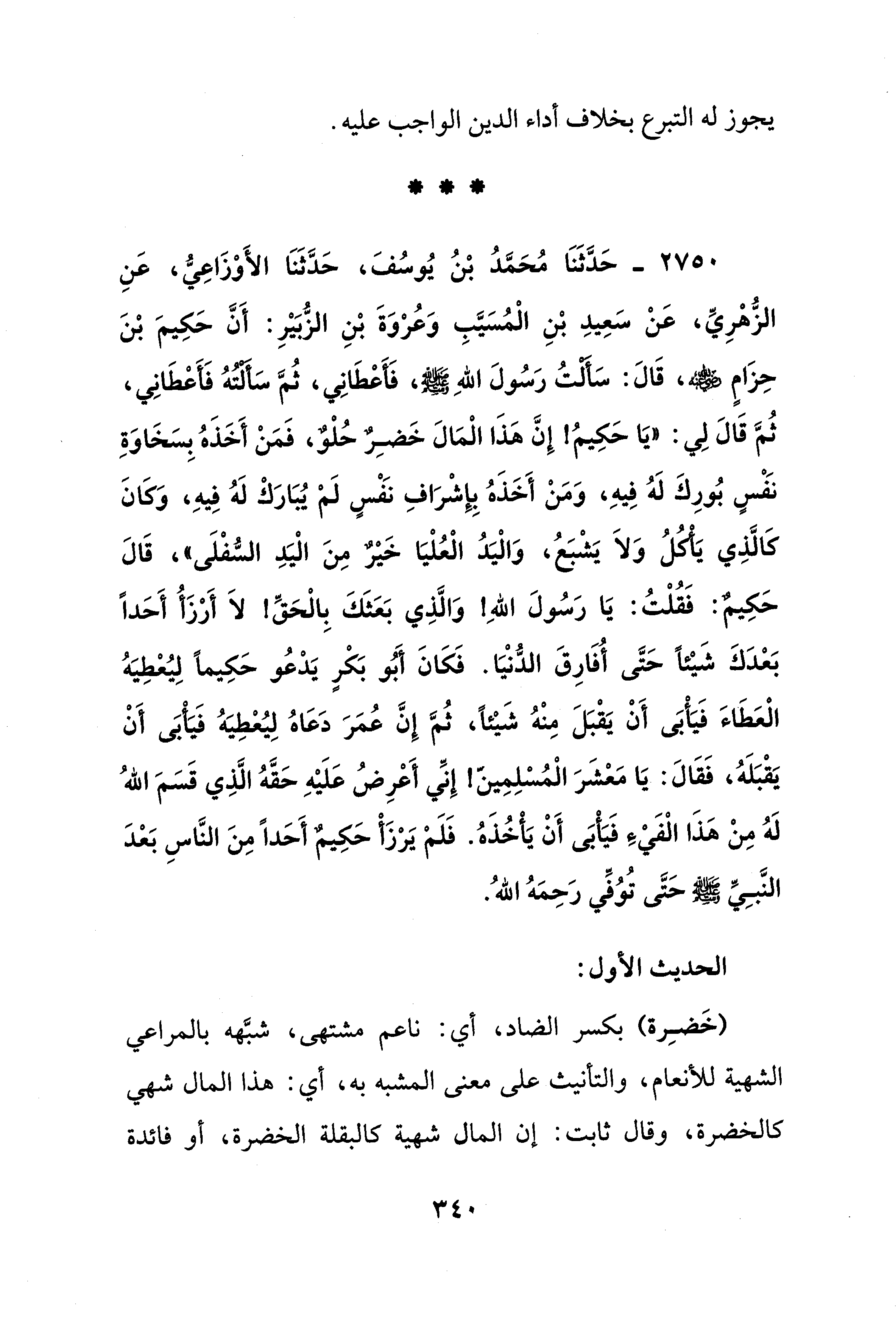 2750 - حَدَّثَنَا مُحَمَّدُ بْنُ يُوسُفَ، حَدَّثَنَا الأَوْزَاعيُّ، عَنِ الزُّهْرِيِّ، عَنْ سَعِيدِ بْنِ الْمُسَيَّبِ وَعُرْوَةَ بْنِ الزُّبَيْرِ: أَنَّ حَكِيمَ بْنَ حِزَامٍ - رضي الله عنه -، قَالَ: سألتُ رَسُولَ اللهِ - صلى الله عليه وسلم -، فَأَعْطَانِي، ثُمَّ سَألتُهُ فَأعْطَانِي، ثُمَّ قَالَ لِي: "يَا حَكِيمُ! إِنَّ هَذَا الْمَالَ خَضِرٌ حُلْوٌ، فَمَنْ أَخَذَهُ بِسَخَاوَةِ نَفْسٍ بُورِكَ لَهُ فِيهِ، وَمَنْ أَخَذَهُ بِإِشْرَافِ نَفْسٍ لَمْ يُبَارَكْ لَهُ فِيهِ، وَكَانَ كَالَّذِي يَأكُلُ وَلاَ يَشْبَعُ، وَالْيَدُ الْعُلْيَا خَيْرٌ مِنَ الْيَدِ السُّفْلَى"، قَالَ حَكِيمٌ: فَقُلْتُ: يَا رَسُولَ اللهِ! وَالَّذِي بَعَثَكَ بِالْحَقِّ! لاَ أَرْزَأُ أَحَدًا بَعْدَكَ شَيْئًا حَتَّى أُفَارِقَ الدُّنْيَا. فَكَانَ أَبو بَكْرٍ يَدْعُو حَكِيمًا لِيُعْطِيَهُ الْعَطَاءَ فَيَأبَى أَنْ يَقْبَلَ مِنْهُ شَيْئًا، ثُمَّ إِنَّ عُمَرَ دَعَاهُ لِيُعْطِيَهُ فَيَأبَى أَنْ يَقْبَلَهُ، فَقَالَ: يَا مَعْشَرَ الْمُسْلِمِين! إِنِّي أَعْرِضُ عَلَيْهِ حَقَّهُ الَّذِي قَسَمَ اللهُ لَهُ مِنْ هَذَا الْفَيْءَ فَيَأْبَى أَنْ يَأخُذَهُ. فَلَمْ يَرْزَأْ حَكِيمٌ أَحَدًا مِنَ النَّاسِ بَعْدَ النَّبِيِّ - صلى الله عليه وسلم - حَتَّى تُوُفِّي رَحِمَهُ اللهُ.