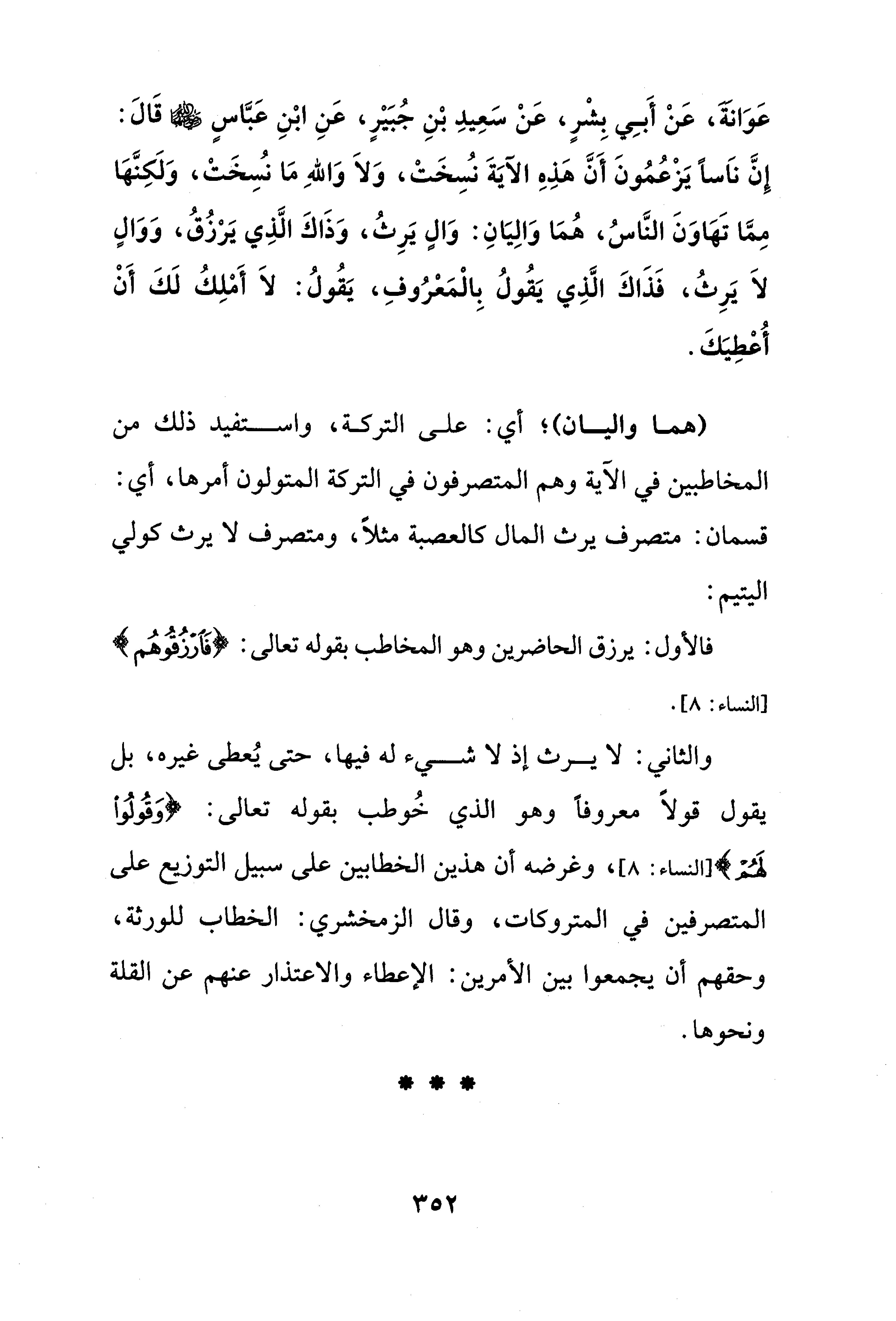 عَوَانة، عَنْ أَبِي بِشْرٍ، عَنْ سَعِيدِ بْنِ جُبَيْرٍ، عَنِ ابْنِ عَبَّاسٍ - رضي الله عنهما - قَالَ: إِنَّ ناَسًا يَزْعُمُونَ أَنَّ هَذِهِ الآيَةَ نُسِخَتْ، وَلاَ وَاللهِ مَا نُسِخَتْ، وَلَكِنَّهَا مِمَّا تَهَاوَنَ النَّاسُ، هُمَا وَالِيَانِ: وَالٍ يَرِثُ، وَذَاكَ الَّذِي يَرْزُقُ، وَوَالٍ لاَ يَرِثُ، فَذَاكَ الَّذِي يَقُولُ بِالْمَعْرُوفِ، يَقُولُ: لاَ أَمْلِكُ لَكَ أَنْ أعطِيَكَ.