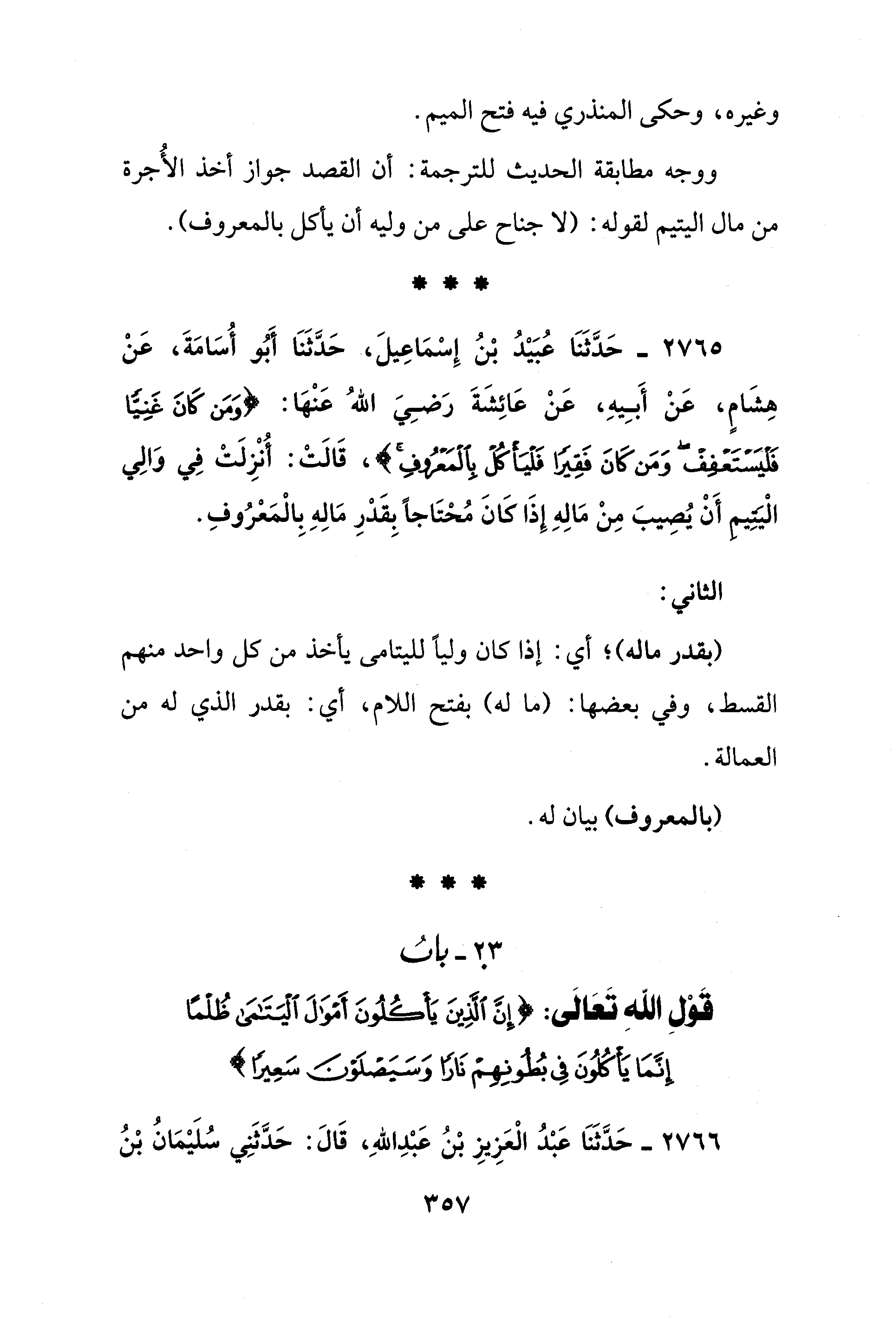2765 - حَدَّثَنَا عُبَيْدُ بْنُ إِسْمَاعِيلَ، حَدَّثَنَا أَبُو أُسَامَةَ، عَنْ هِشَامٍ، عَنْ أَبِيهِ، عَنْ عَائِشَةَ رَضِيَ اللهُ عَنْهَا: {وَمَنْ كَانَ غَنِيًّا فَلْيَسْتَعْفِفْ وَمَنْ كَانَ فَقِيرًا فَلْيَأْكُلْ بِالْمَعْرُوفِ}، قَالَتْ: أُنْزِلَتْ فِي وَالِي الْيتيم أَنْ يُصِيبَ مِنْ مَالِهِ إِذَا كَانَ مُحْتَاجًا بِقَدْرِ مَالِهِ بِالْمَعْرُوفِ.