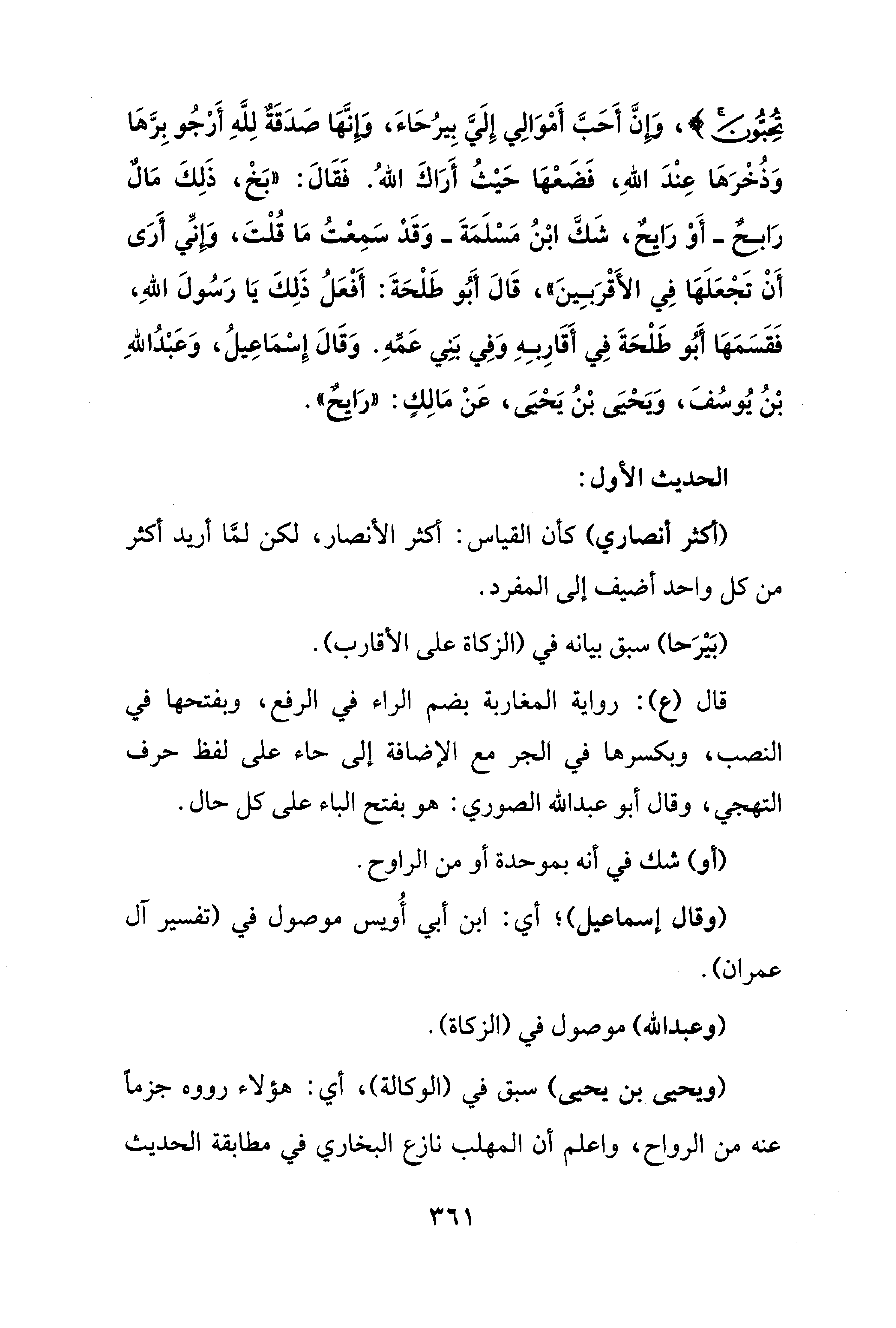 تُحِبُّونَ}، وَإِنَّ أَحَبَّ أَمْوَالِي إِلَيَّ بِيرُحَاءَ، وإنَّهَا صَدَقَةٌ لِلَّهِ أَرْجُو بِرَّهَا وَذُخْرَهَا عِنْدَ اللهِ، فَضَعْهَا حَيْثُ أَرَاكَ اللهُ. فَقَالَ: "بَخْ، ذَلِكَ مَالٌ رَابحٌ -أَوْ رَايحٌ، شَكَّ ابْنُ مَسْلَمَةَ- وَقَدْ سَمِعْتُ مَا قُلْتَ، وإنِّي أَرَى أَنْ تَجْعَلَهَا فِي الأَقْرَبِينَ"، قَالَ أَبُو طَلْحَةَ: أَفْعَلُ ذَلِكَ يَا رَسُولَ اللهِ، فَقَسَمَهَا أَبُو طَلْحَةَ فِي أَقَارِبِهِ وَفِي بَنِي عَمِّهِ. وَقَالَ إِسْمَاعِيلُ، وَعَبْدُ اللهِ بْنُ يُوسُفَ، وَيَحْيَى بْنُ يَحْيَى، عَنْ مَالِكٍ: "رَايحٌ".