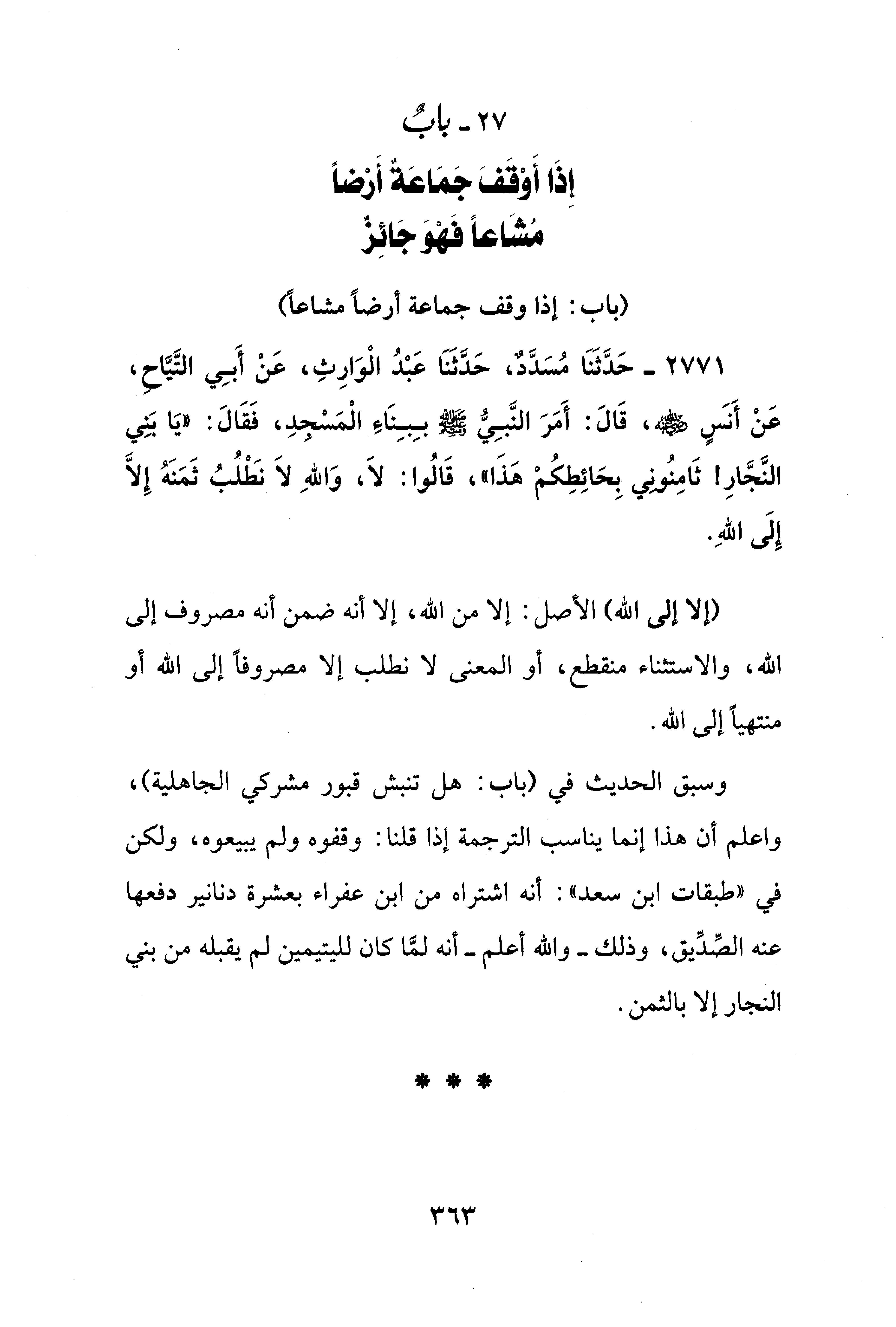 2771 - حَدَّثَنَا مُسَدَّدٌ، حَدَّثَنَا عَبْدُ الْوَارِثِ، عَنْ أَبِي التَّيَّاحِ، عَنْ أَنسٍ - رضي الله عنه -، قَالَ: أَمَرَ النَّبِيُّ - صلى الله عليه وسلم - بِبِنَاءِ الْمَسْجدِ، فَقَالَ: "يَا بَنِي النَّجَّارِ! ثَامِنُوني بِحَائِطِكُمْ هَذَا"، قَالُوا: لاَ، وَاللهِ لاَ نَطْلُبُ ثَمَنَهُ إِلَّا إلَى اللهِ.