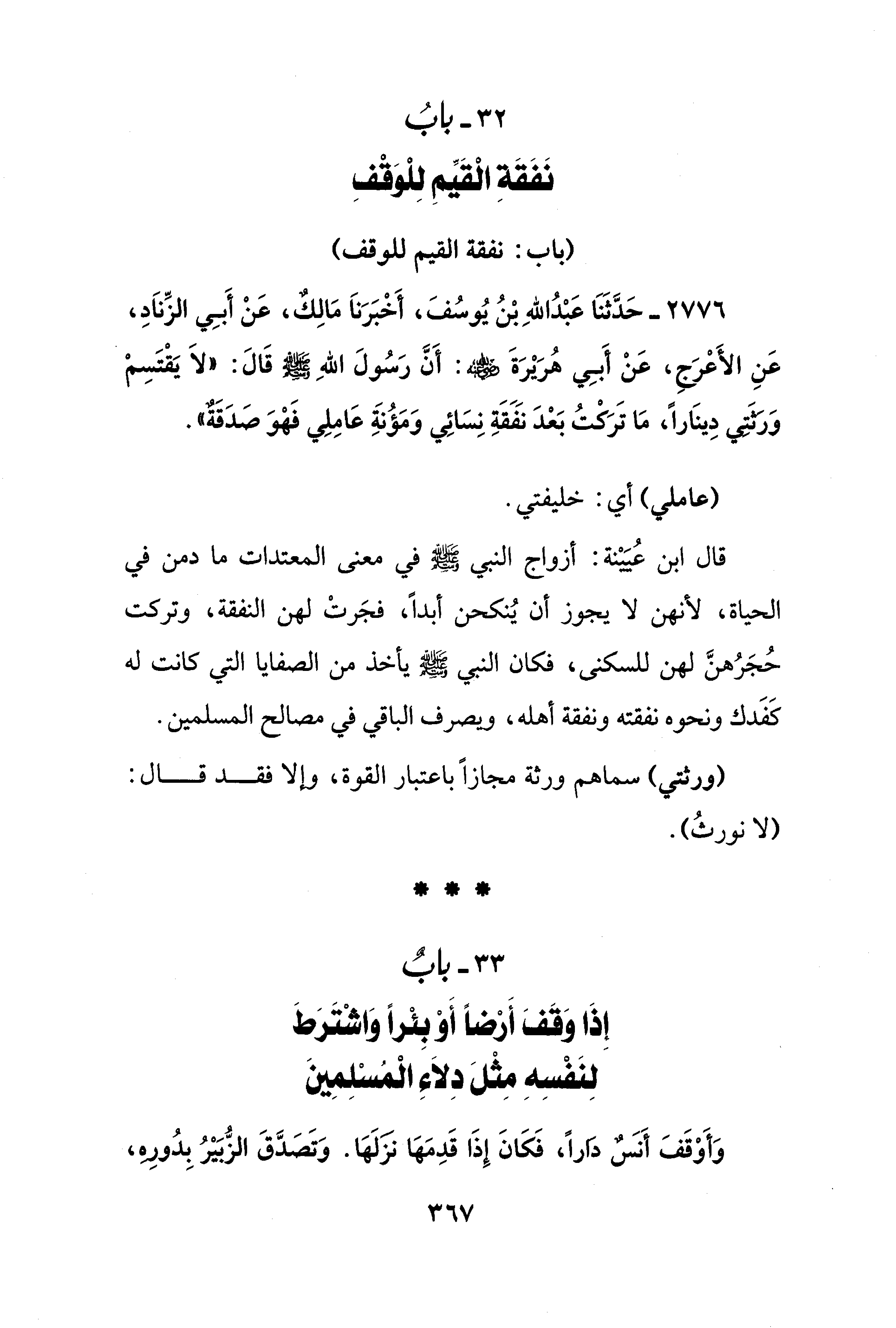 2776 - حَدَّثَنَا عَبْدُ اللهِ بْنُ يُوسُفَ، أَخْبَرَنَا مَالِكٌ، عَنْ أَبِي الزِّناَدِ، عَنِ الأَعْرَج، عَنْ أَبِي هُرَيْرَةَ - صلى الله عليه وسلم -: أَنَّ رَسُولَ اللهِ - صلى الله عليه وسلم - قَالَ: "لاَ يَقْتَسِمْ وَرثتي دِينَارًا، مَا تَرَكْتُ بَعْدَ نَفَقَةِ نِسَائِي وَمَؤُنَةِ عَامِلِي فَهْوَ صَدَقَةٌ".