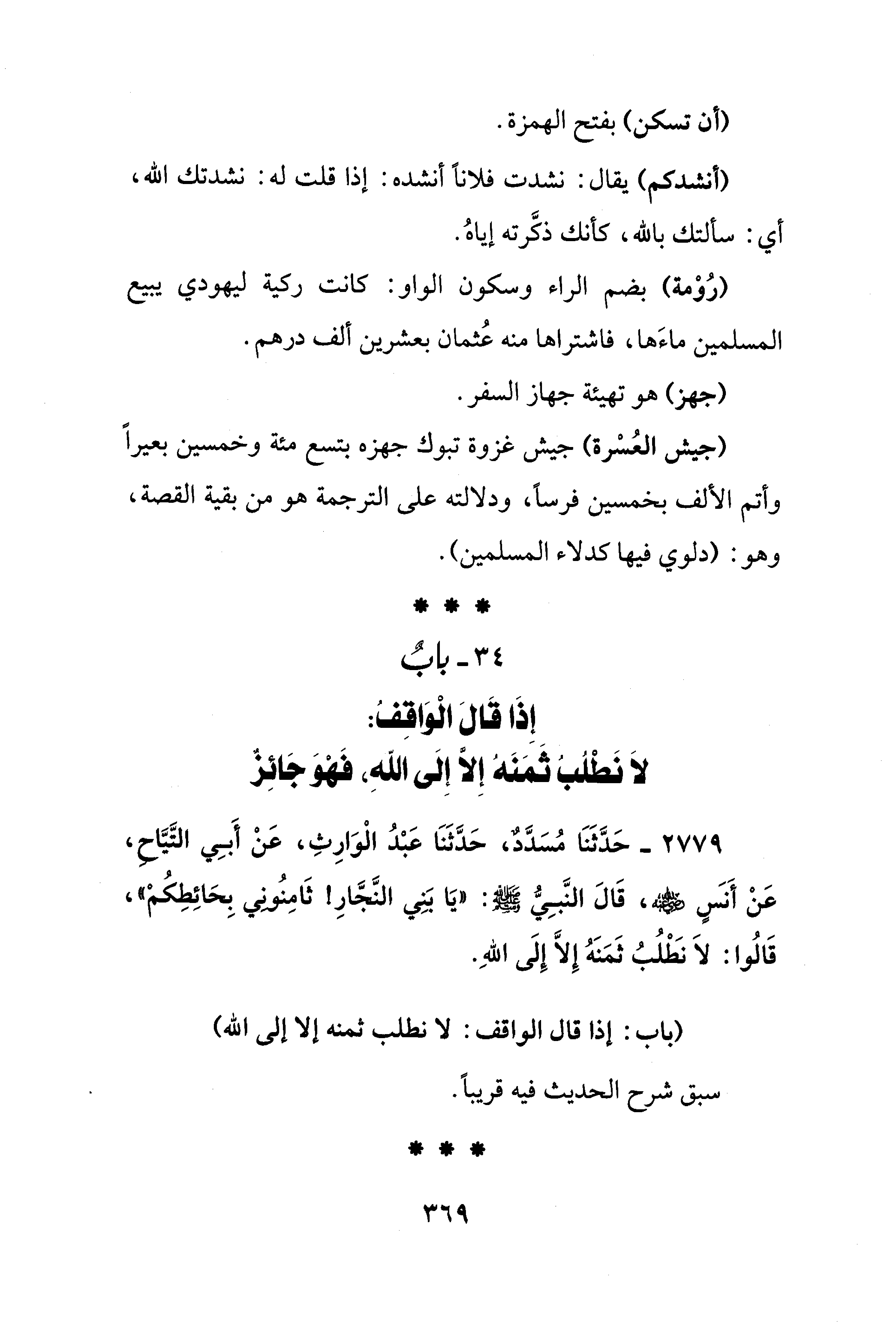 2779 - حَدَّثَنَا مُسَدَّدٌ، حَدَّثَنَا عَبْدُ الْوَارِثِ، عَنْ أَبِي التَّيَّاحِ، عَنْ أَنسٍ - رضي الله عنه -، قَالَ النَّبِيُّ - صلى الله عليه وسلم -: "يَا بَنِي النَّجَّارِ! ثَامِنُوني بِحَائِطِكُمْ"، قَالُوا: لاَ نَطْلُبُ ثَمَنَهُ إلَّا إِلَى اللهِ.