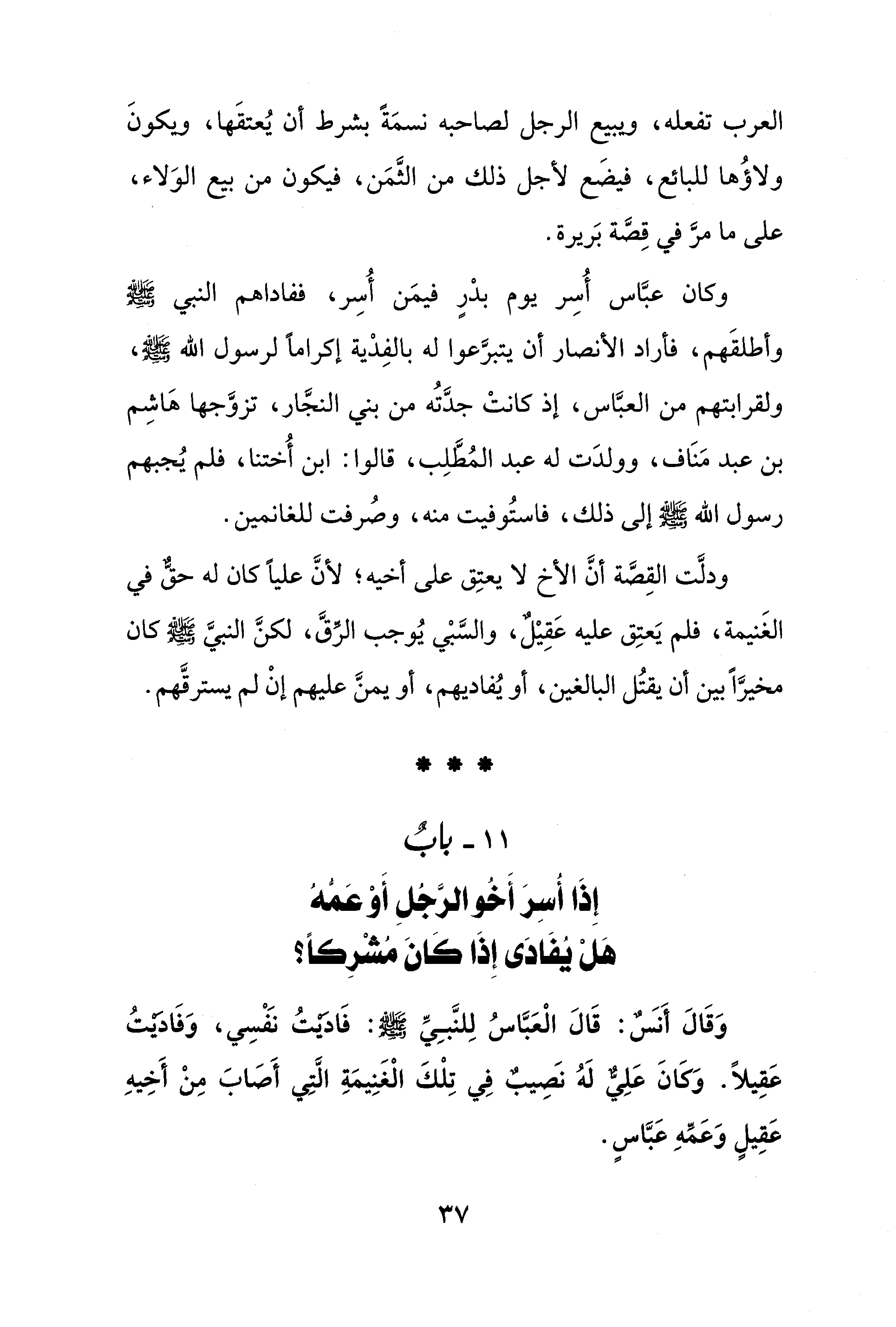 ودلَّت القِصة أنَّ الأخ لا يعتِق على أخيه؛ لأنَّ عليًّا كان له حقٌّ في الغَنيمة، فلم يَعتِق عليه عَقِيْلٌ، والسَّبْي يُوجب الرِّقَّ، لكنَّ النبيَّ - صلى الله عليه وسلم - كان مخيرًا بين أن يقتُل البالغين، أو يُفاديهم، أو يمنَّ عليهم إنْ لم يسترقَّهم.