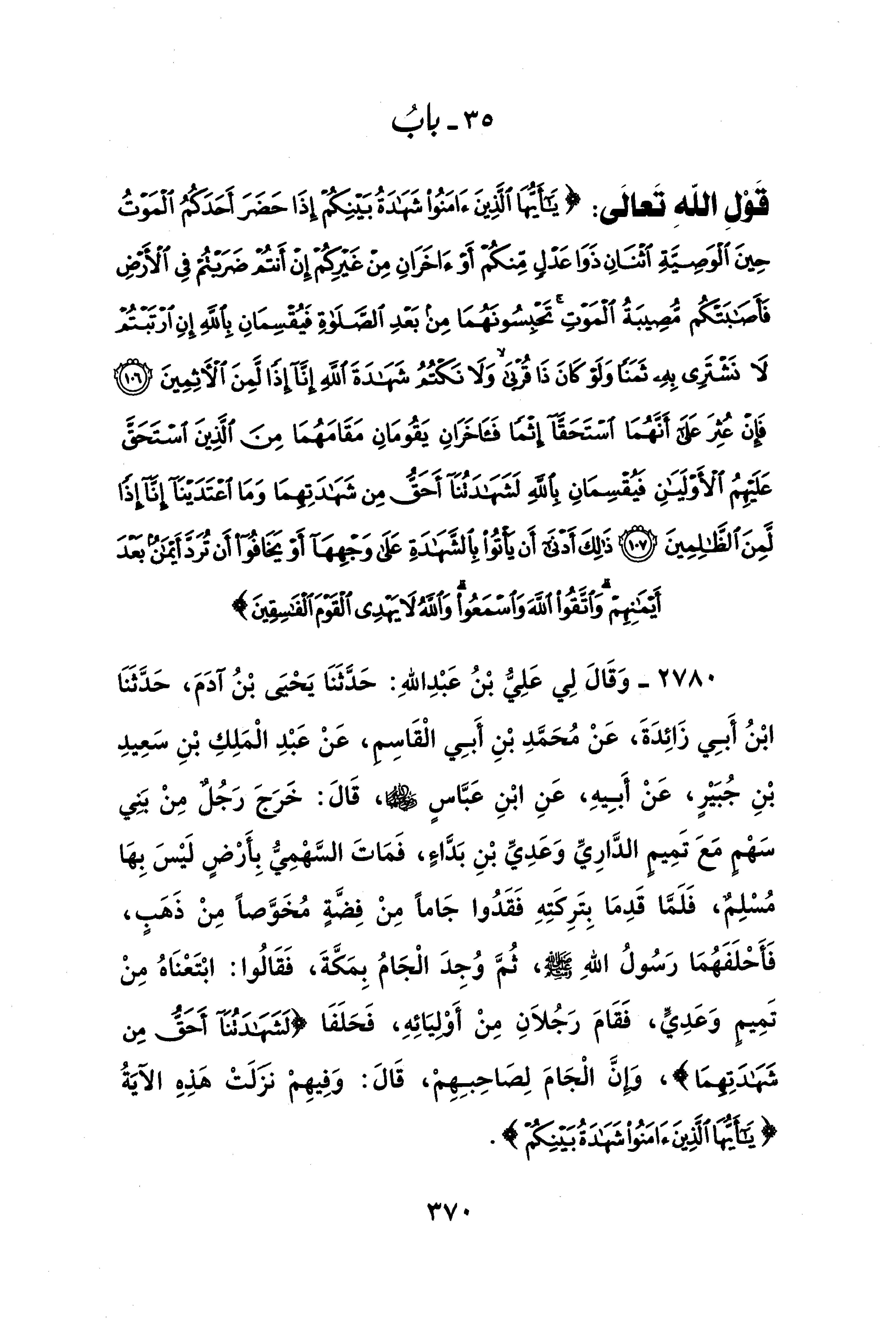 35 - بابُ قولِ الله تَعالَى: {يَا أَيُّهَا الَّذِينَ آمَنُوا شَهَادَةُ بَيْنِكُمْ إِذَا حَضَرَ أَحَدَكُمُ الْمَوْتُ حِينَ الْوَصِيَّةِ اثْنَانِ ذَوَا عَدْلٍ مِنْكُمْ أَوْ آخَرَانِ مِنْ غَيْرِكُمْ إِنْ أَنْتُمْ ضَرَبْتُمْ فِي الْأَرْضِ فَأَصَابَتْكُمْ مُصِيبَةُ الْمَوْتِ تَحْبِسُونَهُمَا مِنْ بَعْدِ الصَّلَاةِ فَيُقْسِمَانِ بِاللَّهِ إِنِ ارْتَبْتُمْ لَا نَشْتَرِي بِهِ ثَمَنًا وَلَوْ كَانَ ذَا قُرْبَى وَلَا نَكْتُمُ شَهَادَةَ اللَّهِ إِنَّا إِذًا لَمِنَ الْآثِمِينَ (106) فَإِنْ عُثِرَ عَلَى أَنَّهُمَا اسْتَحَقَّا إِثْمًا فَآخَرَانِ يَقُومَانِ مَقَامَهُمَا مِنَ الَّذِينَ اسْتَحَقَّ عَلَيْهِمُ الْأَوْلَيَانِ فَيُقْسِمَانِ بِاللَّهِ لَشَهَادَتُنَا أَحَقُّ مِنْ شَهَادَتِهِمَا وَمَا اعْتَدَيْنَا إِنَّا إِذًا لَمِنَ الظَّالِمِينَ (107) ذَلِكَ أَدْنَى أَنْ يَأْتُوا بِالشَّهَادَةِ عَلَى وَجْهِهَا أَوْ يَخَافُوا أَنْ تُرَدَّ أَيْمَانٌ بَعْدَ أَيْمَانِهِمْ وَاتَّقُوا اللَّهَ وَاسْمَعُوا وَاللَّهُ لَا يَهْدِي الْقَوْمَ الْفَاسِقِينَ}