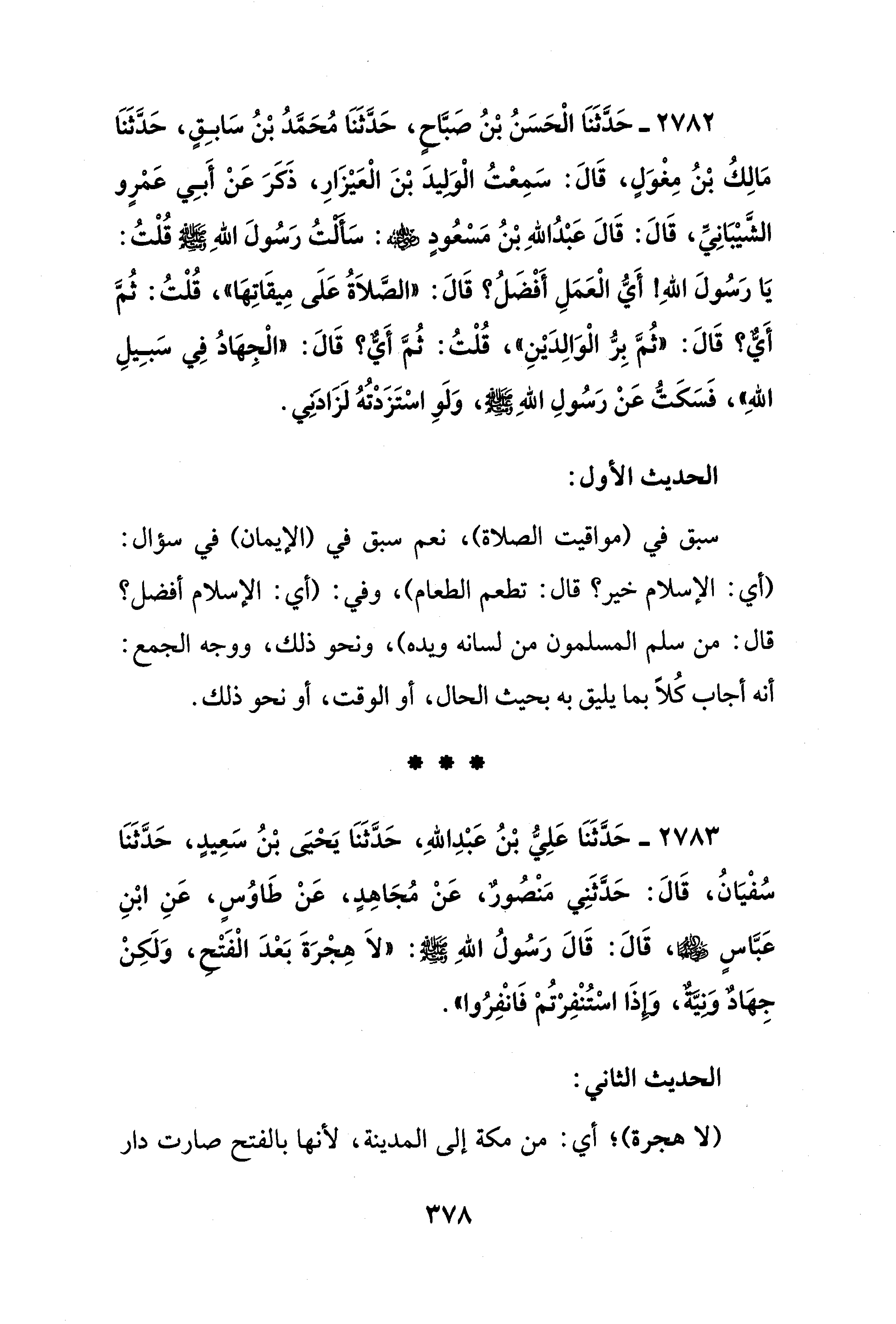 2783 - حَدَّثَنَا عَلِيُّ بْنُ عَبْدِ اللهِ، حَدَّثَنَا يَحْيَى بْنُ سَعِيدٍ، حَدَّثَنَا سُفْيَانُ، قَالَ: حَدَّثَنِي مَنْصُورٌ، عَنْ مُجَاهِدٍ، عَنْ طَاوُسٍ، عَنِ ابْنِ عَبَّاسٍ - رضي الله عنهما -، قَالَ: قَالَ رَسُولُ اللهِ - صلى الله عليه وسلم -: "لاَ هجْرَةَ بَعْدَ الْفَتْح، وَلَكِنْ جِهَادٌ وَنيَّةٌ، وَإِذَا اسْتُنْفِرْتُمْ فَانْفِرُوا".