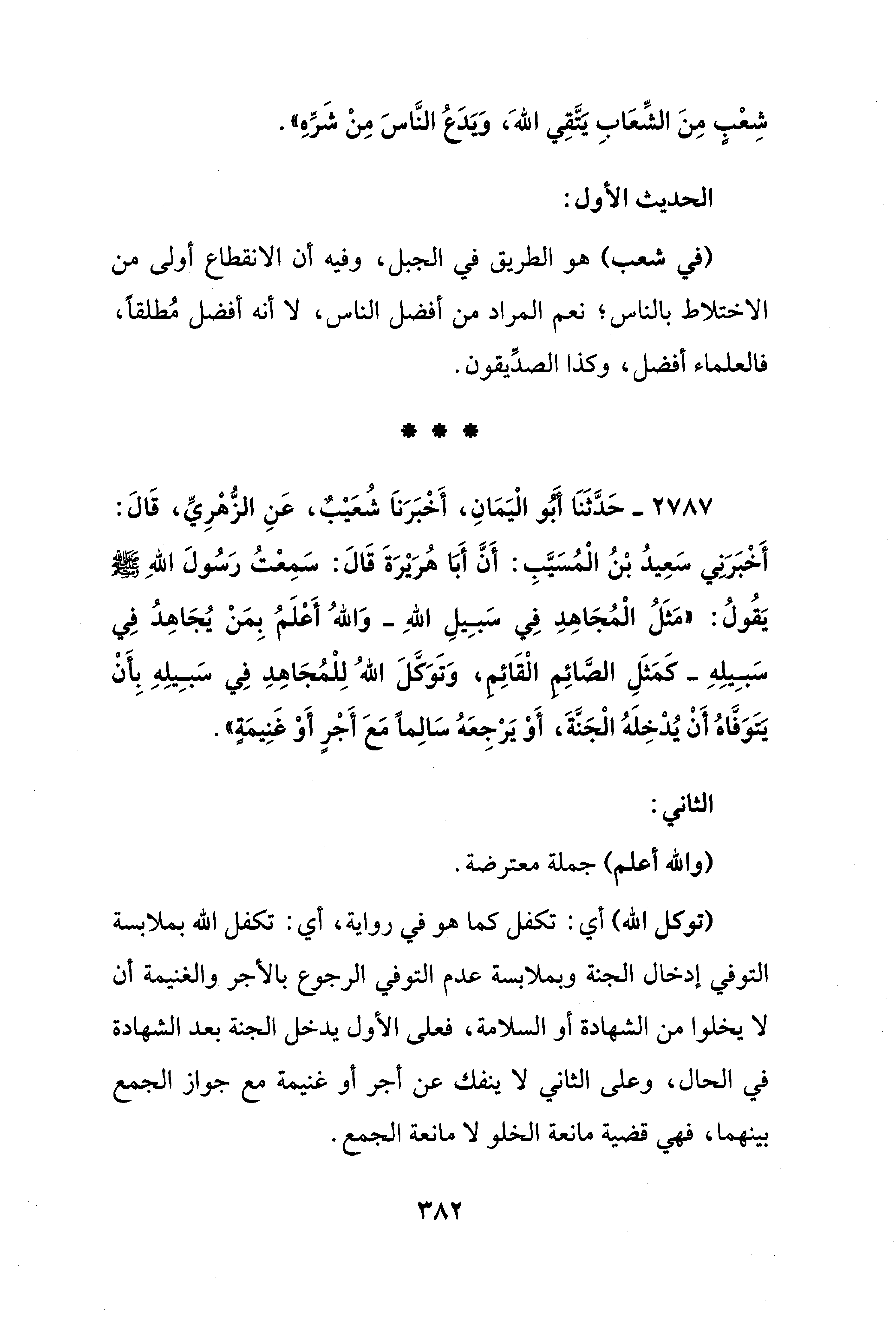 2787 - حَدَّثَنَا أَبُو الْيَمَانِ، أَخْبَرَنَا شُعَيْبٌ، عَنِ الزُّهْرِيِّ، قَالَ: أَخْبَرَنَي سَعِيدُ بْنُ الْمُسَيَّبِ: أَنَّ أَبَا هُرَيْرَةَ قَالَ: سَمِعْتُ رَسُولَ اللهِ - صلى الله عليه وسلم - يَقُولُ: "مَثَلُ الْمُجَاهِدِ فِي سَبِيلِ اللهِ -وَاللهُ أَعْلَمُ بِمَنْ يُجَاهِدُ فِي سَبِيلِهِ- كمَثَلِ الصَّائِم الْقَائِم، وَتَوَكَّلَ اللهُ لِلْمُجَاهِدِ فِي سَبِيلِهِ بِأَنْ يَتَوَفَّاهُ أَنْ يُدْخِلَهُ الْجَنَّةَ، أَوْ يَرْجِعَهُ سَالِمًا مَعَ أَجْرٍ أَوْ غَنِيمَةٍ".