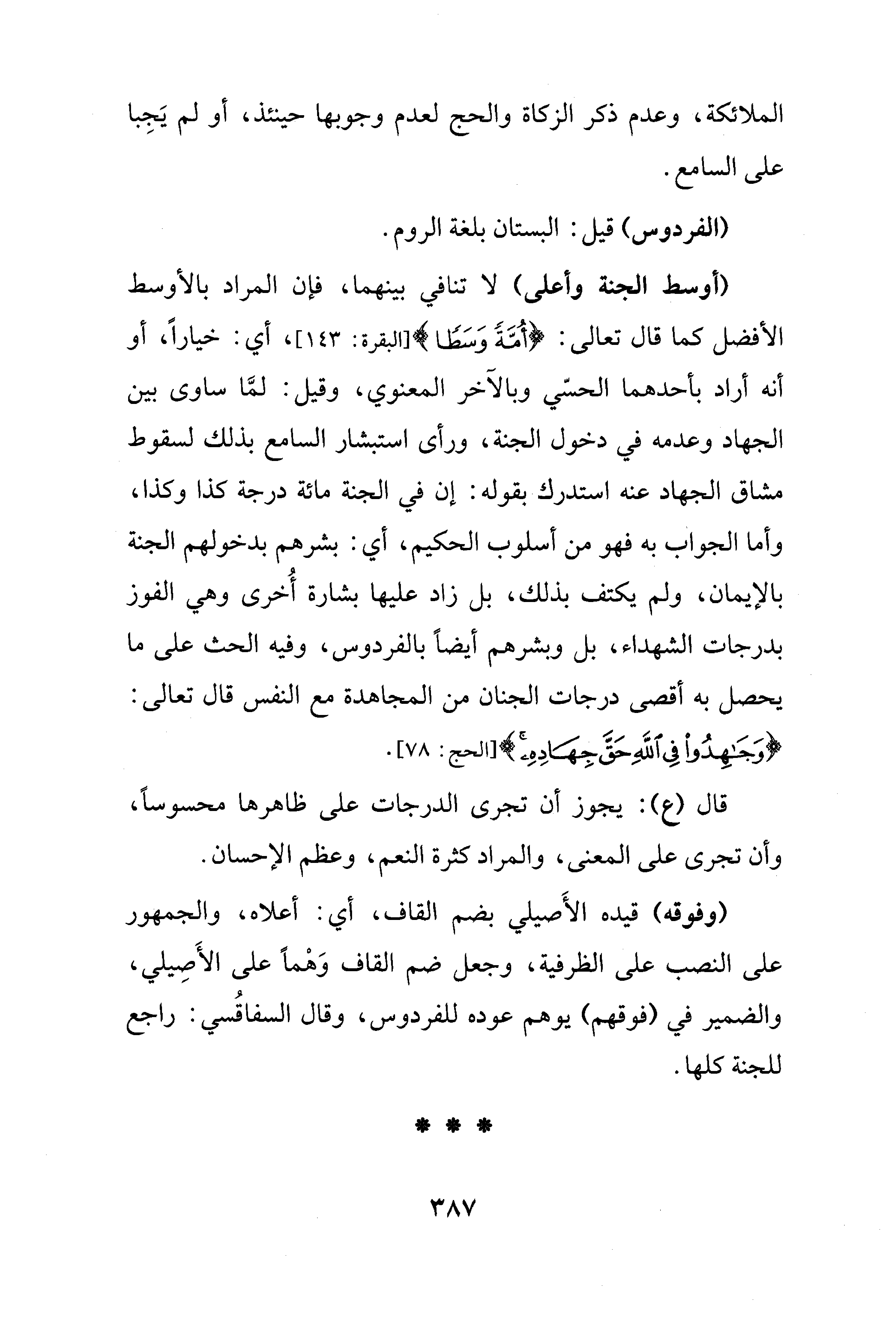 (أوسط الجنة وأعلى) لا تنافي بينهما، فإن المراد بالأوسط الأفضل كما قال تعالى: {أُمَّةً وَسَطًا} [البقرة: 143]، أي: خيارًا، أو أنه أراد بأحدهما الحسّي وبالآخر المعنوي، وقيل: لمَّا ساوى بين الجهاد وعدمه في دخول الجنة، ورأى استبشار السامع بذلك لسقوط مشاق الجهاد عنه استدرك بقوله: إن في الجنة مائة درجة كذا وكذا، وأما الجواب به فهو من أسلوب الحكيم، أي: بشرهم بدخولهم الجنة بالإيمان، ولم يكتف بذلك، بل زاد عليها بشارة أُخرى وهي الفوز بدرجات الشهداء، بل وبشرهم أيضًا بالفردوس، وفيه الحث على ما يحصل به أقصى درجات الجنان من المجاهدة مع النفس قال تعالى: {وَجَاهِدُوا فِي اللَّهِ حَقَّ جِهَادِهِ} [الحج: 78].