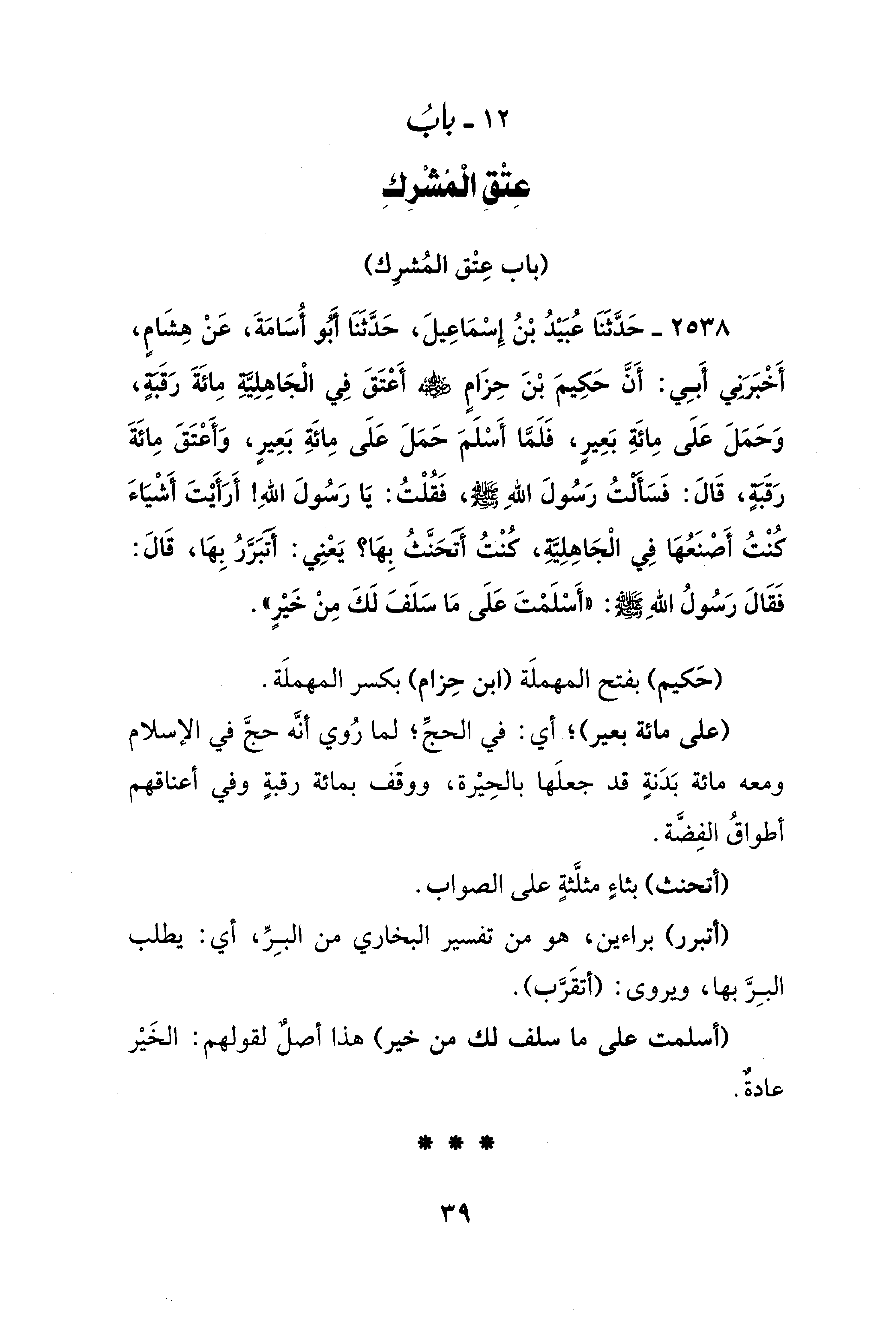 2538 - حَدَّثَنَا عُبَيْدُ بْنُ إِسْمَاعِيلَ، حَدَّثَنَا أبو أُسَامَةَ، عَنْ هِشَامٍ، أَخْبَرني أَبِي: أَنَّ حَكِيمَ بْنَ حِزَاِم - رضي الله عنه - أَعْتَقَ فِي الْجَاهِلِيَّةِ مِائَةَ رَقَبةٍ، وَحَمَلَ عَلَى مِائَةِ بَعِيرٍ، فَلَمَّا أَسْلمَ حَمَلَ عَلَى مِائَةِ بَعِيرٍ، وَأَعْتَقَ مِائَةَ رَقَبةٍ، قَالَ: فَسَألتُ رَسُولَ الله - صلى الله عليه وسلم -، فَقُلْتُ: يَا رَسُولَ الله أَرَأَيْتَ أَشْيَاءَ كُنْتُ أَصْنَعُهَا فِي الْجَاهِلِيَّةِ، كُنْتُ أتحَنَّثُ بِهَا؟ يَعْنِي: أتبَرَّرُ بِهَا، قَالَ: فَقَالَ رَسُولُ اللهِ - صلى الله عليه وسلم -: "أَسْلَمْتَ عَلَى مَا سَلَفَ لَكَ مِنْ خَيْرٍ".