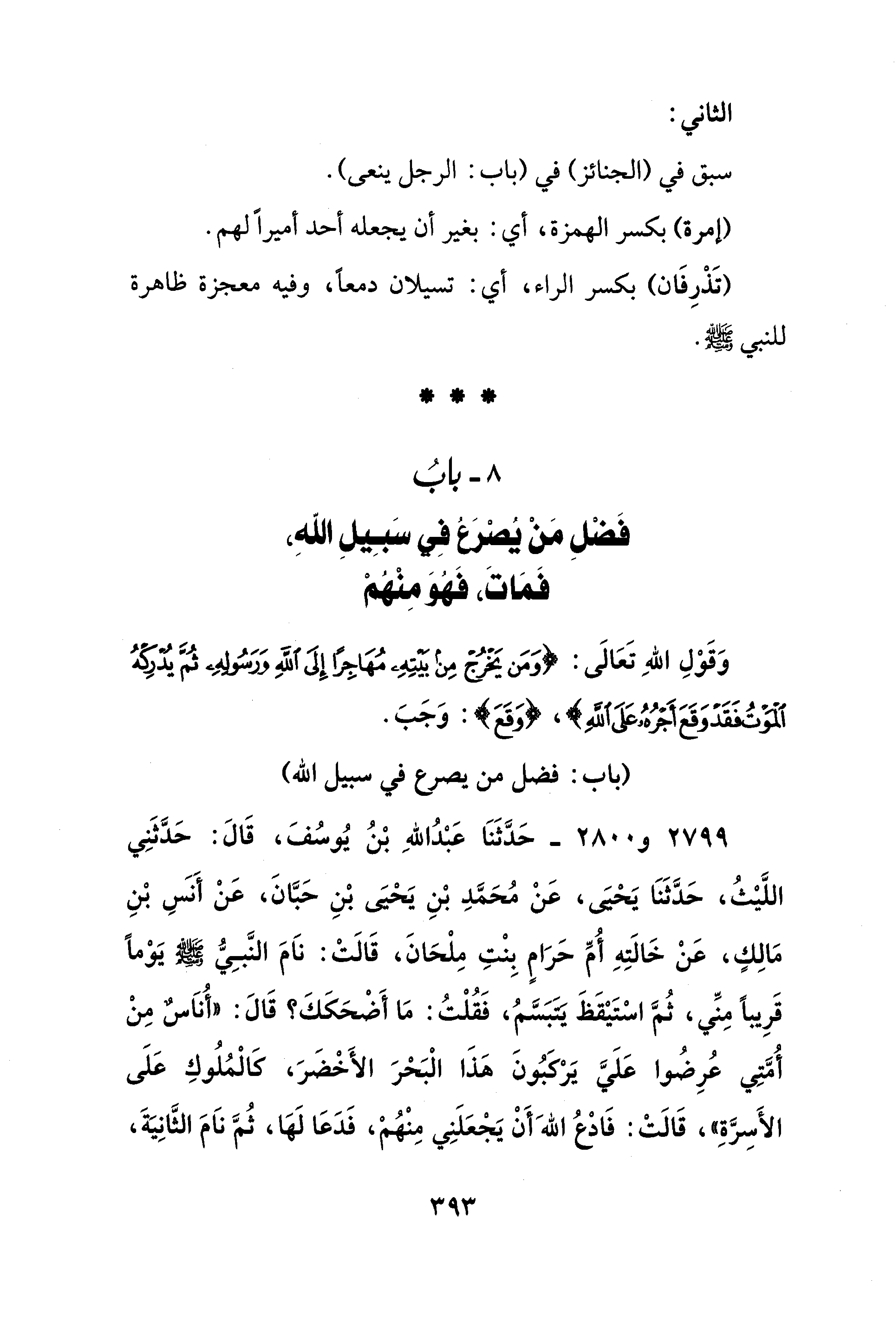 2799 - و 2800 - حَدَّثَنَا عَبْدُ اللهِ بْنُ يُوسُفَ، قَالَ: حَدَّثَنِي اللَّيْثُ، حَدَّثَنَا يَحْيَى، عَنْ مُحَمَّدِ بْنِ يَحْيَى بْنِ حَبَّانَ، عَنْ أَنس بْنِ مَالِكٍ، عَنْ خَالَتِهِ أُمِّ حَرَامٍ بِنْتِ مِلْحَانَ، قَالَتْ: ناَمَ النَّبِيُّ - صلى الله عليه وسلم - يَوْمًا قَرِيبًا مِنِّي، ثُمَّ اسْتَيْقَظَ يتبسَّمُ، فَقُلْتُ: مَا أَضْحَكَكَ؟ قَالَ: "أُنَاسٌ مِنْ أُمَّتِي عُرِضُوا عَلَيَّ يَرْكبُونَ هَذَا الْبَحْرَ الأَخْضَرَ، كَالْمُلُوكِ عَلَى الأَسِرَّةِ"، قَالَتْ: فَادْعُ اللهَ أَنْ يَجْعَلَنِي مِنْهُمْ، فَدَعَا لَهَا، ثُمَّ نَامَ الثَّانِيةَ،