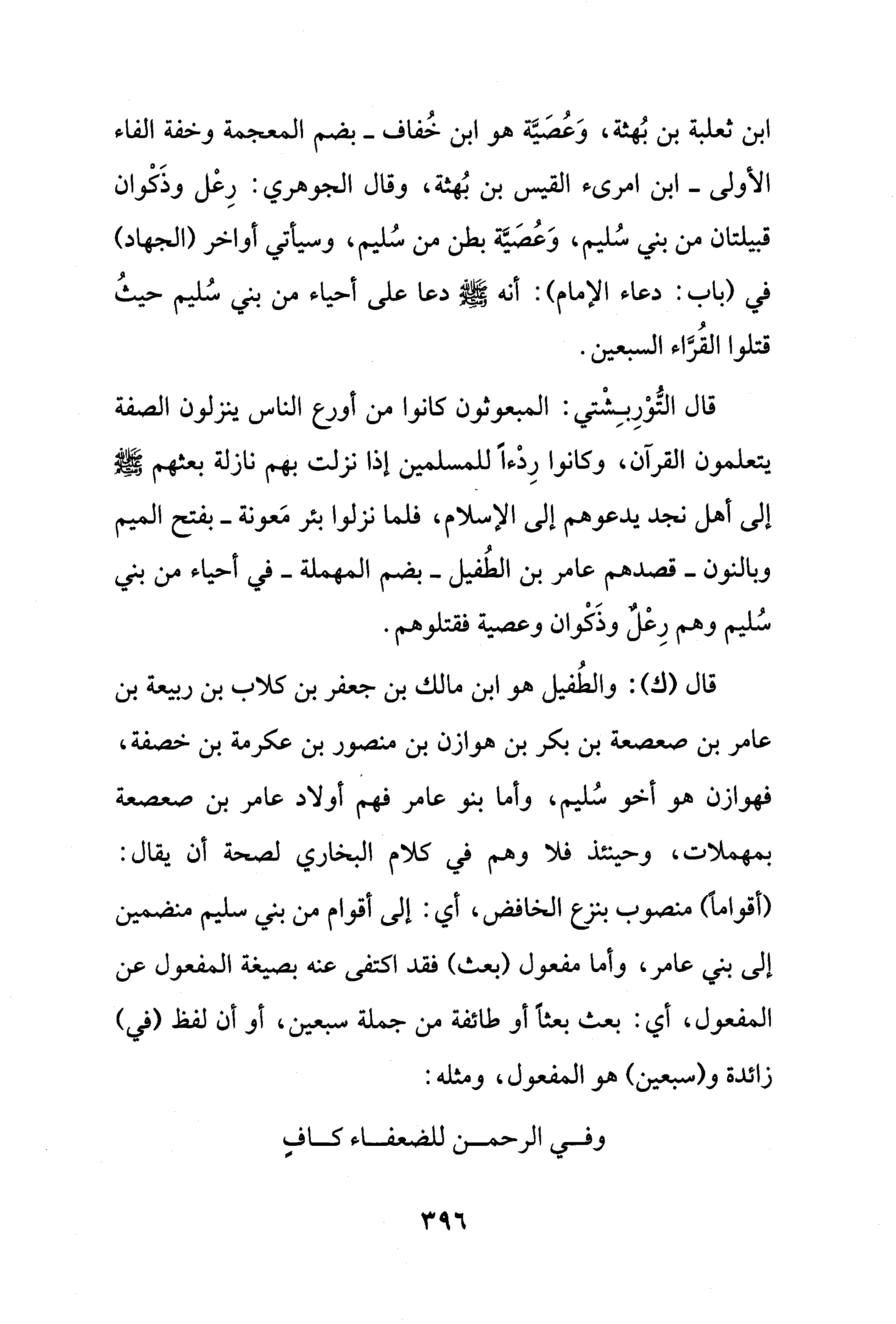 قال (ك): والطُفيل هو ابن مالك بن جعفر بن كلاب بن ربيعة بن عامر بن صعصعة بن بكر بن هوازن بن منصور بن عكرمة بن خصفة، فهوازن هو أخو سُليم، وأما بنو عامر فهم أولاد عامر بن صعصعة بمهملات، وحينئذ فلا وهم في كلام البخاري لصحة أن يقال: (أقوامًا) منصوب بنزع الخافض، أي: إلى أقوام من بني سليم منضمين إلى بني عامر، وأما مفعول (بعث) فقد اكتفى عنه بصيغة المفعول عن المفعول، أي: بعث بعثًا أو طائفة من جملة سبعين، أو أن لفظ (في) زائدة و (سبعين) هو المفعول، ومثله: