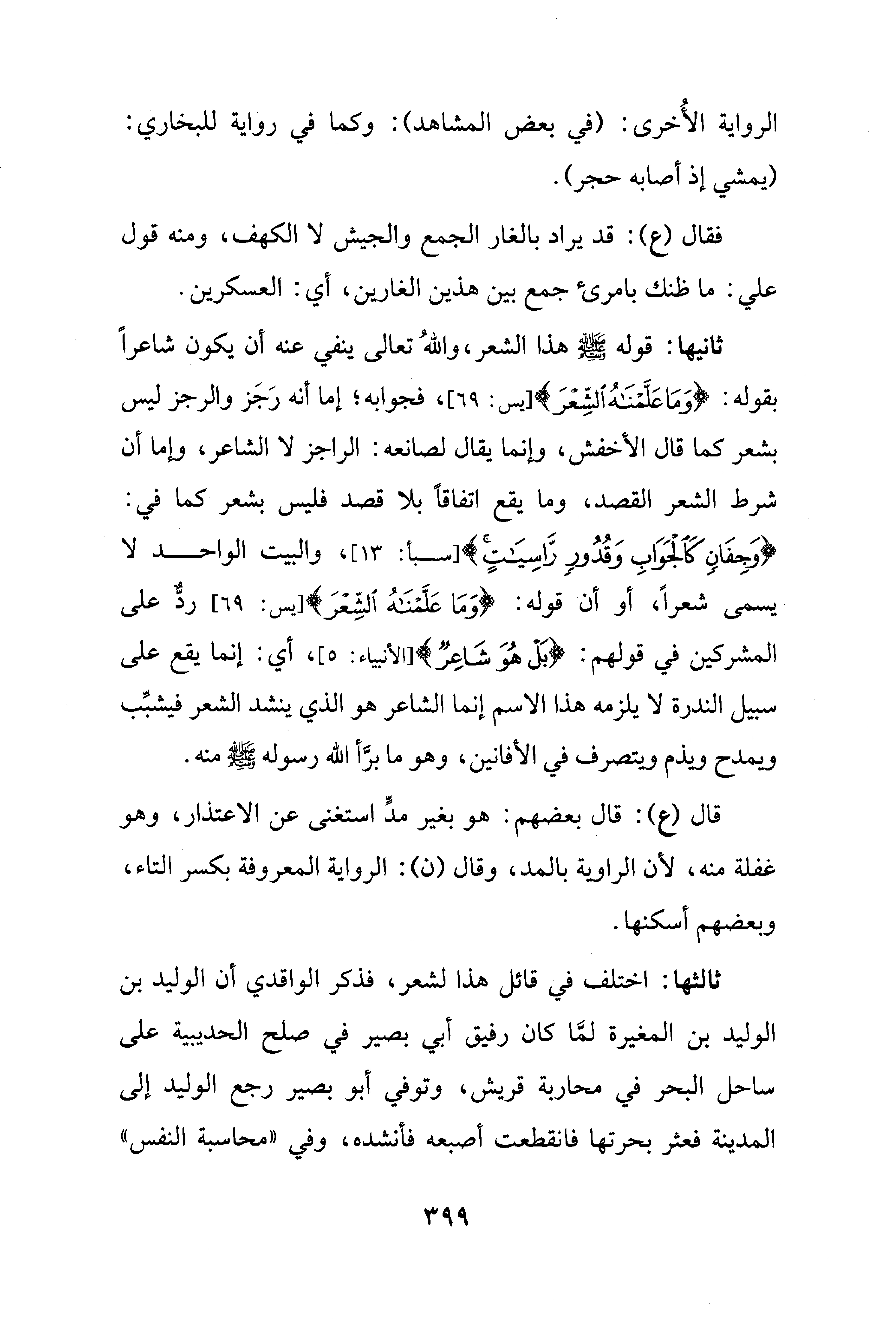 ثانيها: قوله - صلى الله عليه وسلم - هذا الشعر، واللهُ تعالى ينفي عنه أن يكون شاعرًا بقوله: {وَمَا عَلَّمْنَاهُ الشِّعْرَ} [يس: 69] فجوابه؛ إما أنه رَجَز والرجز ليس بشعر كما قال الأخفش، وإنما يقال لصانعه: الراجز لا الشاعر، وإما أن شرط الشعر القصد، وما يقع اتفاقًا بلا قصد فليس بشعر كما في: {وَجِفَانٍ كَالْجَوَابِ وَقُدُورٍ رَاسِيَاتٍ} [سبأ: 13]، والبيت الواحد لا يسمى شعرًا، أو أن قوله: {وَمَا عَلَّمْنَاهُ الشِّعْرَ} [يس: 69] ردٌّ على المشركين في قولهم {بَلْ هُوَ شَاعِرٌ} [الأنبياء: 5]، أي: إنما يقع على سبيل الندرة لا يلزمه هذا الاسم إنما الشاعر هو الذي ينشد الشعر فيشبِّب ويمدح ويذم ويتصرف في الأفانين، وهو ما برَّأ الله رسوله - صلى الله عليه وسلم - منه.