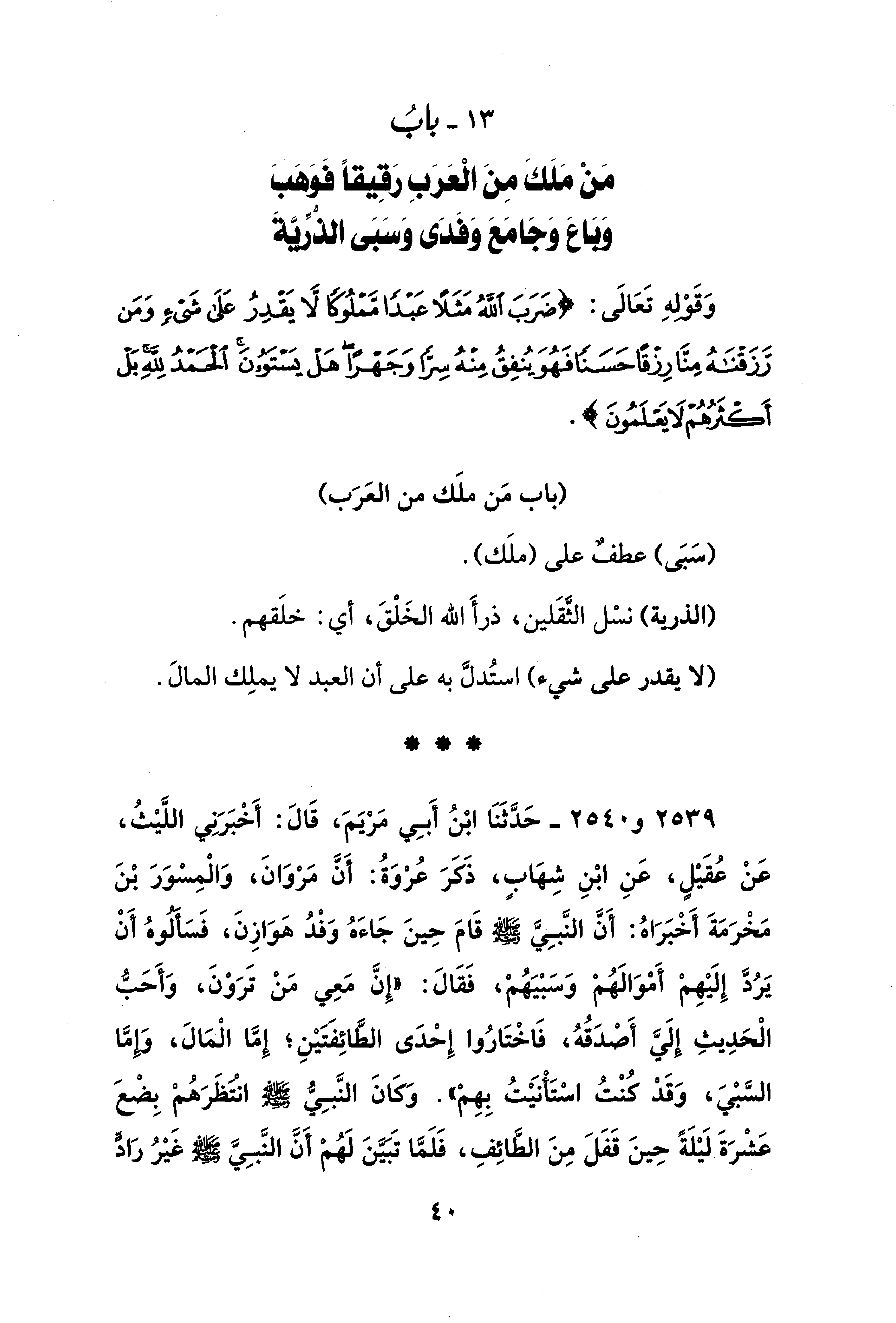 2539 - و 2540 - حَدثَنَا ابنُ أَبِي مَريمَ، قَالَ: أَخْبَرَني اللَّيْثُ، عَنْ عُقَيْلٍ، عَنِ ابْنِ شِهَاب، ذَكَرَ عُرْوَةُ: أَنَّ مَرْوَانَ، وَالْمِسْوَرَ بْنَ مَخْرَمَةَ أَخْبَرَاهُ: أَنَّ النَّبِيَّ - صلى الله عليه وسلم - قَامَ حِينَ جَاءَهُ وَفْدُ هَوَازِنَ، فَسَألوهُ أَنْ يَرُدَّ إِلَيْهِمْ أَمْوَالَهُمْ وَسَبْيَهُمْ، فَقَالَ: "إِنَّ مَعِي مَنْ تَرَوْنَ، وَأَحَبُّ الْحَدِيثِ إِلَيَّ أَصْدَقُهُ، فَاخْتَارُوا إِحْدَى الطَّائِفَتَيْنِ؛ إِمَّا الْمَالَ، وَامَّا السَّبْيَ، وَقَدْ كُنْتُ اسْتَأنيتُ بِهِمْ". وَكَانَ النَّبِيُّ - صلى الله عليه وسلم - انتظَرَهُم بِضْعَ عَشْرَةَ لَيْلَة حِينَ قَفَلَ مِنَ الطَّائِفِ، فَلَمَّا تَبينَ لَهُمْ أَنَّ النَّبِيَّ - صلى الله عليه وسلم - غيْرُ رَادٍّ