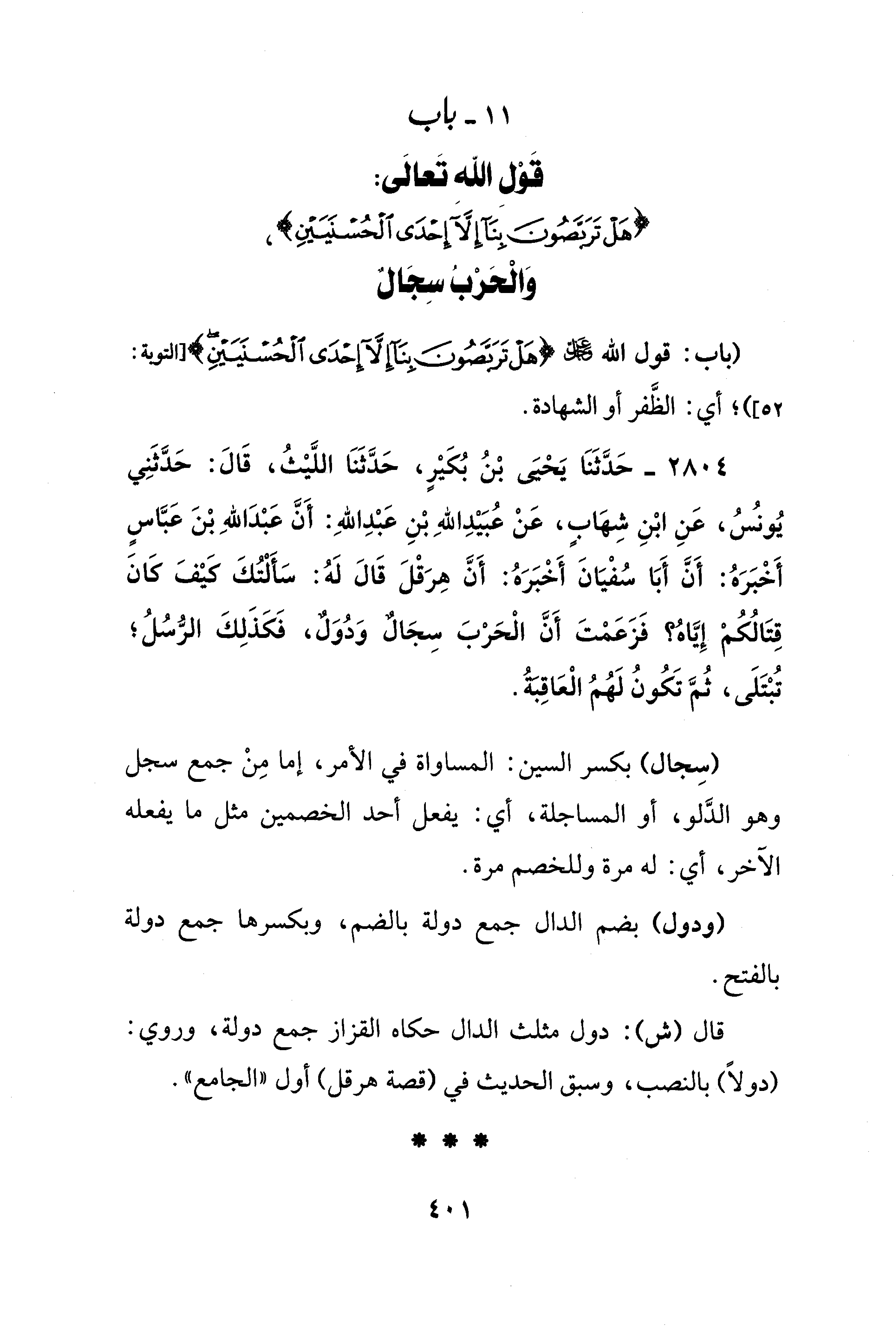 11 - باب قَوْلِ الله تَعالَى: {هَلْ تَرَبَّصُونَ بِنَا إلا إِحْدَى الْحُسْنَيَيْنِ}، وَالْحرْبُ سِجَالٌ