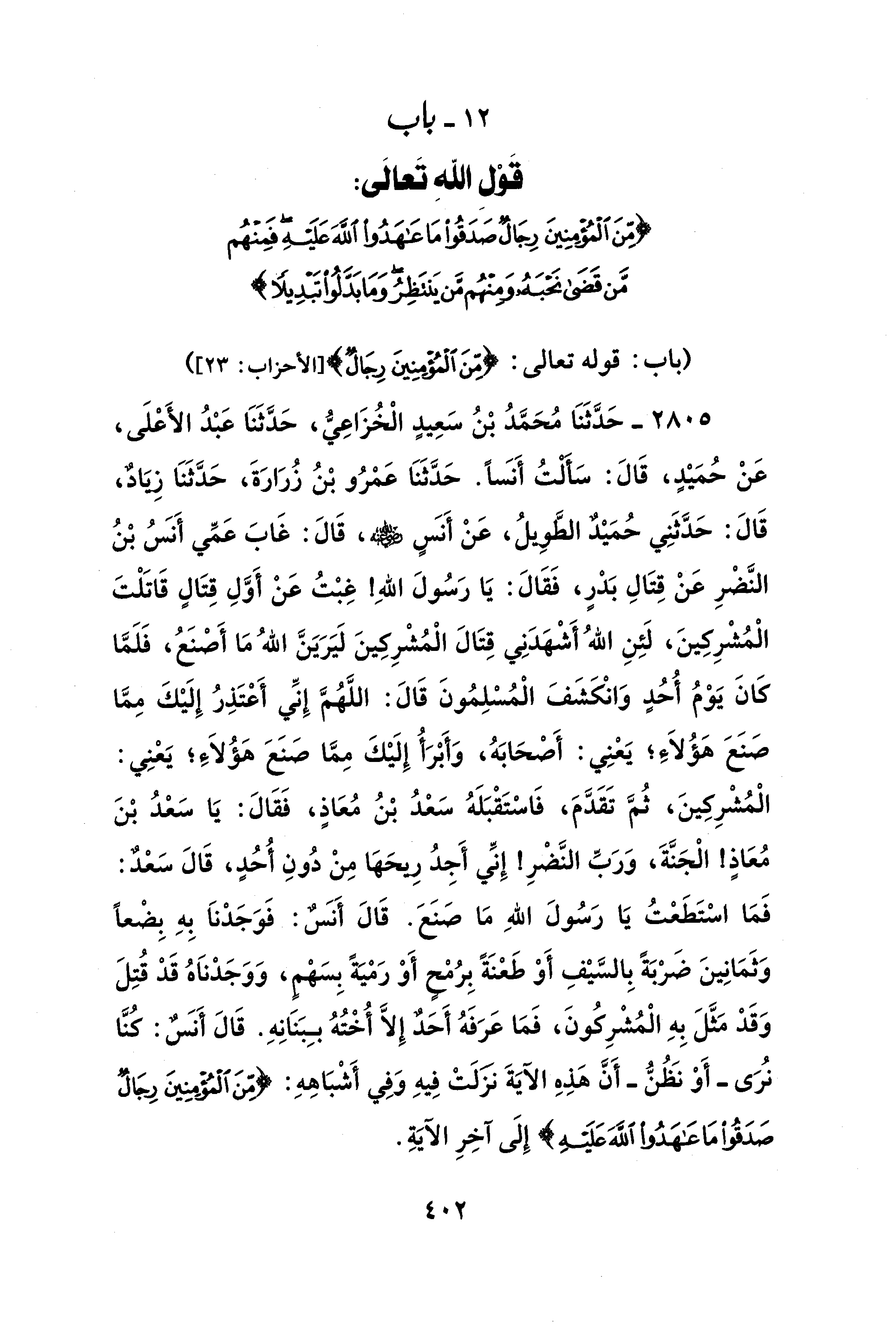 2805 - حَدَّثَنَا مُحَمَّدُ بْنُ سَعِيدٍ الْخُزَاعي، حَدَّثَنَا عَبْدُ الأَعْلَى، عَنْ حُمَيْدٍ، قَالَ: سَألتُ أَنسًا. حَدَّثَنَا عَمْرُو بْنُ زُرَارَةَ، حَدَّثَنَا زِيَادٌ، قَالَ: حَدَّثَنِي حُمَيْدٌ الطَّوِيلُ، عَنْ أَنسٍ - رضي الله عنه -، قَالَ: غَابَ عَمِّي أَنسُ بْنُ النَّضْرِ عَنْ قِتَالِ بَدْرٍ، فَقَالَ: يَا رَسُولَ اللهِ! غبْتُ عَنْ أَوَّلِ قِتَالٍ قَاتَلْتَ الْمُشْرِكينَ، لَئِنِ اللهُ أَشْهَدَنِي قِتَالَ الْمُشْرِكينَ لَيَرَيَنَّ اللهُ مَا أَصْنَعُ، فَلَمَّا كَانَ يَوْمُ أُحُدٍ وَانْكَشَفَ الْمُسْلِمُونَ قَالَ: اللَّهُمَّ إِنِّي أَعْتَذِرُ إِلَيْكَ مِمَّا صَنَعَ هَؤُلاَءِ؛ يَعْنِي: أَصْحَابَهُ، وَأَبْرَأُ إِلَيْكَ مِمَّا صَنَعَ هَؤُلاَءِ؛ يَعْنِي: الْمُشْرِكينَ، ثُمَّ تَقَدَّمَ، فَاسْتَقْبَلَهُ سَعْدُ بْنُ مُعَاذٍ، فَقَالَ: يَا سَعْدُ بْنَ مُعَاذٍ! الْجَنَّةَ، وَرَبِّ النَّضْرِ! إِنِّي أَجِدُ رِيحَهَا مِنْ دُونِ أُحُدٍ، قالَ سَعْد: فَمَا استطَعْتُ يَا رَسُولَ اللهِ مَا صَنَعَ. قَالَ أَنسٌ: فَوَجَدْناَ بِهِ بِضْعًا وَثَمَانِينَ ضَرْبَةً بِالسَّيْفِ أَوْ طَعْنَةً بِرُمْحٍ أَوْ رَمْيةً بِسَهْمٍ، وَوَجَدْناَهُ قَدْ قُتِلَ وَقَدْ مَثَّلَ بِهِ الْمُشْرِكُونَ، فَمَا عَرَفَهُ أَحَدٌ إِلَّا أختُهُ بِبَنَانِهِ. قَالَ أَنسٌ: كنَّا نُرَى -أَوْ نظُنُّ- أَنَّ هَذِهِ الآيَةَ نزَلَتْ فِيهِ وَفِي أَشْبَاهِهِ: {مِنَ الْمُؤْمِنِينَ رِجَالٌ صَدَقُوا مَا عَاهَدُوا اللَّهَ عَلَيْهِ} إِلَى آخِرِ الآيَةِ.