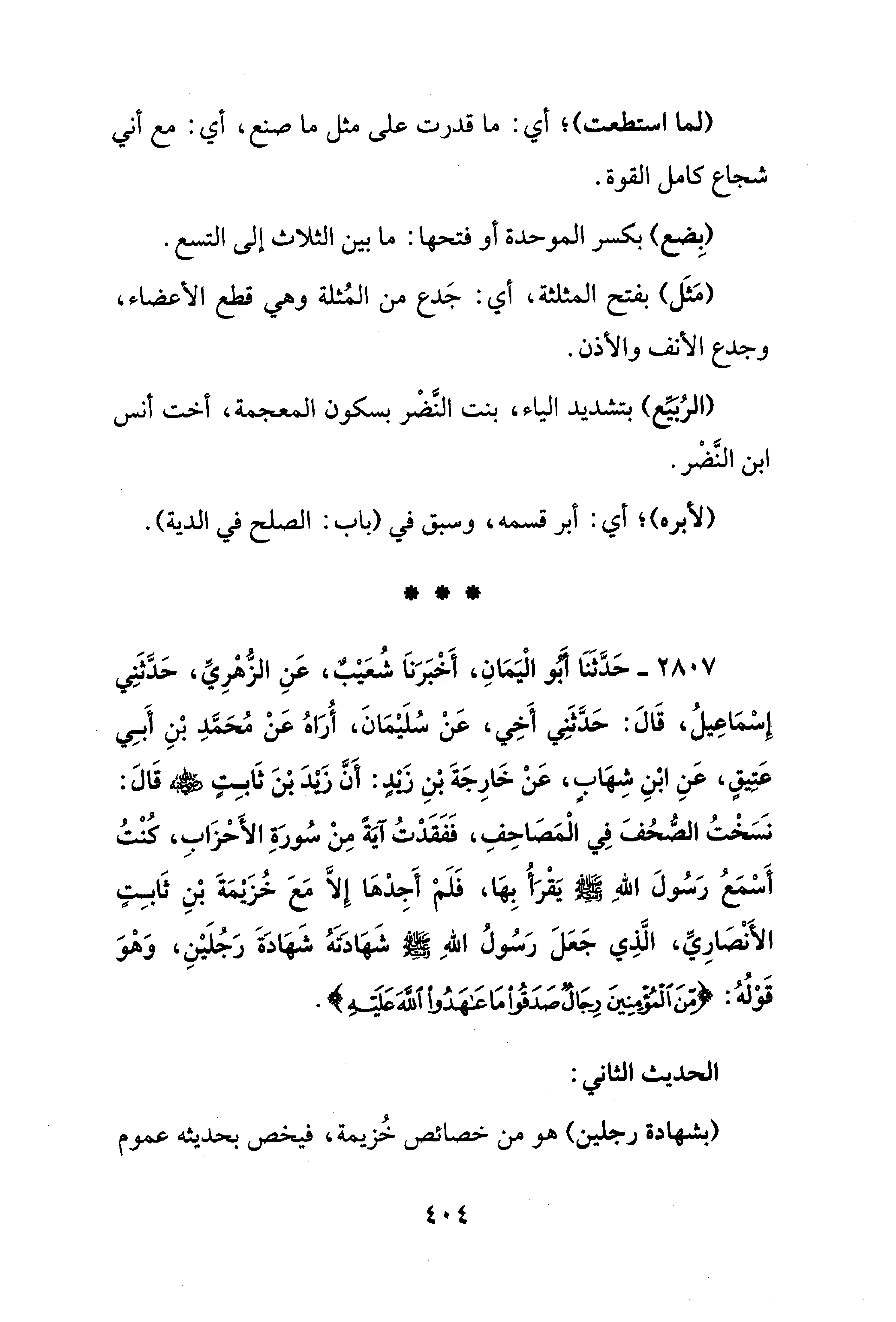 2807 - حَدَّثَنَا أبو الْيَمَانِ، أَخْبَرَنَا شُعَيْبٌ، عَنِ الزُّهْرِيِّ، حَدَّثَنِي إِسْمَاعِيلُ، قَالَ: حَدَّثَنِي أَخِي، عَنْ سُلَيْمَانَ، أُرَاهُ عَنْ مُحَمَّدِ بْنِ أَبِي عَتِيقٍ، عَنِ ابْنِ شِهَابٍ، عَنْ خَارِجَةَ بْنِ زيدٍ: أَنَّ زيدَ بْنَ ثَابِتٍ - رضي الله عنه - قَالَ: نَسَخْتُ الصُّحُفَ فِي الْمَصَاحِفِ، فَفَقَدْتُ آيَةً مِنْ سُورَةِ الأَحْزَابِ، كُنْتُ أَسْمَعُ رَسُولَ اللهِ - صلى الله عليه وسلم - يَقْرَأُ بِهَا، فَلَمْ أَجِدْهَا إِلَّا مَعَ خُزَيْمَةَ بْنِ ثَابِتٍ الأَنْصَارِيِّ، الَّذِي جَعَلَ رَسُولُ اللهِ - صلى الله عليه وسلم - شَهَادَتَهُ شَهَادَةَ رَجُلَيْنِ، وَهْوَ قَوْلُهُ: {مِنَ الْمُؤْمِنِينَ رِجَالٌ صَدَقُوا مَا عَاهَدُوا اللَّهَ عَلَيْهِ}.
