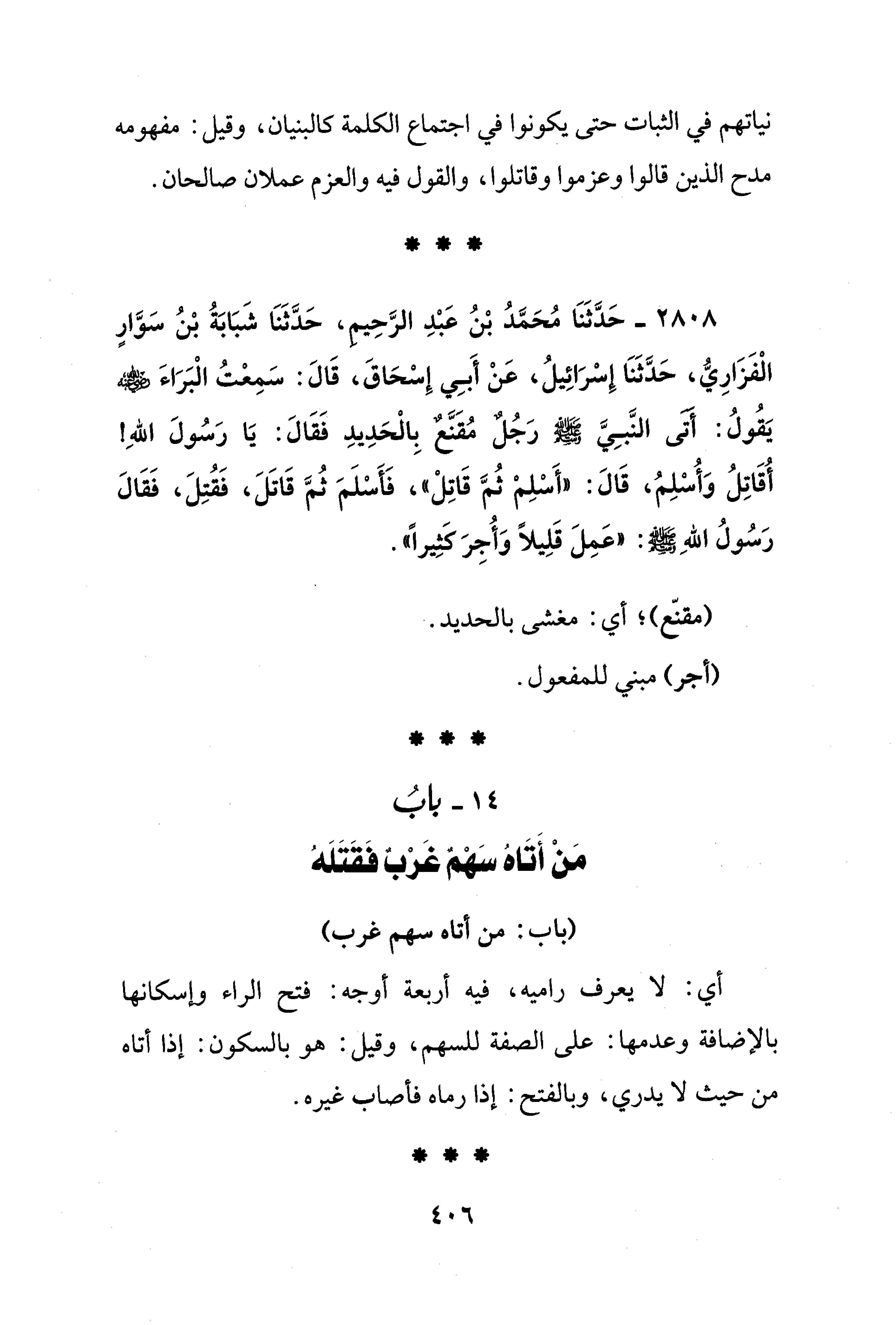 2808 - حَدَّثَنَا مُحَمَّدُ بْنُ عَبْدِ الرَّحِيم، حَدَّثَنَا شَبَابَةُ بْنُ سَوَّارٍ الْفَزَارِيُّ، حَدَّثَنَا إِسْرَائِيلُ، عَنْ أَبِي إِسْحَاقَ، قَالَ: سَمِعْتُ الْبَرَاءَ - رضي الله عنه - يَقُولُ: أَتَى النَّبِيَّ - صلى الله عليه وسلم - رَجُلٌ مُقَنَّعٌ بِالْحَدِيدِ فَقَالَ: يَا رَسُولَ اللهِ! أُقَاتِلُ وَأُسْلِمُ، قَالَ: "أَسْلِمْ ثُمَّ قَاتِلْ"، فَأَسْلَمَ ثُمَّ قَاتَلَ، فَقُتِلَ، فَقَالَ رَسُولُ اللهِ - صلى الله عليه وسلم -: "عَمِلَ قَلِيلًا وَأُجِرَ كَثِيرًا".