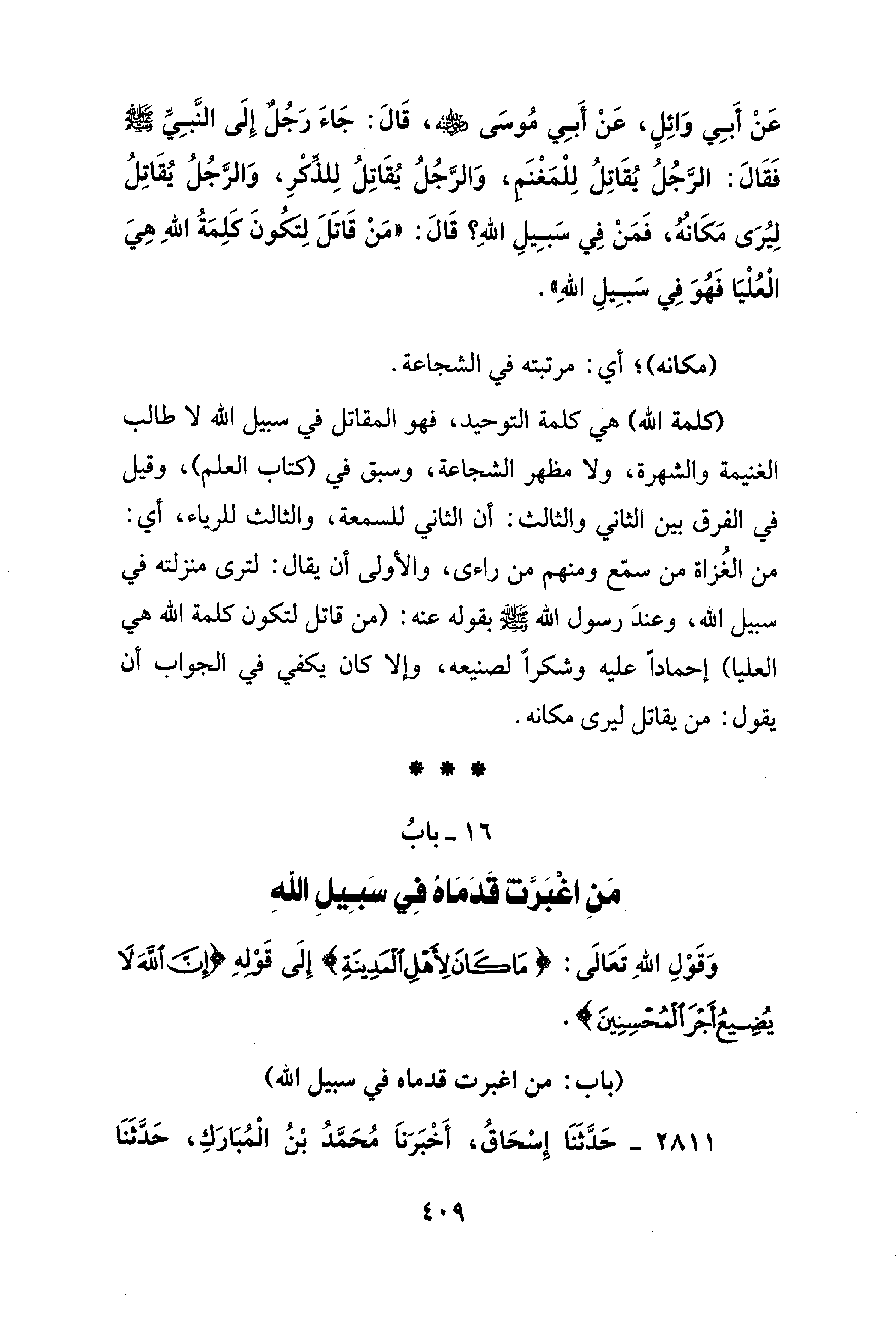 عَنْ أَبِي وَائِلٍ، عَنْ أَبِي مُوسَى - رضي الله عنه -، قَالَ: جَاءَ رَجُلٌ إِلَى النَّبِيِّ - صلى الله عليه وسلم - فَقَالَ: الرَّجُلُ يُقَاتِلُ لِلْمَغْنَمِ، وَالرَّجُلُ يُقَاتِلُ لِلذِّكْرِ، وَالرَّجُلُ يُقَاتِلُ لِيُرَى مَكَانُهُ، فَمَنْ فِي سَبِيلِ اللهِ؟ قَالَ: "مَنْ قَاتَلَ لِتكُونَ كَلِمَةُ اللهِ هِيَ الْعُلْيَا فَهُوَ فِي سَبِيلِ اللهِ".