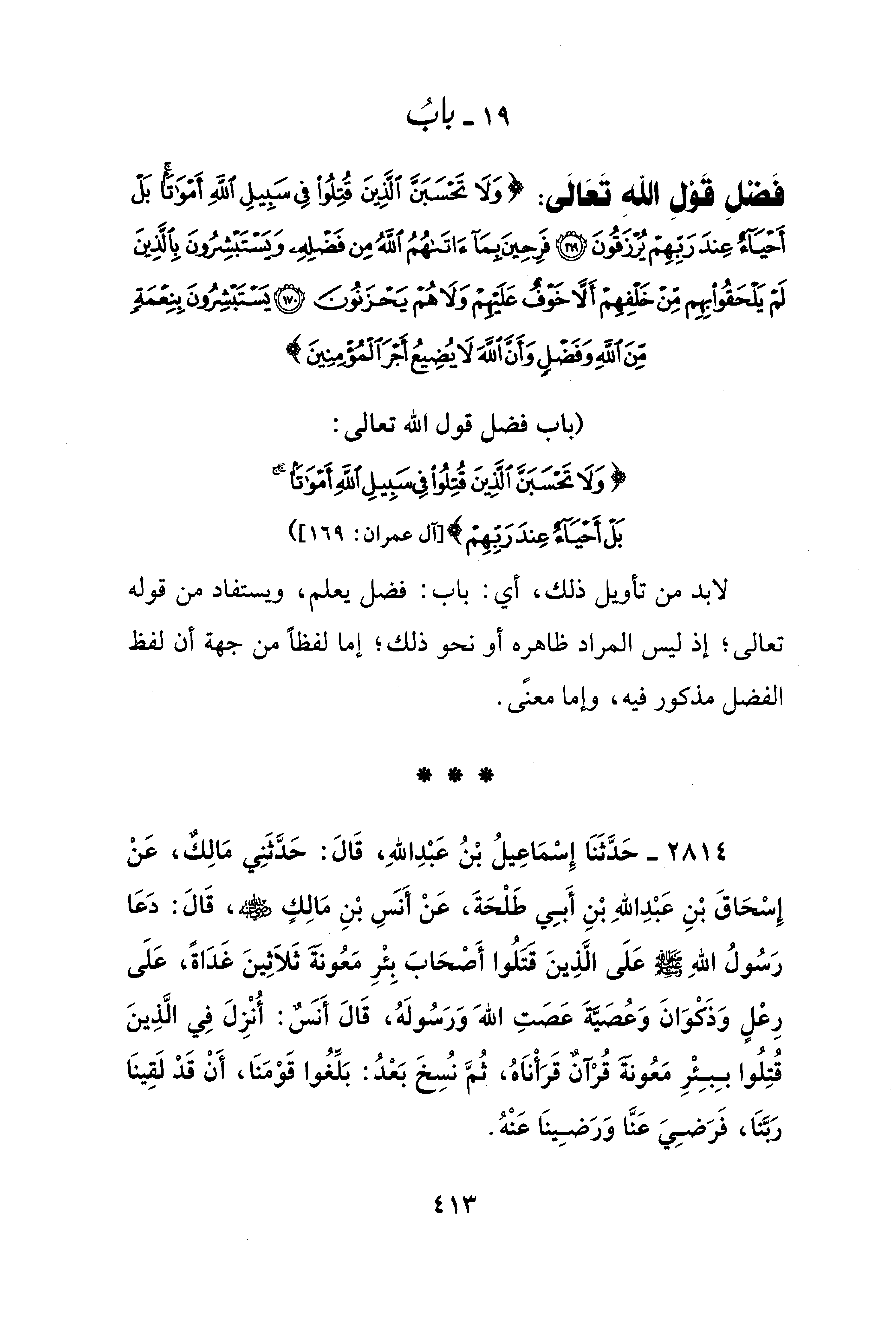 19 - بابُ فَضْلِ قَوْلِ اللهِ تَعَالَى: {وَلَا تَحْسَبَنَّ الَّذِينَ قُتِلُوا فِي سَبِيلِ اللَّهِ أَمْوَاتًا بَلْ أَحْيَاءٌ عِنْدَ رَبِّهِمْ يُرْزَقُونَ (169) فَرِحِينَ بِمَا آتَاهُمُ اللَّهُ مِنْ فَضْلِهِ وَيَسْتَبْشِرُونَ بِالَّذِينَ لَمْ يَلْحَقُوا بِهِمْ مِنْ خَلْفِهِمْ أَلَّا خَوْفٌ عَلَيْهِمْ وَلَا هُمْ يَحْزَنُونَ (170) يَسْتَبْشِرُونَ بِنِعْمَةٍ مِنَ اللَّهِ وَفَضْلٍ وَأَنَّ اللَّهَ لَا يُضِيعُ أَجْرَ الْمُؤْمِنِينَ}