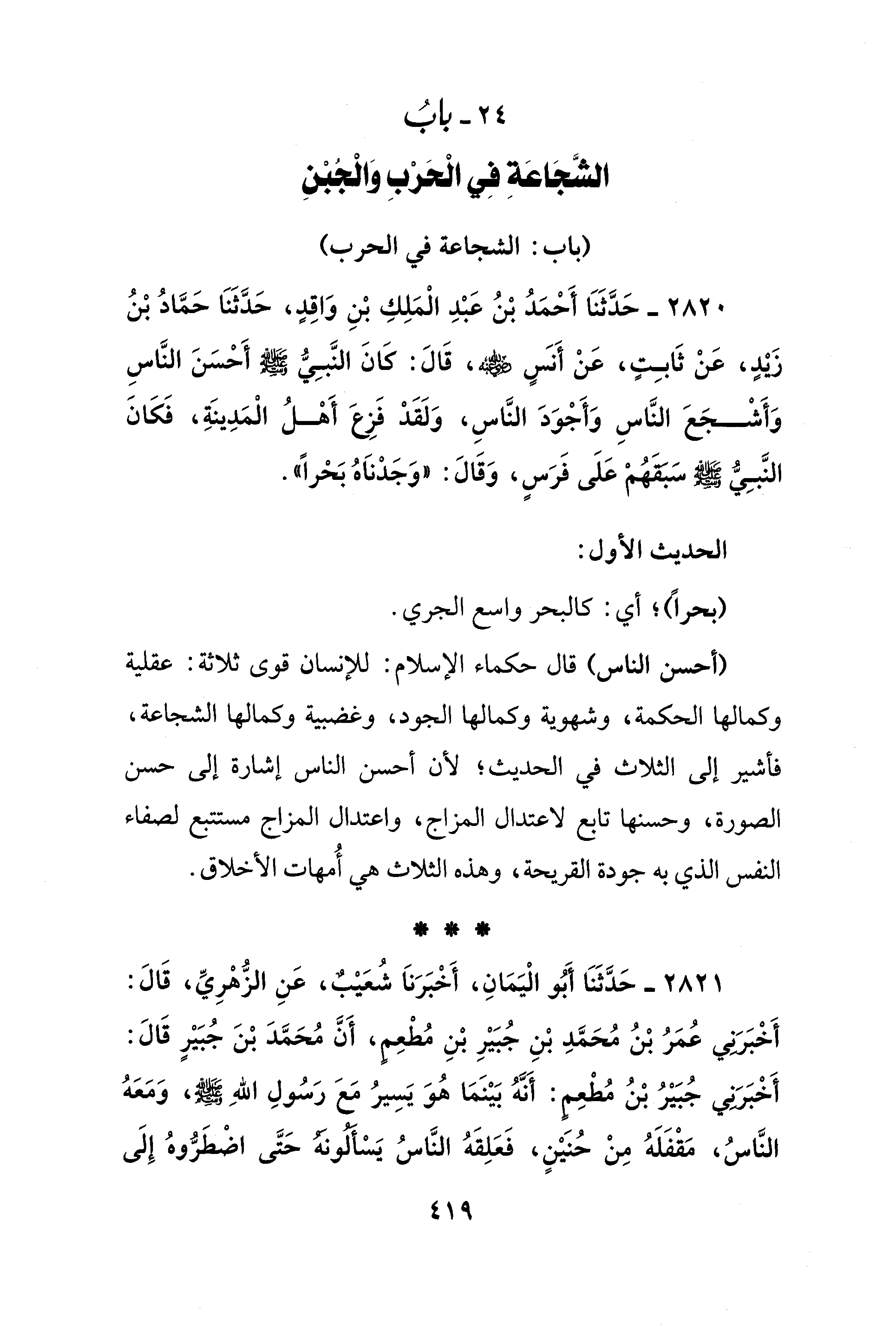 2820 - حَدَّثَنَا أَحْمَدُ بْنُ عَبْدِ الْمَلِكِ بْنِ وَاقِدٍ، حَدَّثَنَا حَمَّادُ بْنُ زيدٍ، عَنْ ثَابِتٍ، عَنْ أَنسٍ - رضي الله عنه -، قَالَ: كَانَ النَّبِيُّ - صلى الله عليه وسلم - أَحْسَنَ النَّاسِ وَأَشْجَعَ النَّاسِ وَأَجْوَدَ النَّاسِ، وَلَقَدْ فَزِعَ أَهْلُ الْمَدِينَةِ، فَكَانَ النَّبِيُّ - صلى الله عليه وسلم - سَبَقَهُمْ عَلَى فَرَسٍ، وَقَالَ: "وَجَدْناَهُ بَحْرًا".