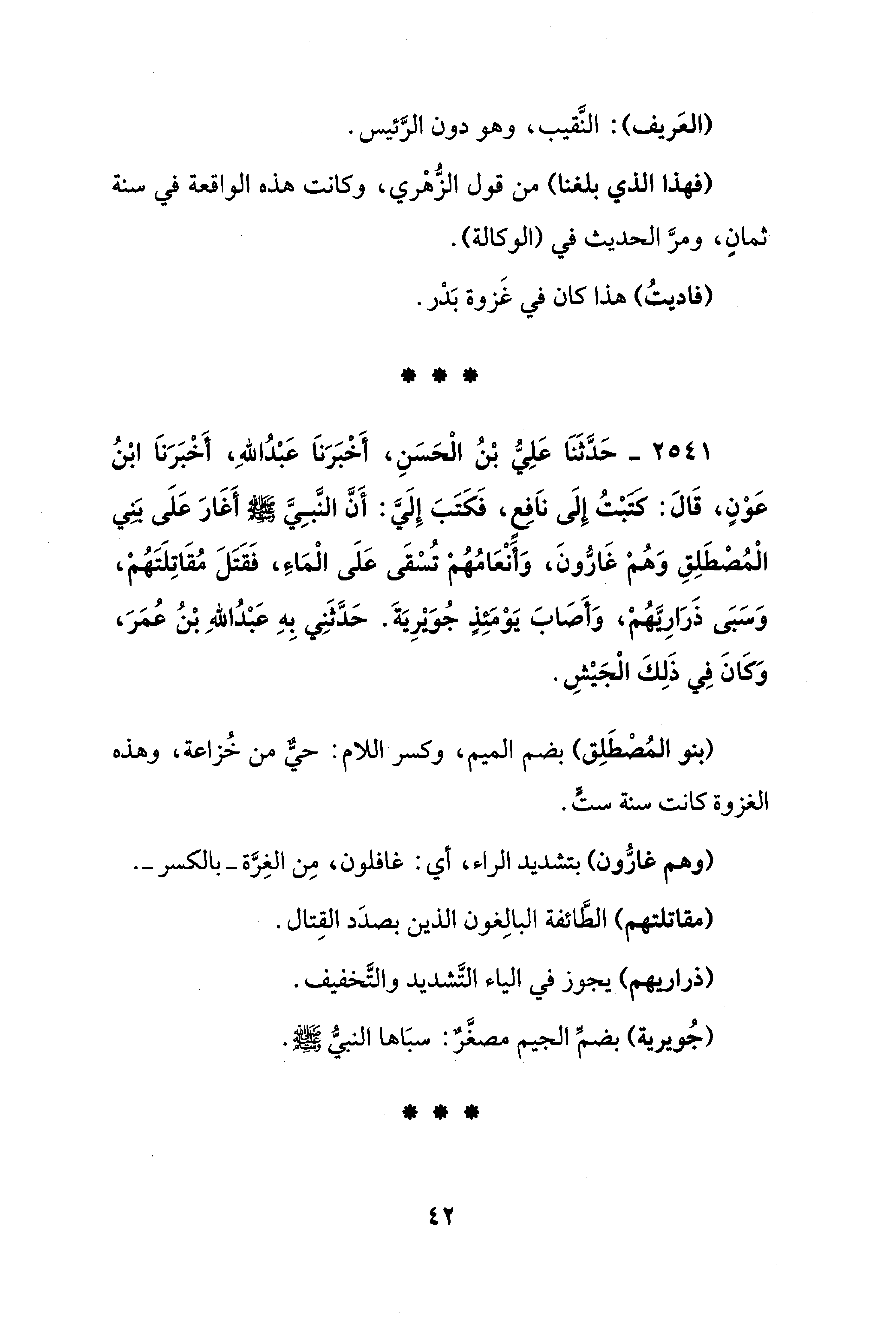 2541 - حَدَّثَنَا عَلِيُّ بْنُ الْحَسَنِ، أَخْبَرَنَا عَبْدُ اللهِ، أَخْبَرَنَا ابْنُ عَوْنٍ، قَالَ: كتَبْتُ إِلَى ناَفِعٍ، فَكَتَبَ إِلَيَّ: أَنَّ النَّبِيَّ - صلى الله عليه وسلم - أَغَارَ عَلَى بَنِي الْمُصْطَلِقِ وَهُمْ غَارُّونَ، وَأَنْعَامُهُمْ تُسْقَى عَلَى الْمَاءَ، فَقَتَلَ مُقَاتِلَتَهُمْ، وَسَبَى ذَرَارَّيهُمْ، وَأَصَابَ يَوْمَئِذٍ جُويرِيَةَ. حَدَّثَنِي بِهِ عَبْدُ اللهِ بْنُ عُمَرَ، وَكَانَ فِي ذَلِكَ الْجَيْشِ.