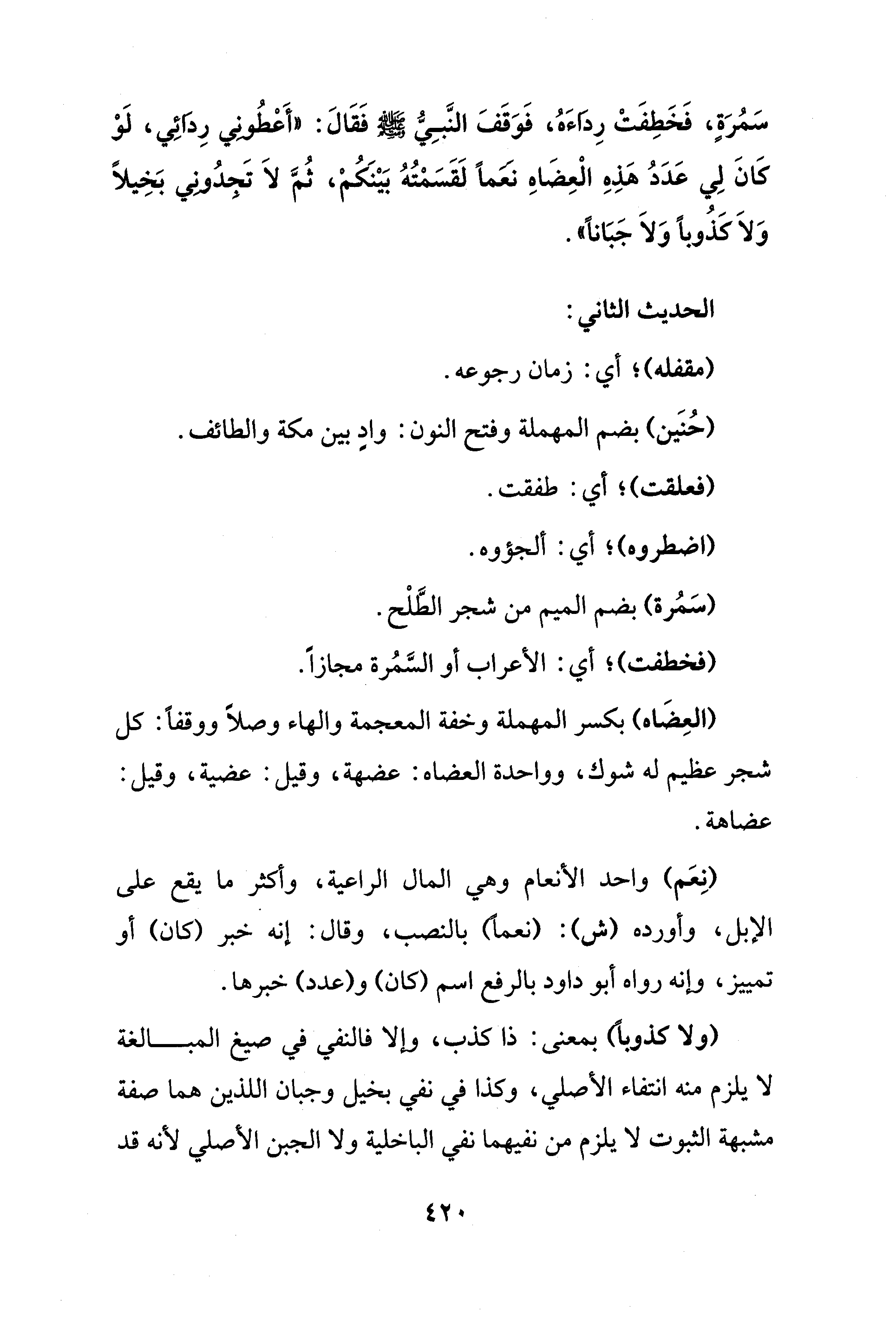 سَمُرَةٍ، فَخَطِفَتْ رِدَاءَهُ، فَوَقَفَ النَّبِيُّ - صلى الله عليه وسلم - فَقَالَ: "أَعْطُونِي رِدَائِي، لَوْ كَانَ لِي عَدَدُ هَذِهِ الْعِضَاهِ نعمًا لَقَسَمْتُهُ بَيْنَكُمْ، ثُمَّ لاَ تَجدُونِي بَخِيلًا وَلاَ كَذُوبًا وَلاَ جَبَانًا".