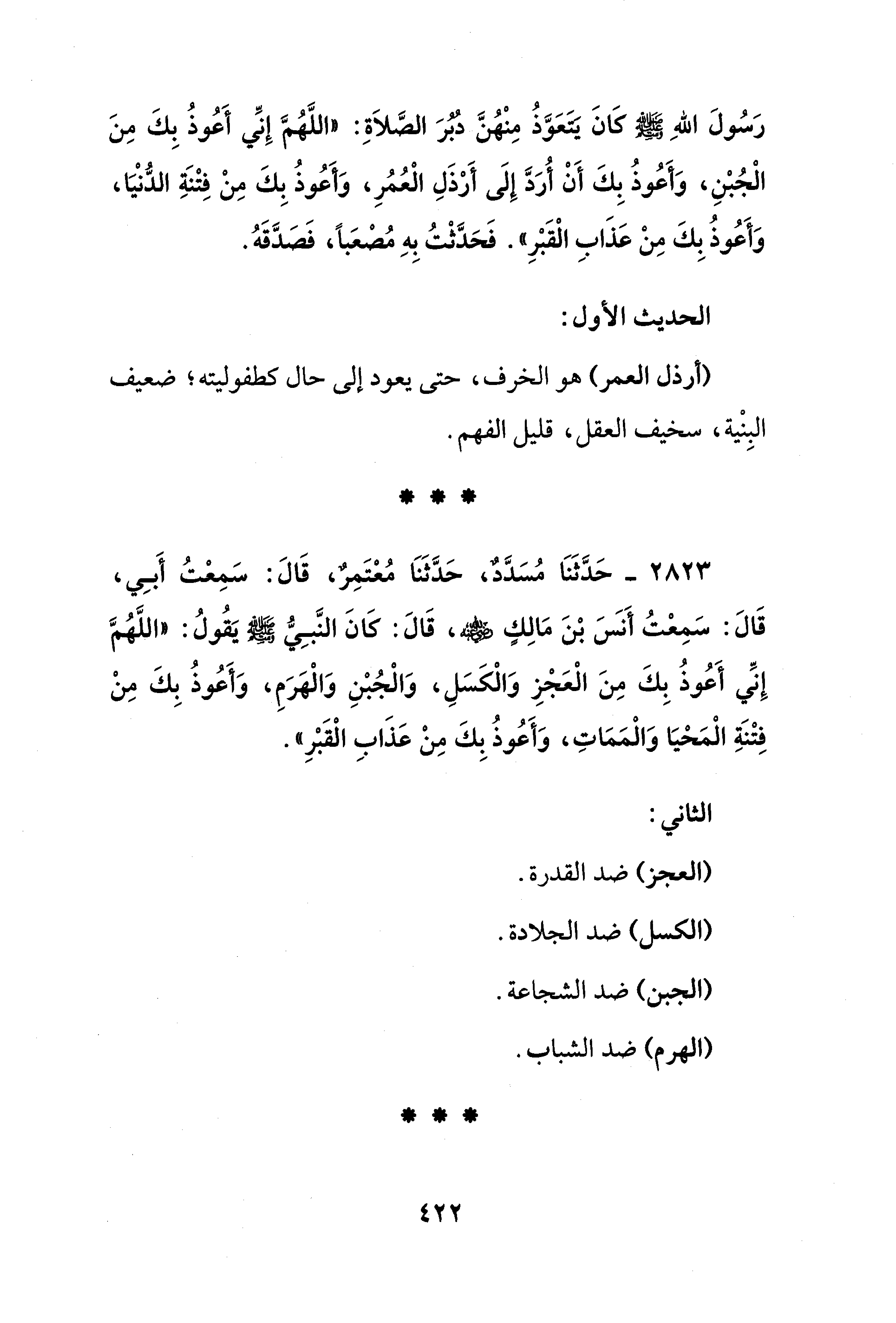 2823 - حَدَّثَنَا مُسَدَّدٌ، حَدَّثَنَا مُعْتَمِرٌ، قَالَ: سَمِعْتُ أَبِي، قَالَ: سَمِعْتُ أَنس بْنَ مَالِكٍ - رضي الله عنه -، قَالَ: كَانَ النَّبِيُّ - صلى الله عليه وسلم - يَقُولُ: "اللَّهُمَّ إِنِّي أَعُوذُ بِكَ مِنَ الْعَجْزِ وَالْكَسَلِ، وَالْجُبْنِ وَالْهَرَمِ، وَأَعُوذُ بِكَ مِنْ فِتْنَةِ الْمَحْيَا وَالْمَمَاتِ، وَأَعُوذُ بِكَ مِنْ عَذَابِ الْقَبْرِ".