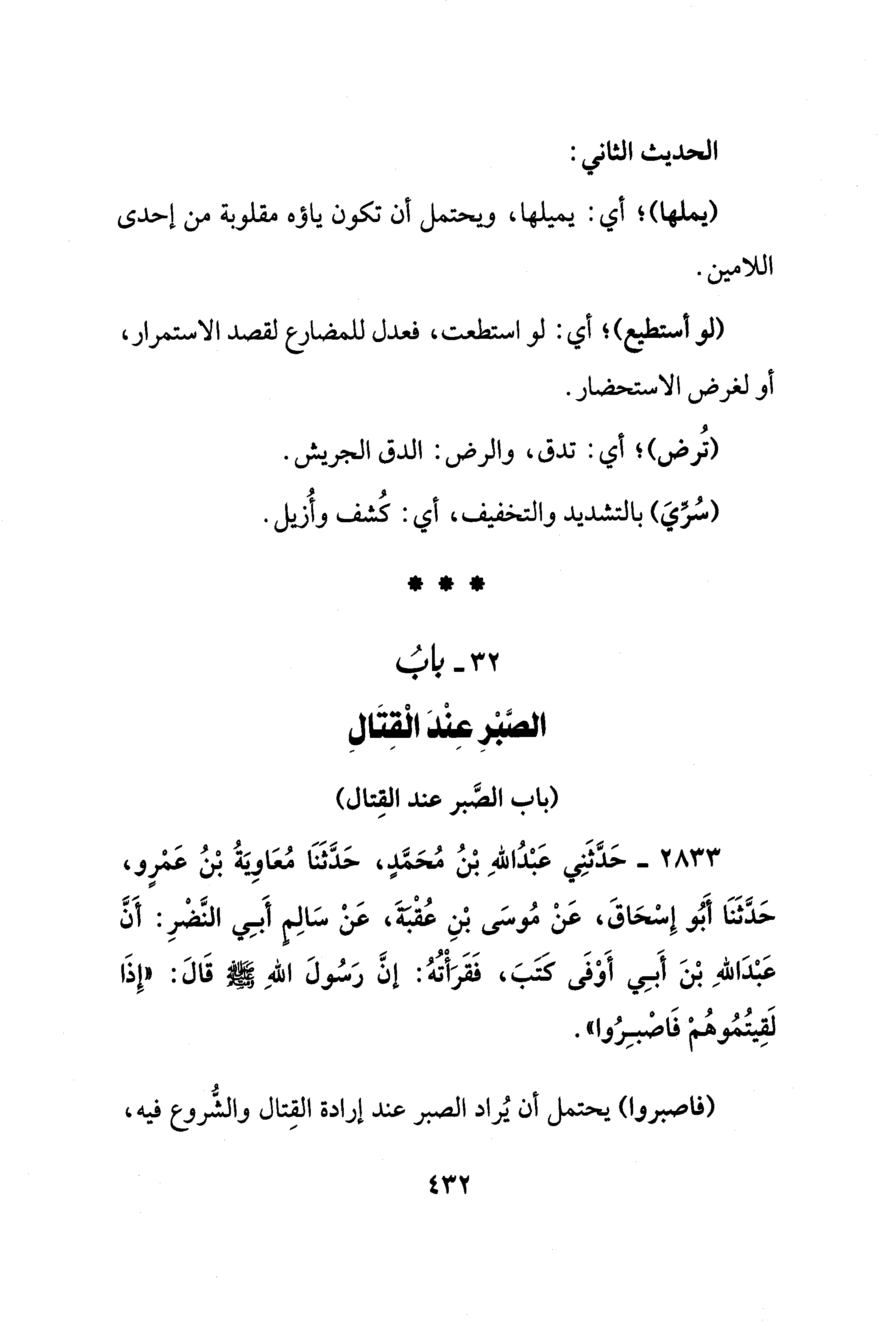 2833 - حَدَّثَنِي عَبْدُ اللهِ بْنُ مُحَمَّدٍ، حَدَّثَنَا مُعَاوِيَةُ بْنُ عَمْرٍو، حَدَّثَنَا أَبُو إِسْحَاقَ، عَنْ مُوسَى بْنِ عُقْبَةَ، عَنْ سَالِم أَبِي النَّضْرِ: أَنَّ عَبْدَ اللهِ بْنَ أَبِي أَوْفَى كتَبَ، فَقَرَأْتُهُ: إنَّ رَسُولَ اللهِ - صلى الله عليه وسلم - قَالَ: "إِذَا لَقِيتُمُوهُمْ فَاصْبِرُوا".
