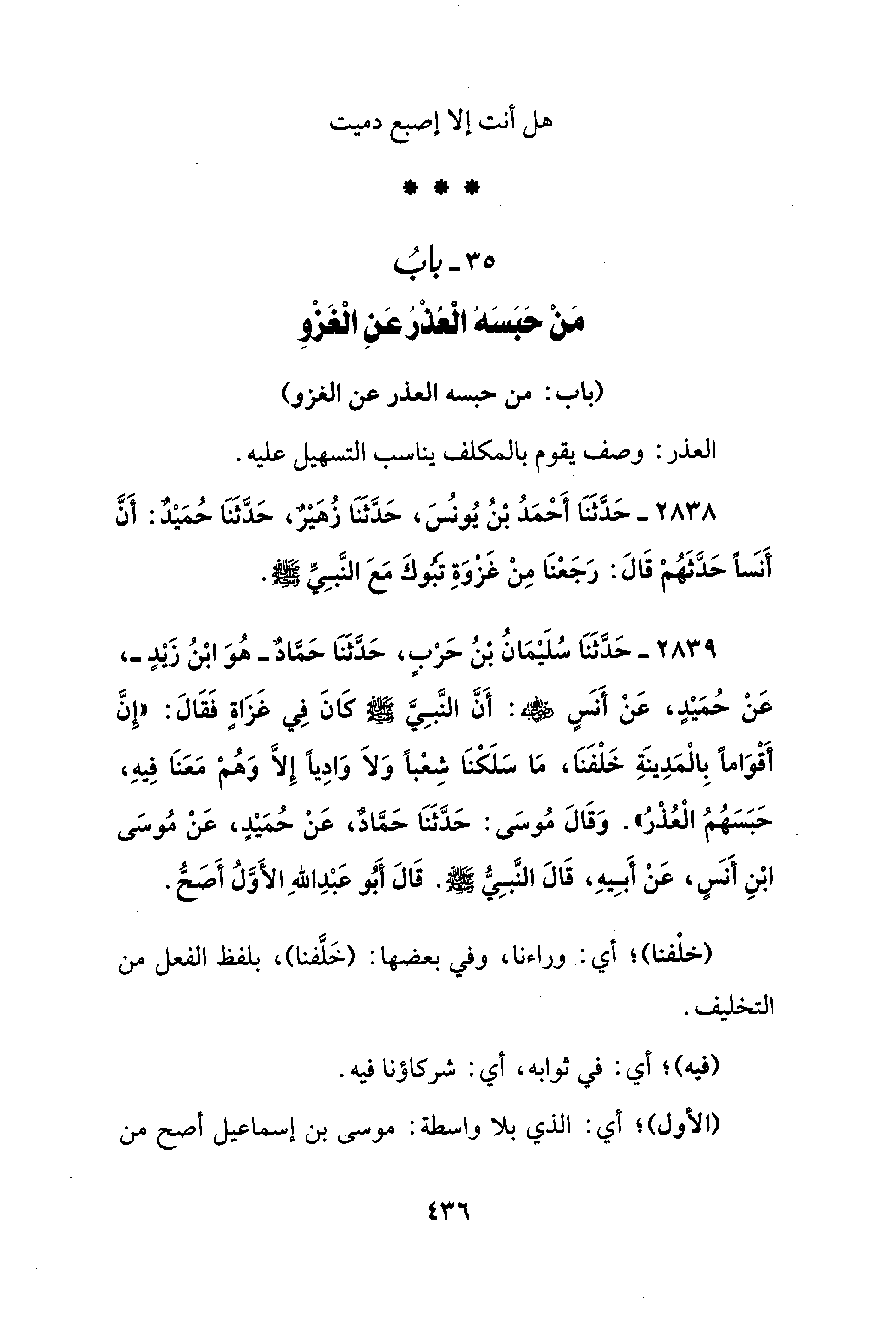 2839 - حَدَّثَنَا سُلَيْمَانُ بْنُ حَرْبٍ، حَدَّثَنَا حَمَّادٌ -هُوَ ابْنُ زَيْدٍ-، عَنْ حُمَيْدٍ، عَنْ أَنسٍ - رضي الله عنه -: أَنَّ النَّبِيَّ - صلى الله عليه وسلم - كَانَ فِي غَزَاةٍ فَقَالَ: "إِنَّ أَقْوَامًا بِالْمَدِينَةِ خَلْفَنَا، مَا سَلَكْنَا شِعْبًا وَلاَ وَادِيًا إِلَّا وَهُمْ مَعَنَا فِيهِ، حَبَسَهُمُ الْعُذْرُ". وَقَالَ مُوسَى: حَدَّثَنَا حَمَّادٌ، عَنْ حُمَيْدٍ، عَنْ مُوسَى ابْنِ أَنسٍ، عَنْ أَبِيهِ، قَالَ النَّبِيّ - صلى الله عليه وسلم -. قَالَ أَبُو عَبْدِ اللهِ الأَوَّلُ أَصَحُّ.