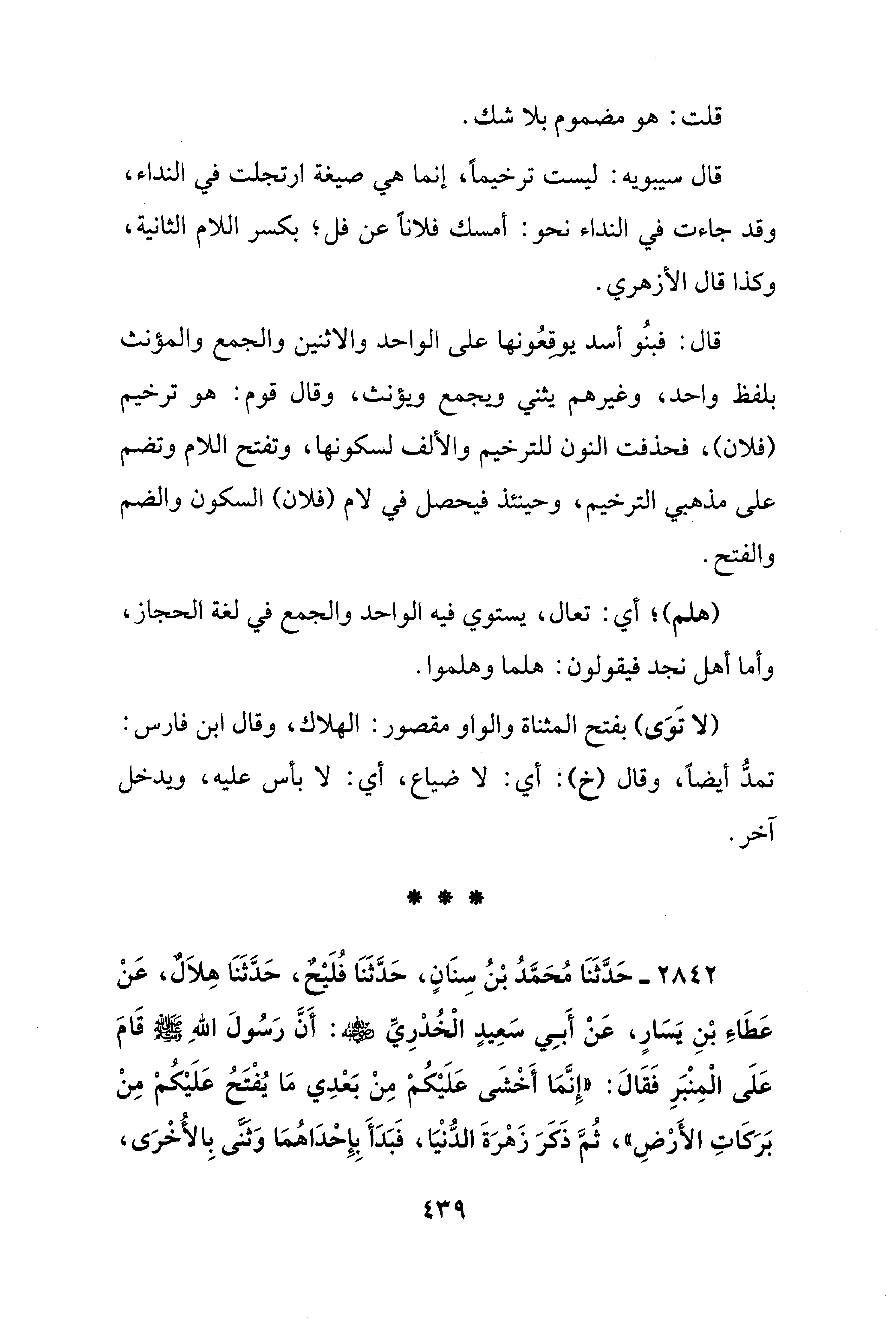 2842 - حَدَّثَنَا مُحَمَّدُ بْنُ سِنَانٍ، حَدَّثَنَا فُلَيْحٌ، حَدَّثَنَا هِلاَلٌ، عَنْ عَطَاءِ بْنِ يَسَارٍ، عَنْ أَبِي سَعِيدٍ الْخُدْرِيِّ - رضي الله عنه -: أَنَّ رَسُولَ اللهِ - صلى الله عليه وسلم - قَامَ عَلَى الْمِنْبَرِ فَقَالَ: "إِنَّمَا أَخْشَى عَلَيْكُمْ مِنْ بَعْدِي مَا يُفْتَحُ عَلَيْكُمْ مِنْ بَرَكَاتِ الأَرْضِ"، ثُمَّ ذَكَرَ زَهْرَةَ الدُّنْيَا، فَبَدَأَ بِإِحْدَاهُمَا وَثَنَّى بِالأُخْرَى،