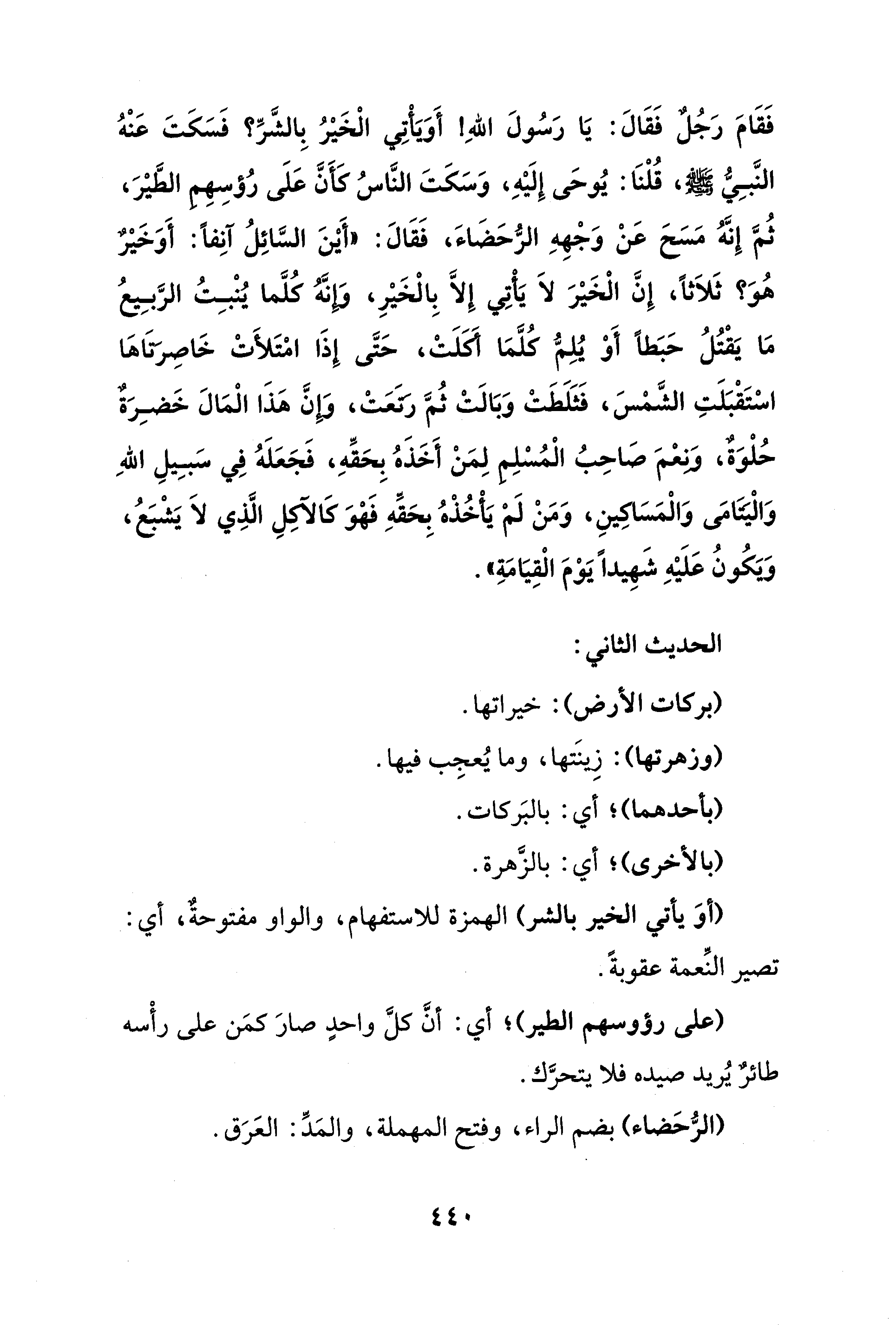 فَقَامَ رَجُلٌ فَقَالَ: يَا رَسُولَ اللهِ! أَوَيَأتِي الْخَيْرُ بِالشَّرِّ؟ فَسَكَتَ عَنْهُ النَّبِيُّ - صلى الله عليه وسلم -، قُلْنَا: يُوحَى إِلَيهِ، وَسَكَتَ النَّاسُ كَأَنَّ عَلَى رُؤسهِم الطَّيْرَ، ثُمَّ إِنَّهُ مَسَحَ عَنْ وَجْهِهِ الرُّحَضَاءَ، فَقَالَ: "أَيْنَ السَّائِلُ آنِفًا: أَوَ خَيْرٌ هُوَ؟ ثَلاَثًا، إِنَّ الْخَيْرَ لاَ يَأتِي إِلَّا بِالْخَيْرِ، وإنَّهُ كُلَّما يُنْبِتُ الرَّبِيعُ مَا يَقْتُلُ حَبَطًا أَوْ يُلِمُّ كُلَّمَا أَكَلَتْ، حَتَّى إِذَا امْتَلأَتْ خَاصِرَتَاهَا اسْتَقْبَلَتِ الشَّمْسَ، فَثَلَطَتْ وَبَالَتْ ثُمَّ رَتَعَتْ، وإنَّ هَذَا الْمَالَ خَضِرَةٌ حُلْوَةٌ، وَنِعْمَ صَاحِبُ الْمُسْلِم لِمَنْ أَخَذَهُ بِحَقِّهِ، فَجَعَلَهُ فِي سَبِيلِ اللهِ وَالْيتَامَى وَالْمَسَاكِينِ، وَمَنْ لَمْ يَأخُذْهُ بِحَقِّهِ فَهْوَ كَالآكِلِ الَّذِي لاَ يَشْبَعُ، وَيَكُونُ عَلَيْهِ شَهِيدًا يَوْمَ الْقِيَامَةِ".