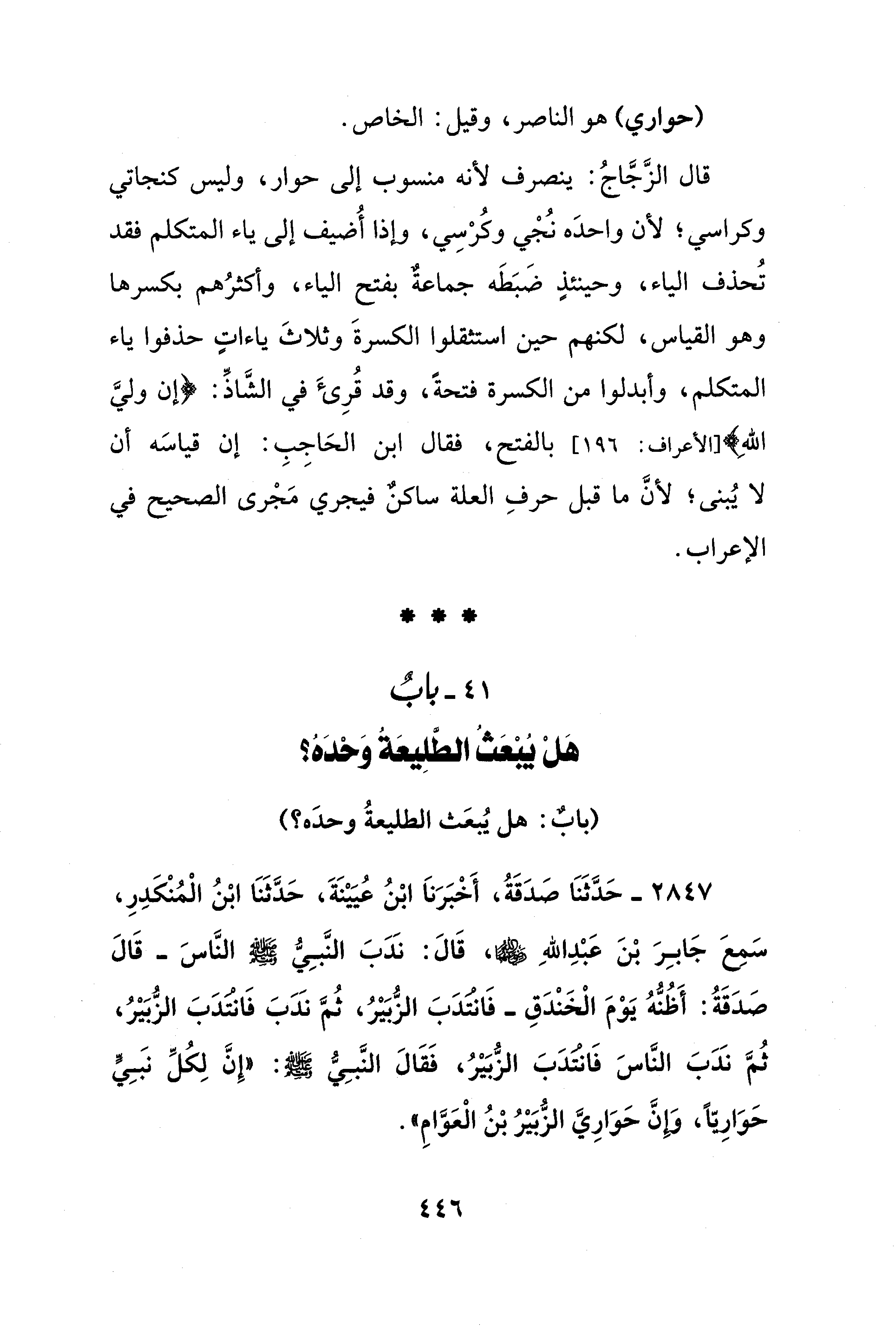 قال الزَّجَّاجُ: ينصرف لأنه منسوب إلى حوار، وليس كنجاتي وكراسي؛ لأن واحدَه نُجْي وكُرْسِي، وإذا أُضيف إلى ياء المتكلم فقد تُحذف الياء، وحينئذٍ ضَبَطَه جماعةٌ بفتح الياء، وأكثرُهم بكسرها وهو القياس، لكنهم حين استثقلوا الكسرةَ وثلاثَ ياءاتٍ حذفوا ياء المتكلم، وأبدلوا من الكسرة فتحة، وقد قُرِئَ في الشَّاذِّ: {إِنَّ وَليَّ اللَّهِ} [الأعراف: 196] بالفتح، فقال ابن الحَاجِبِ: إن قياسَه أن لا يُبنى؛ لأنَّ ما قبل حرفِ العلة ساكنٌ فيجري مَجْرى الصحيح في الإعراب.