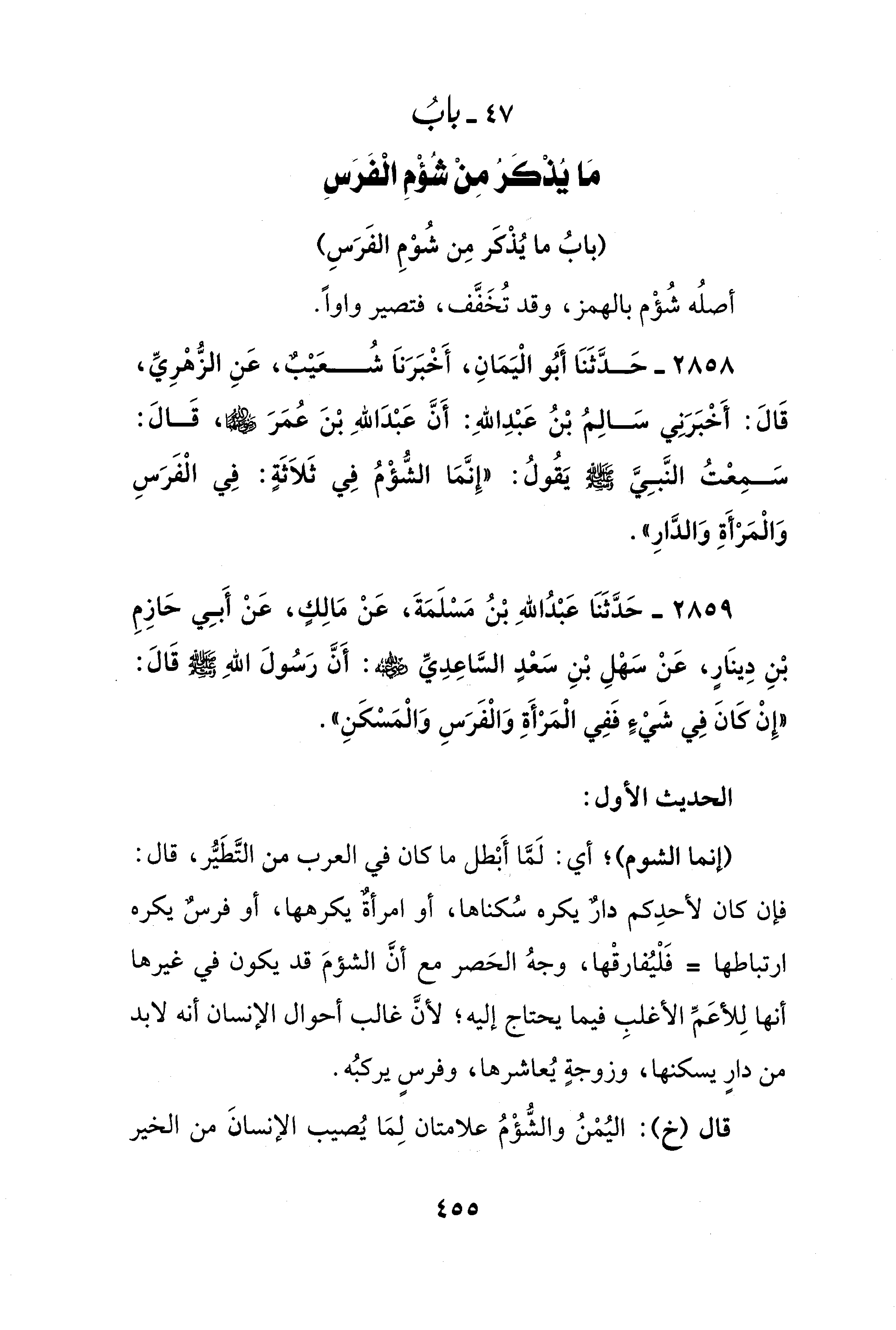 2858 - حَدَّثَنَا أَبُو الْيَمَانِ، أَخْبَرَنَا شُعَيْبٌ، عَنِ الزُّهْرِيِّ، قَالَ: أَخْبَرَني سَالِمُ بْنُ عَبْدِ اللهِ: أَنَّ عَبْدَ اللهِ بْنَ عُمَرَ - رضي الله عنهما -، قَالَ: سَمِعْتُ النَّبِيَّ - صلى الله عليه وسلم - يَقُولُ: "إِنَّمَا الشُّؤْمُ فِي ثَلاَثَةٍ: فِي الْفَرَسِ وَالْمَرْأَةِ وَالدَّارِ".
